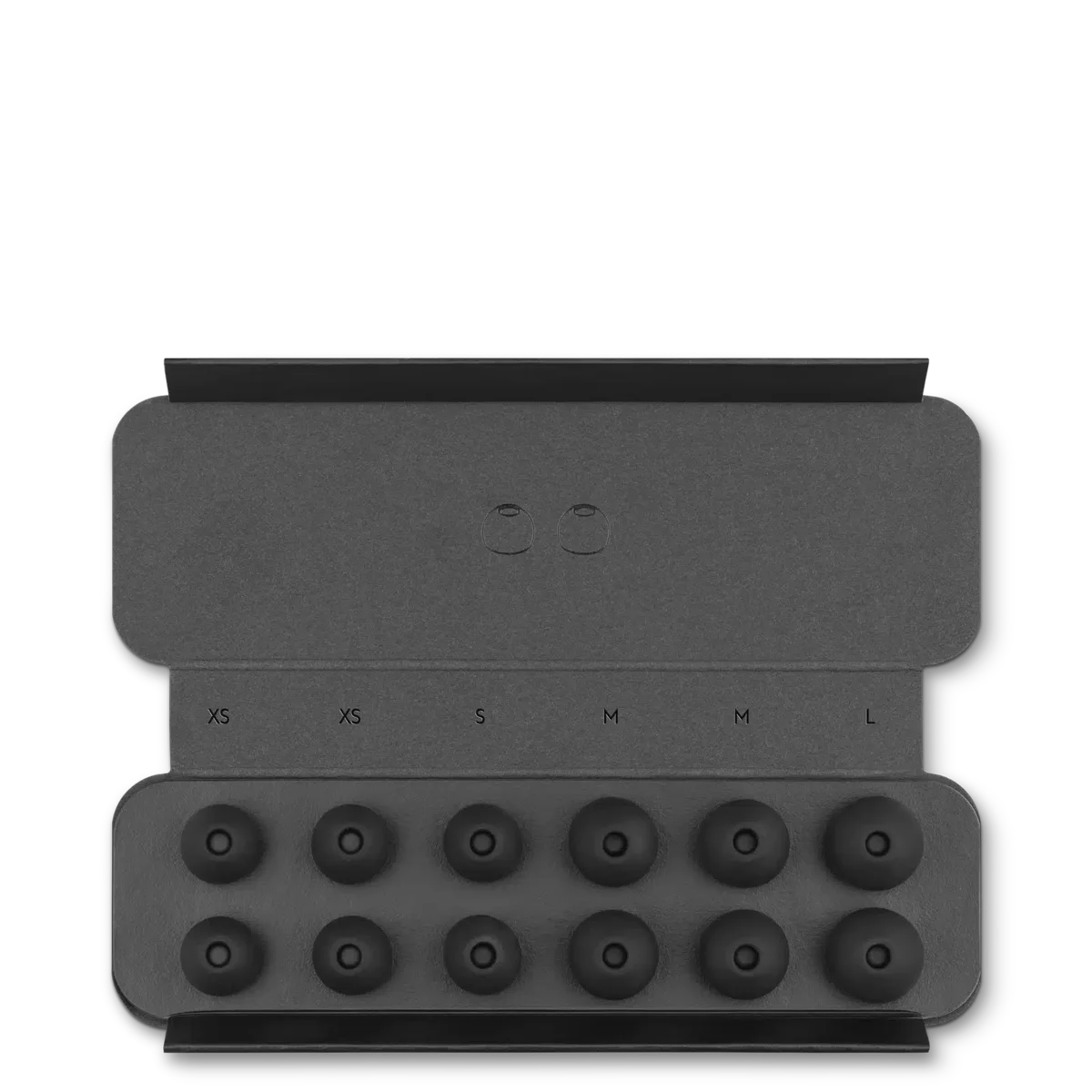 Set med 6 par silikonöronsnäckor i olika storlekar (XS, S, M, L).