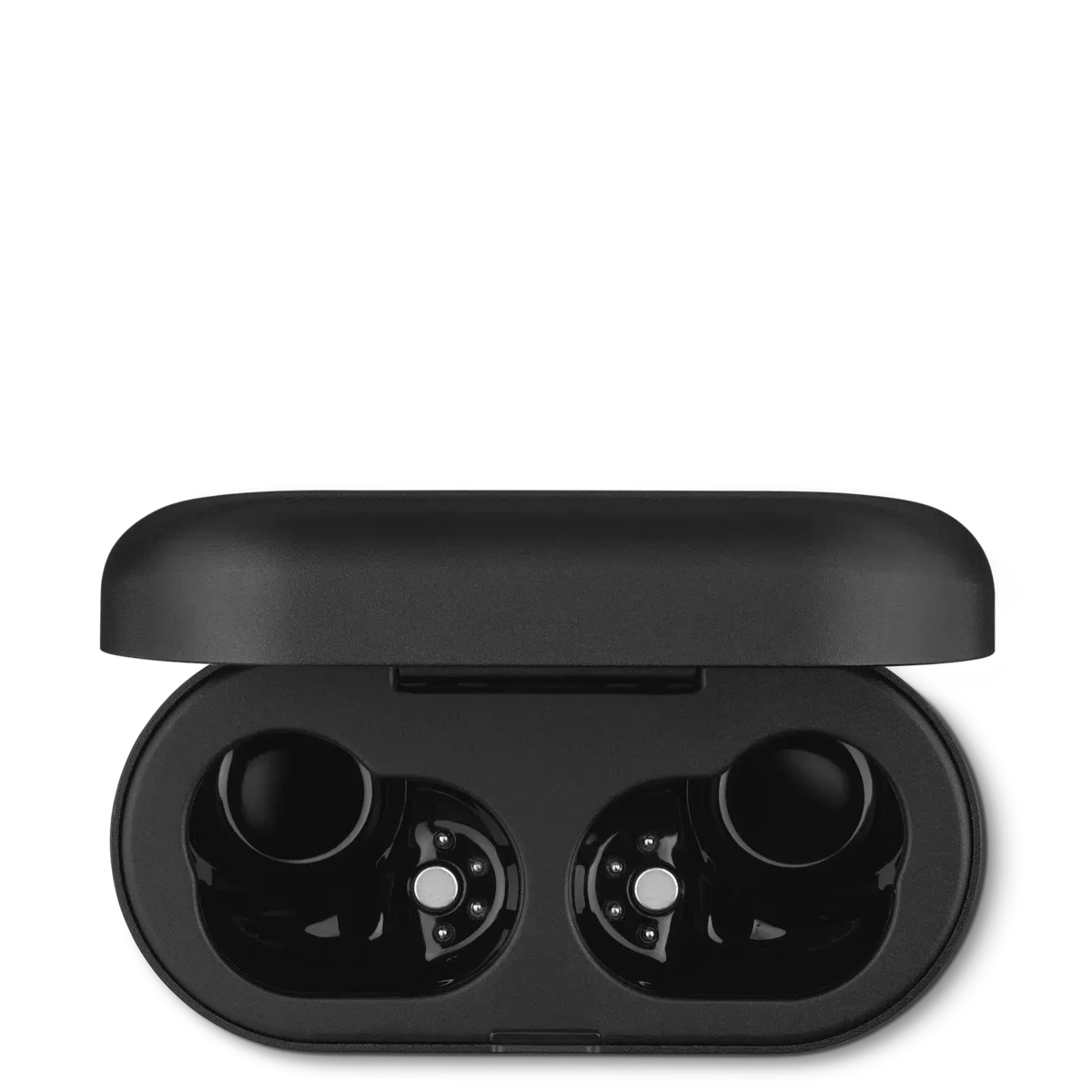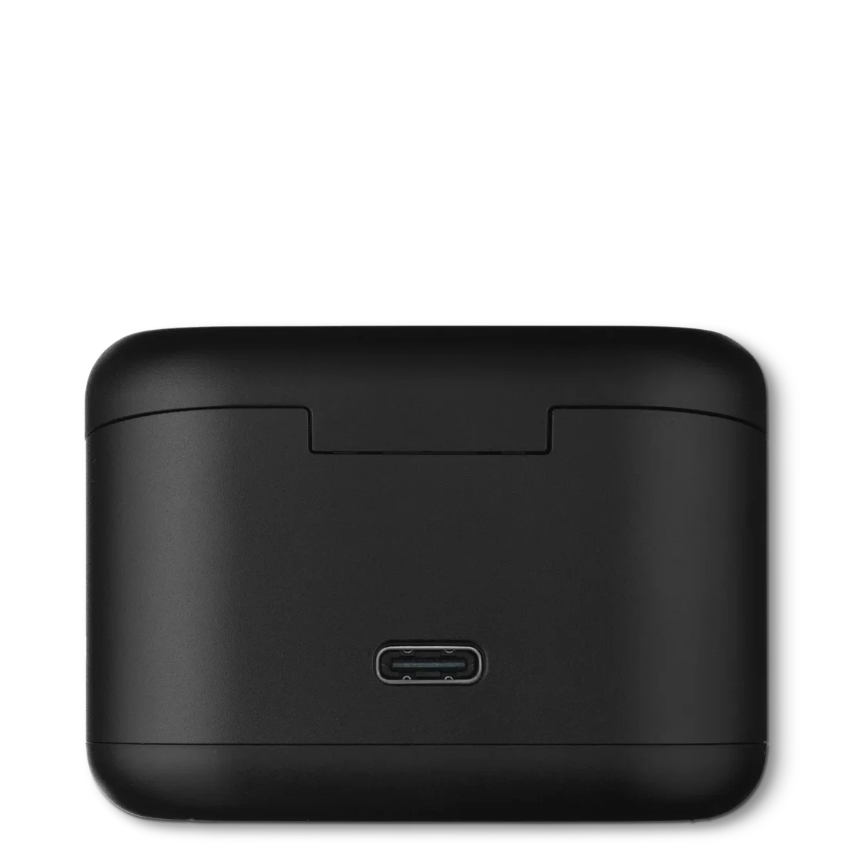 Svart laddningsfodral för Montblanc MTB 03 In-Ear-hörlurar. Fodralet är kompatibelt med trådlös laddning.