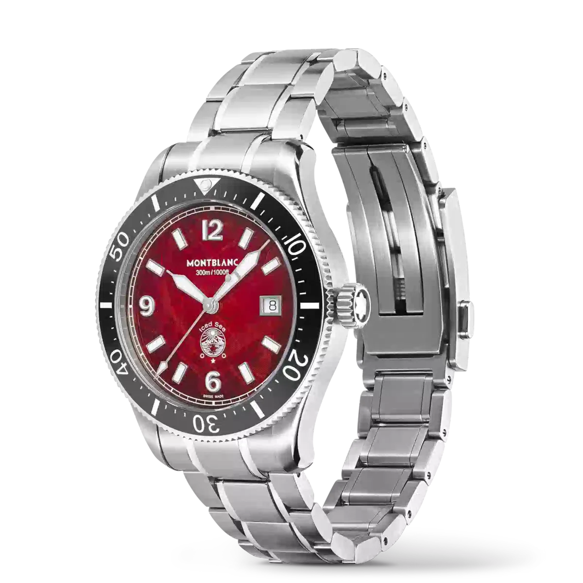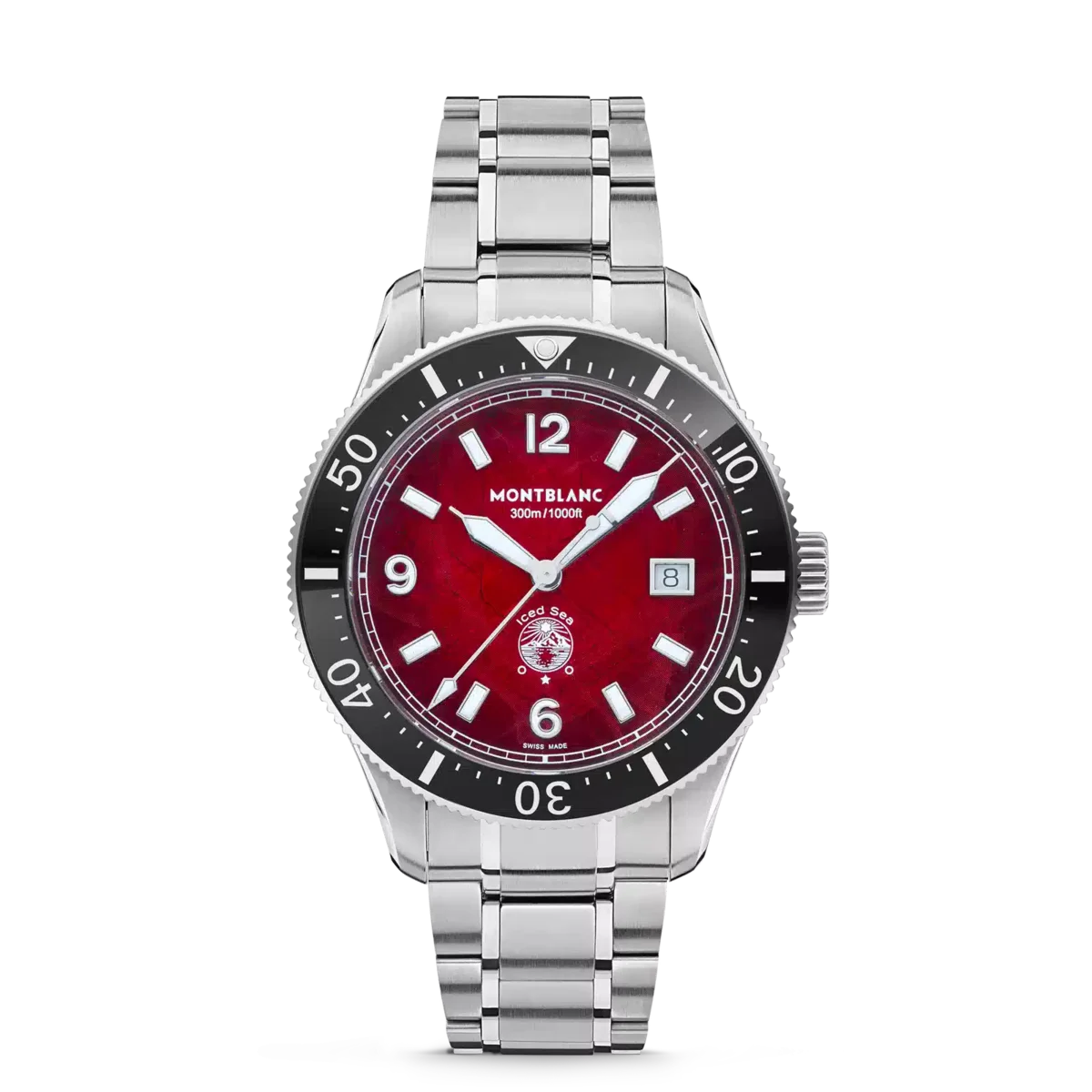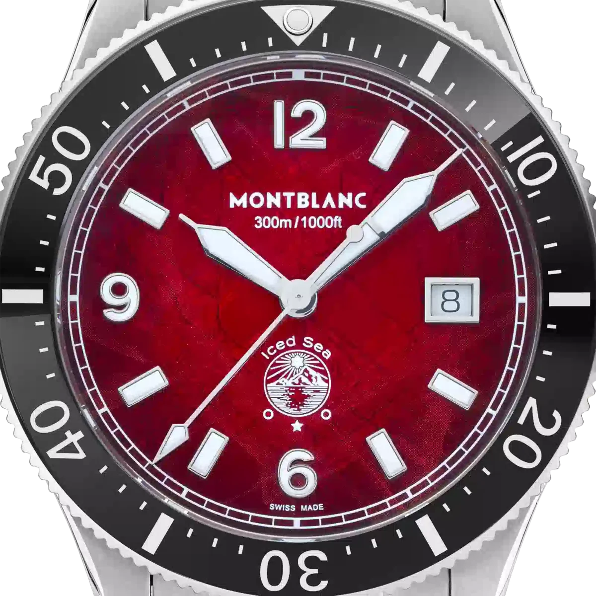 Montblanc Iced Sea Automatic Date med burgundyfärgad urtavla med glaciärmönster påminner om den djupa röda färgen på kvällssolen när den träffar glaciären. Urtavlan med glaciärmönster är inspirerad av Mer de Glace – Ishavet – den största glaciären i Mont Blanc-massivet. Dess struktur har åstadkommits med hjälp av en nästan bortglömd gammal teknik som kallas gratté-boisé. Klockan har en svart keramisk bezel som endast kan vridas i en riktning, en 3D-gravyr på boettens baksida och ett utbytbart armband i rostfritt stål med finjusteringssystem. Klockan uppfyller ISO 6425-normen för dykning och har en vattentäthet på 300 meter. Identifikationsnummer: MB132291