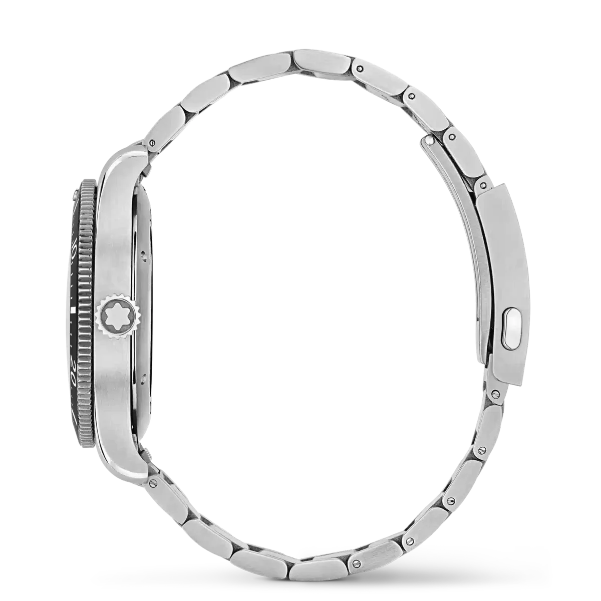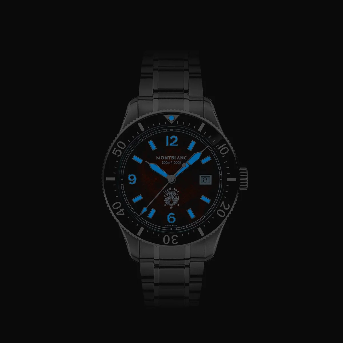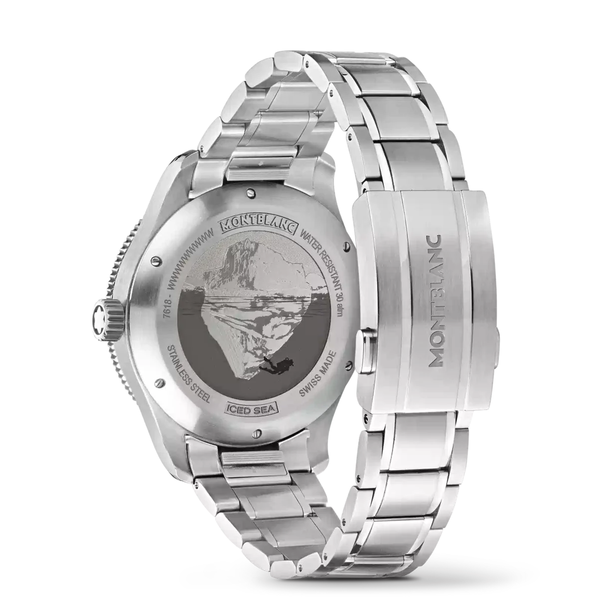 Montblanc Iced Sea Automatic Date med burgundyfärgad urtavla med glaciärmönster påminner om den djupa röda färgen på kvällssolen när den träffar glaciären. Urtavlan med glaciärmönster är inspirerad av Mer de Glace – Ishavet – den största glaciären i Mont Blanc-massivet. Dess struktur har åstadkommits med hjälp av en nästan bortglömd gammal teknik som kallas gratté-boisé. Klockan har en svart keramisk bezel som endast kan vridas i en riktning, en 3D-gravyr på boettens baksida och ett utbytbart armband i rostfritt stål med finjusteringssystem. Klockan uppfyller ISO 6425-normen för dykning och har en vattentäthet på 300 meter. Identifikationsnummer: MB132291