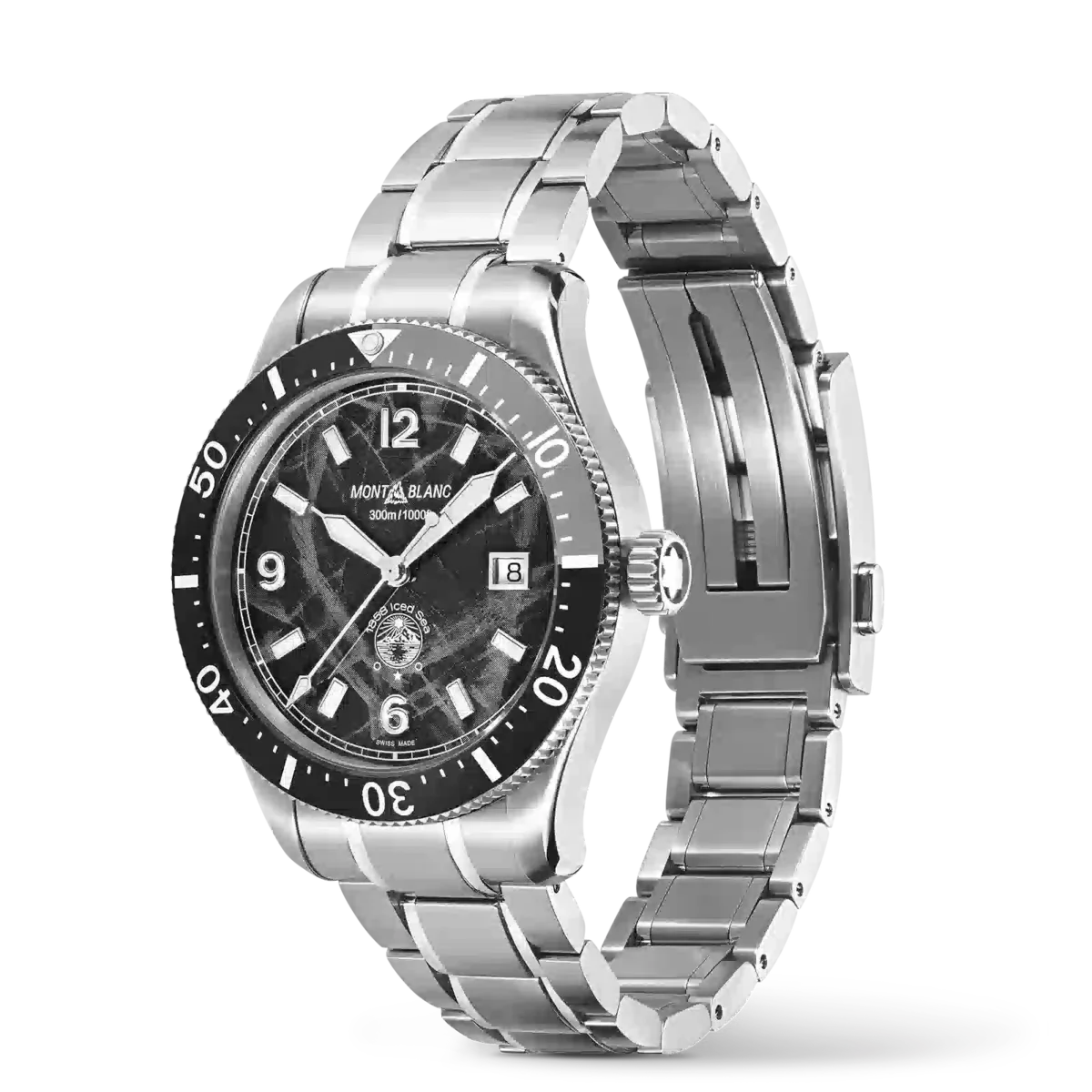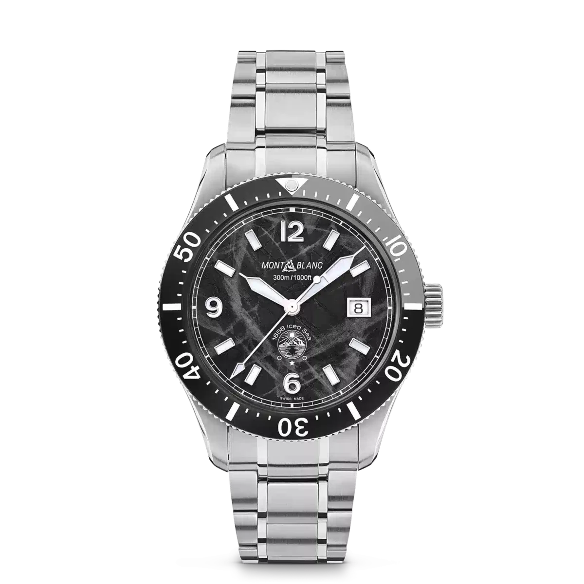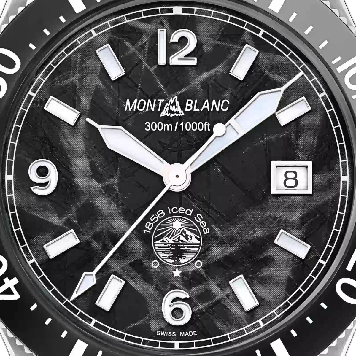 Montblanc Iced Sea Automatic Date är Montblancs första sportdykarklocka och har en urtavla med glaciärmönster som ger intrycket av att man tittar in i djupet av en glaciär. Den svarta urtavlan med glaciärmönster är inspirerad av Mer de Glace – Ishavet – den största glaciären i Mont Blanc-massivet. Dess struktur har skapats med hjälp av en nästan bortglömd gammal teknik som kallas gratté-boisé. Klockan har ett 41 mm rostfritt stålboett och levereras med en enkelriktad tvåfärgad keramikring, en graverad boettbaksida och ett avsmalnande utbytbart armband i rostfritt stål med finjustering för precisionspassning. Klockan uppfyller ISO 6425-normen för dykarklockor och är vattentät till 300 meter. Identifikationsnummer MB129371