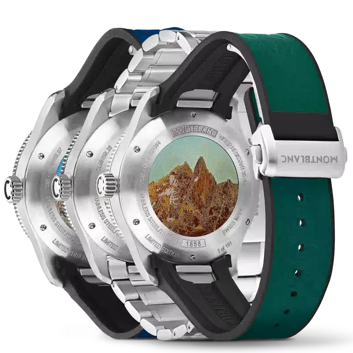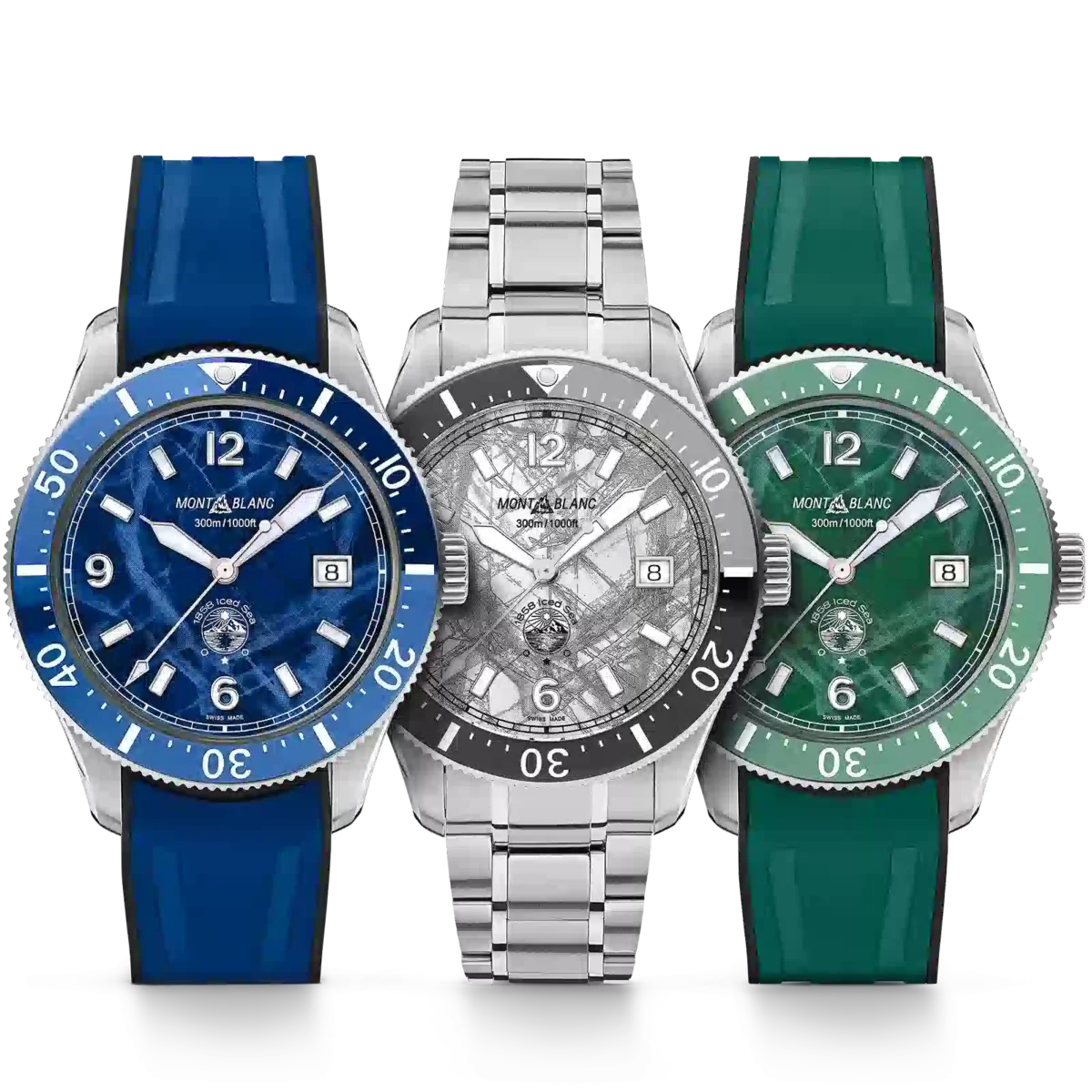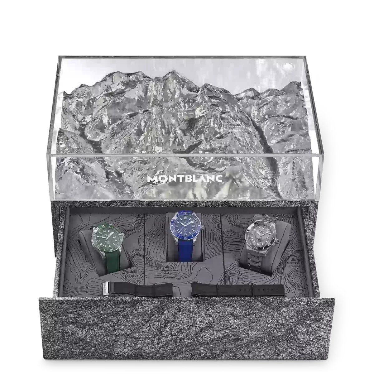 Montblanc Iced Sea Automatic Date Coffret innehåller tre Iced Sea-utgåvor i blått, grönt och grått. Varje modell skiljer sig från standardutgåvorna genom att den har en färgad lasergravering av bergen i Mont Blanc-massivet. Alla tre klockorna levereras i en dekorativ presentask med en granitliknande bas som symboliserar berget Mont Blanc och ett lock i Plexiglas® med lasergravering som visar reliefen av Mont Blanc-massivet inuti. Koffret levereras tillsammans med ett armband i rostfritt stål och tre olika utbytbara färgade gummiband. Denna begränsade upplaga på 191 exemplar finns exklusivt i Montblanc-butikerna. Identifikationsnummer MB131326
