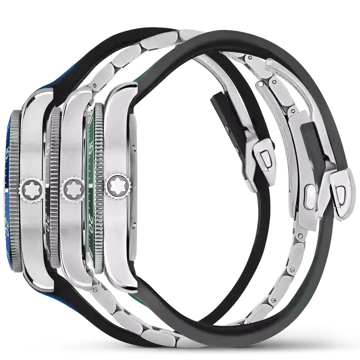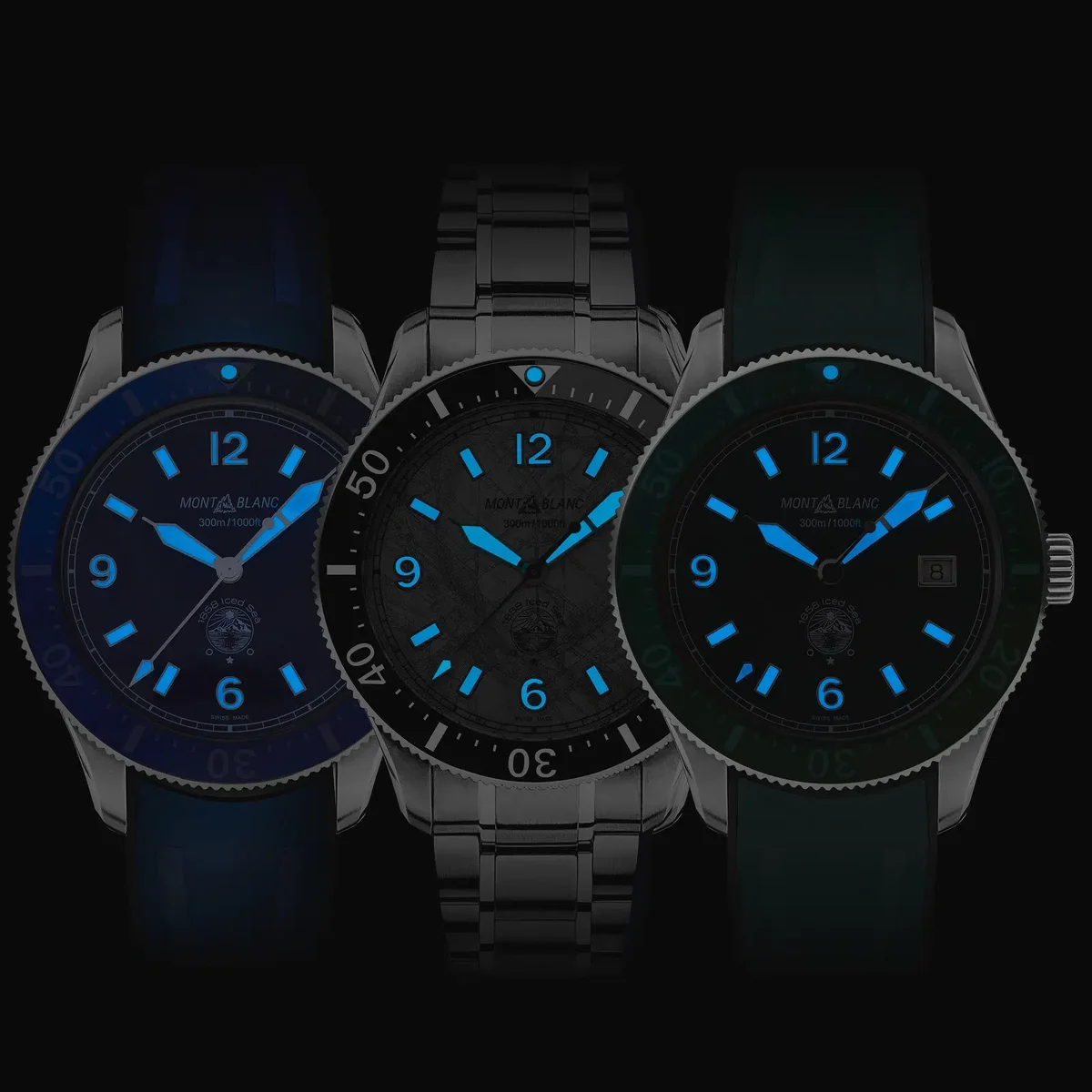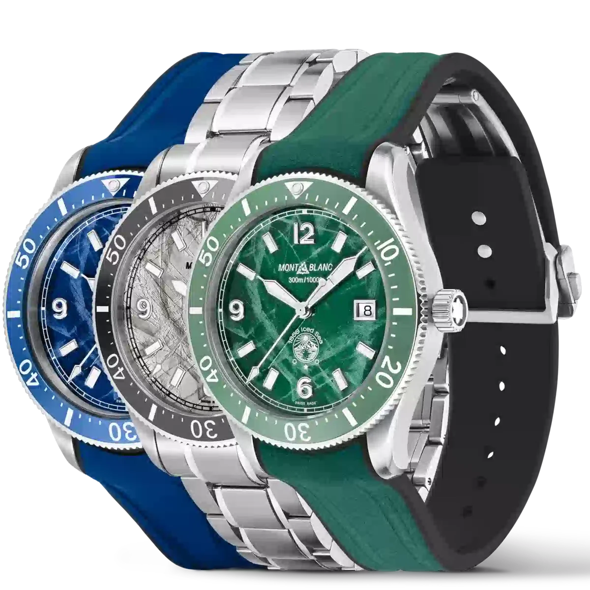 Montblanc Iced Sea Automatic Date Coffret innehåller tre Iced Sea-utgåvor i blått, grönt och grått. Varje modell skiljer sig från standardutgåvorna genom att den har en färgad lasergravering av bergen i Mont Blanc-massivet. Alla tre klockorna levereras i en dekorativ presentask med en granitliknande bas som symboliserar berget Mont Blanc och ett lock i Plexiglas® med lasergravering som visar reliefen av Mont Blanc-massivet inuti. Koffret levereras tillsammans med ett armband i rostfritt stål och tre olika utbytbara färgade gummiband. Denna begränsade upplaga på 191 exemplar finns exklusivt i Montblanc-butikerna. Identifikationsnummer MB131326
