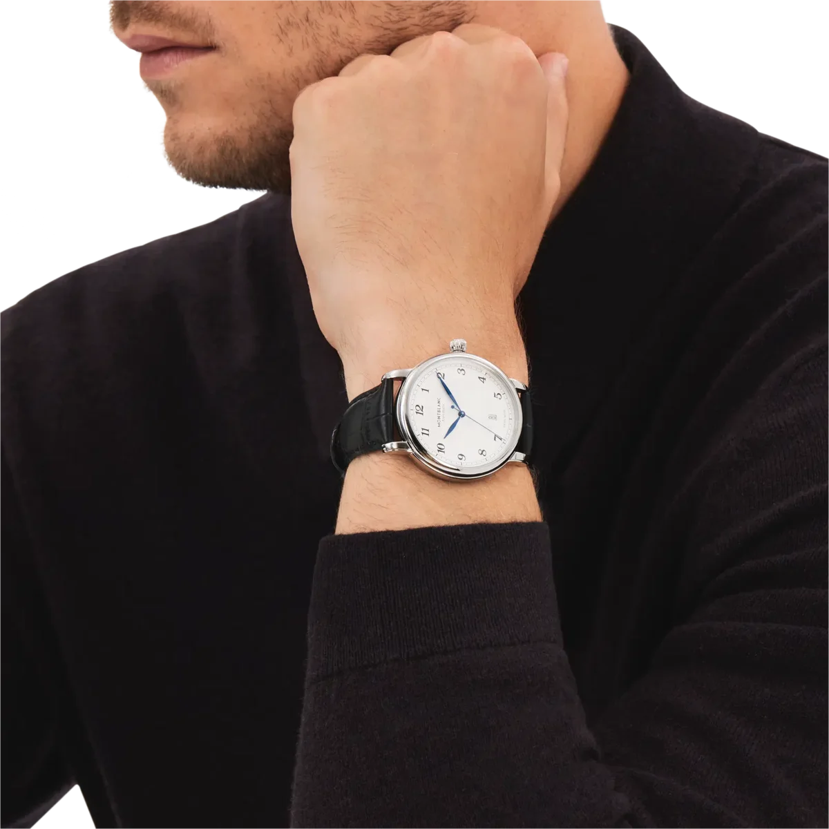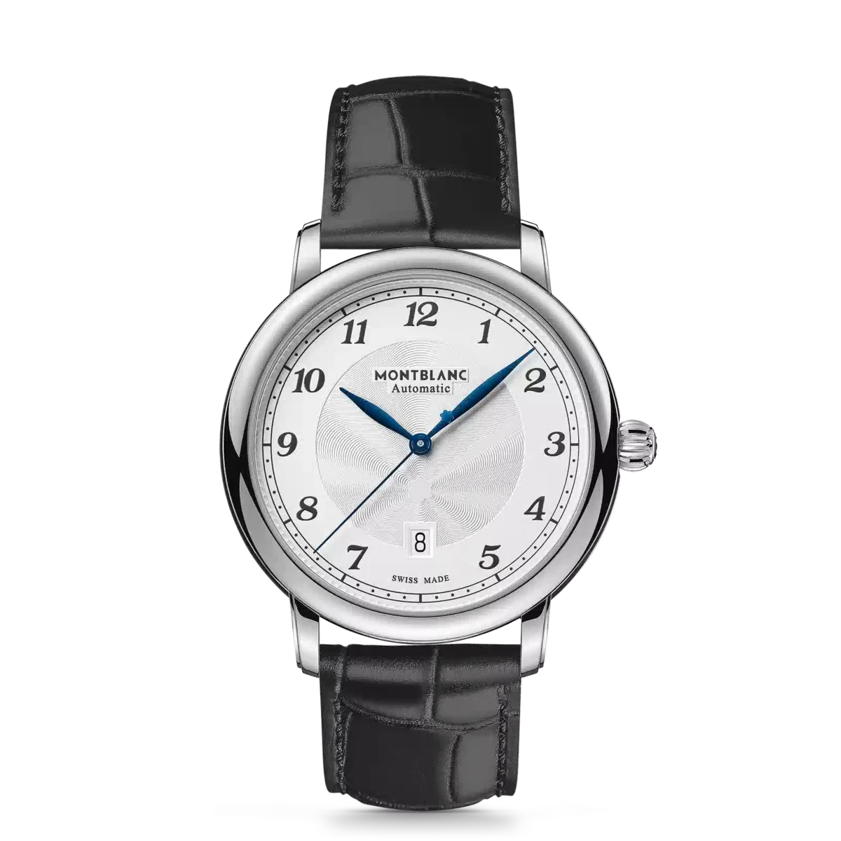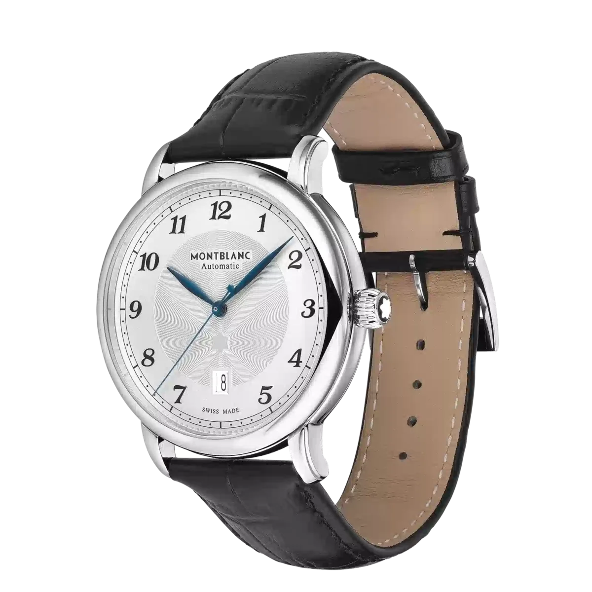 Montblanc Star Legacy-kollektionen är inspirerad av Minervas arv och företagets fickur som tillverkades under slutet av 1800-talet och början av 1900-talet.I linje med produktlinjens designkoder har Montblanc Star Legacy Automatic Date en raffinerad silvervit urtavla med Montblancs exploderande stjärnguillochémönster, arabiska siffror, bladformade visare, ett ”filet sauté”-guillochémotiv och en järnvägsspåret. Klockan är utrustad med det automatiska kaliber MB 24.17 och har timmar, minuter och sekunder i mitten och datum i en öppning vid klockan sex. Den levereras i ett 42 mm rostfritt stålboett och är försedd med ett svart kalvskinnsarmband med alligatorprint.