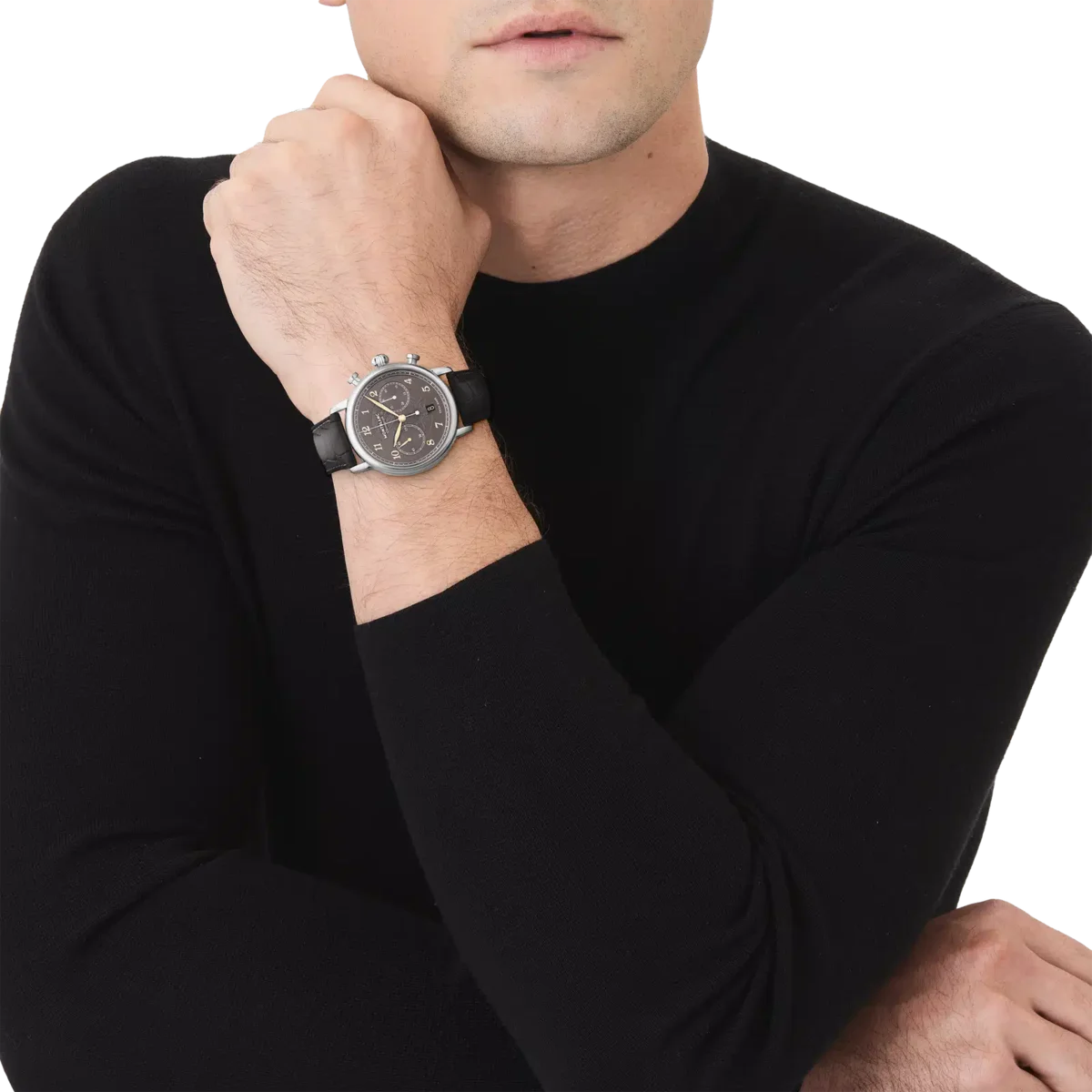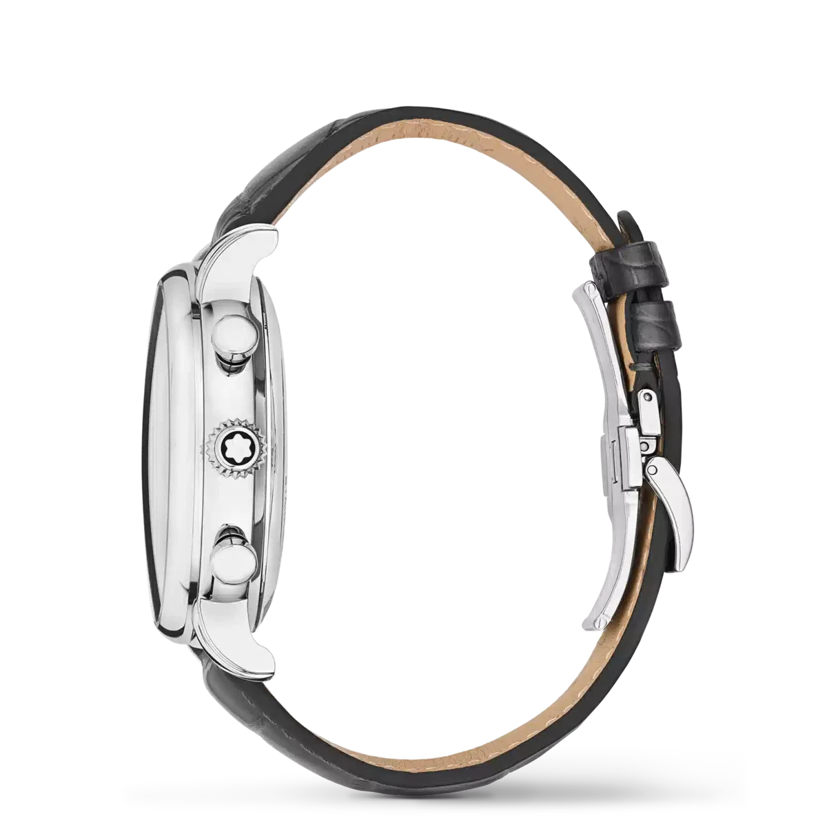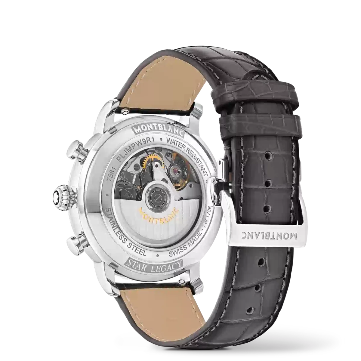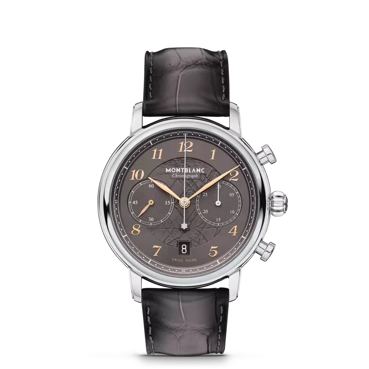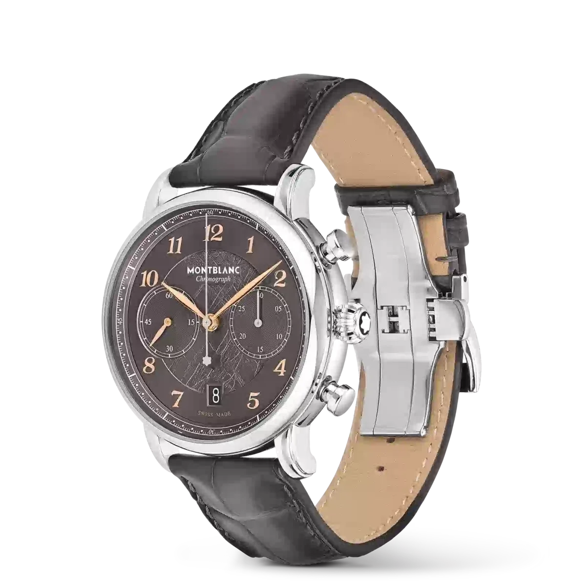 Montblanc Star Legacy Chronograph Limited Edition i 1786 exemplar har ett 42 mm rostfritt stålboett som lyfter fram en ny sida av Mont Blanc – dess södervända klippiga sida. Klockan har två kronografräknare vid klockan tre och nio för ett elegant utseende och god läsbarhet. Det grå glaciärmönstret syns i bakgrunden, medan filet sauté har ersatts med en inre fläns för att ge volym åt urtavlan. Tidsfunktionerna visas med roséguldbelagda, bladformade visare, medan kronografindikeringarna använder rodiumbelagda ”baton”-visare. Klockan levereras med ett utbytbart grått kalvskinnsarmband med alligatorprint. Identifikationsnummer MB130960 Lugbredd 21 mm