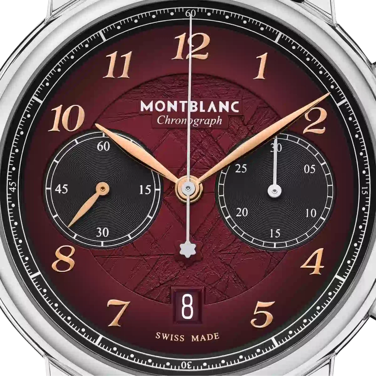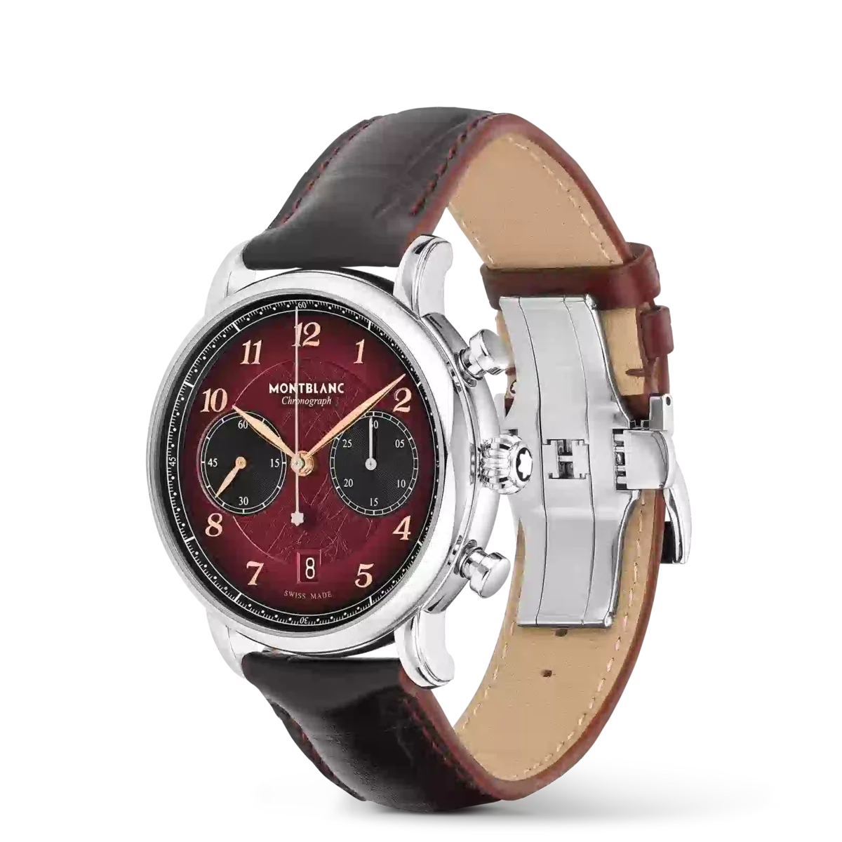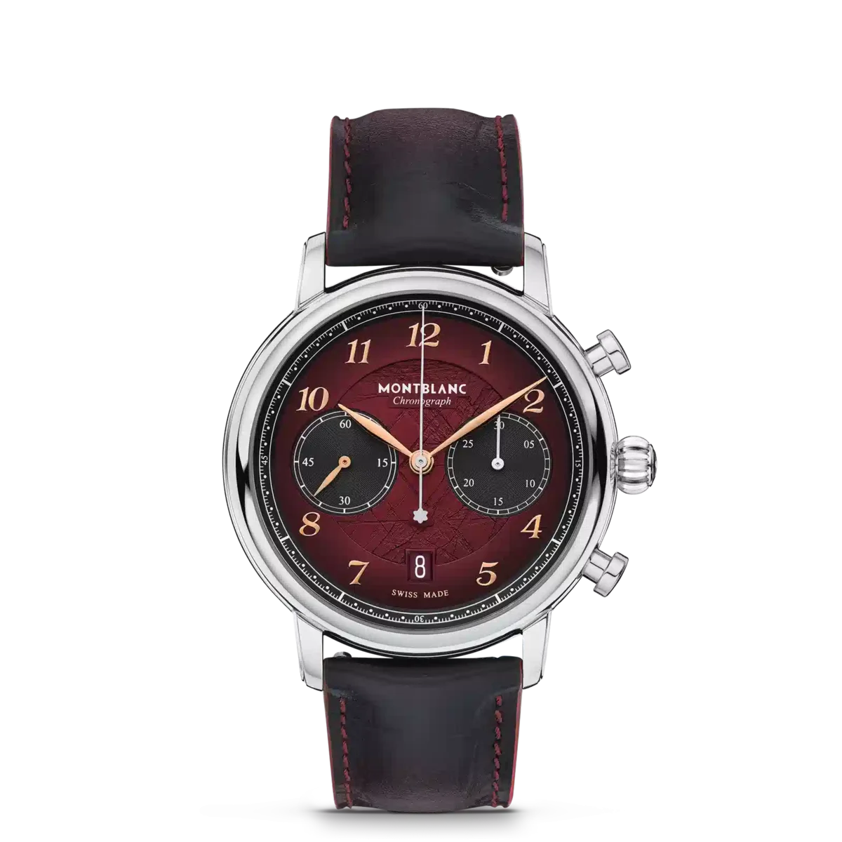 Montblanc Star Legacy Chronograph Limited Edition i 1786 exemplar är en hyllning till den orädde Jacques Balmat, som var den första att bestiga Mont Blanc 1786. Klockan har en burgundyfärgad urtavla med glaciärmönster och sfumatoeffekt runt kanten, en rackminuterie och roséguldbelagda siffror. Indikationerna inkluderar en central kronografsekundvisare med Montblanc-emblem på motvikten och en 30-minuters kronografräknare med rodiumpläterade visare, medan tidsmätningsfunktionerna – timmar, minuter och små sekunder – har roséguldpläterade visare. Denna modell drivs av det automatiska urverket MB 25.13 och är inrymd i ett 42 mm rostfritt stålboett med öppen boettbaksida på urverket. Klockan levereras med ett utbytbart kalvskinnsarmband med alligatorprint och vertikal sfumato. Identifikationsnummer MB133245. Bandbredd 21 mm.