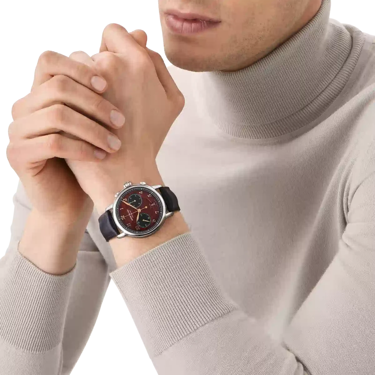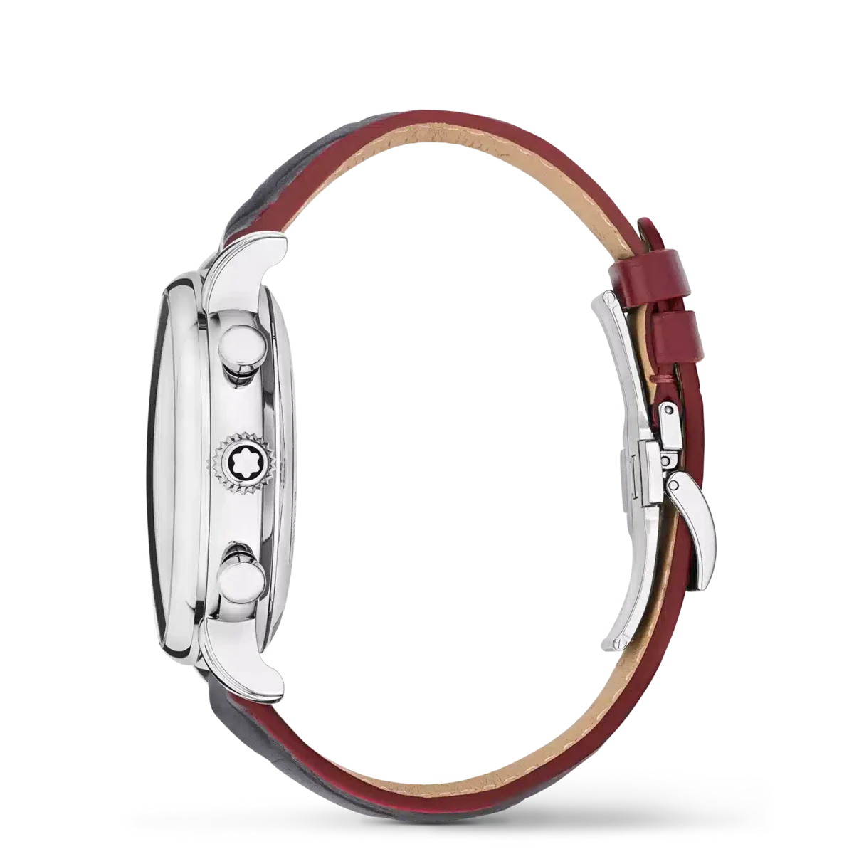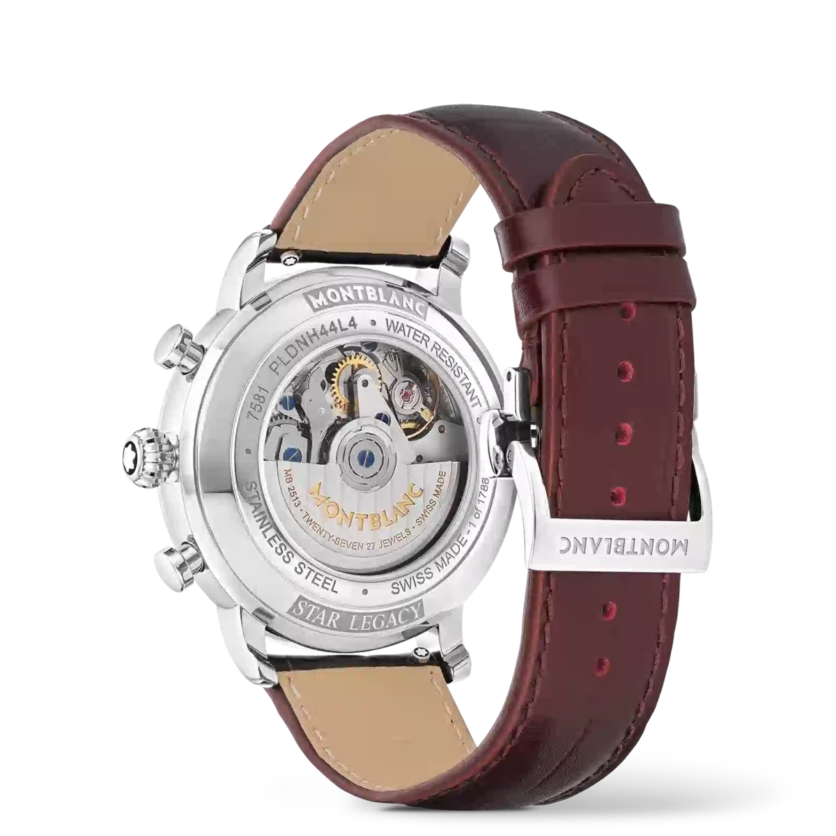 Montblanc Star Legacy Chronograph Limited Edition i 1786 exemplar är en hyllning till den orädde Jacques Balmat, som var den första att bestiga Mont Blanc 1786. Klockan har en burgundyfärgad urtavla med glaciärmönster och sfumatoeffekt runt kanten, en rackminuterie och roséguldbelagda siffror. Indikationerna inkluderar en central kronografsekundvisare med Montblanc-emblem på motvikten och en 30-minuters kronografräknare med rodiumpläterade visare, medan tidsmätningsfunktionerna – timmar, minuter och små sekunder – har roséguldpläterade visare. Denna modell drivs av det automatiska urverket MB 25.13 och är inrymd i ett 42 mm rostfritt stålboett med öppen boettbaksida på urverket. Klockan levereras med ett utbytbart kalvskinnsarmband med alligatorprint och vertikal sfumato. Identifikationsnummer MB133245. Bandbredd 21 mm.