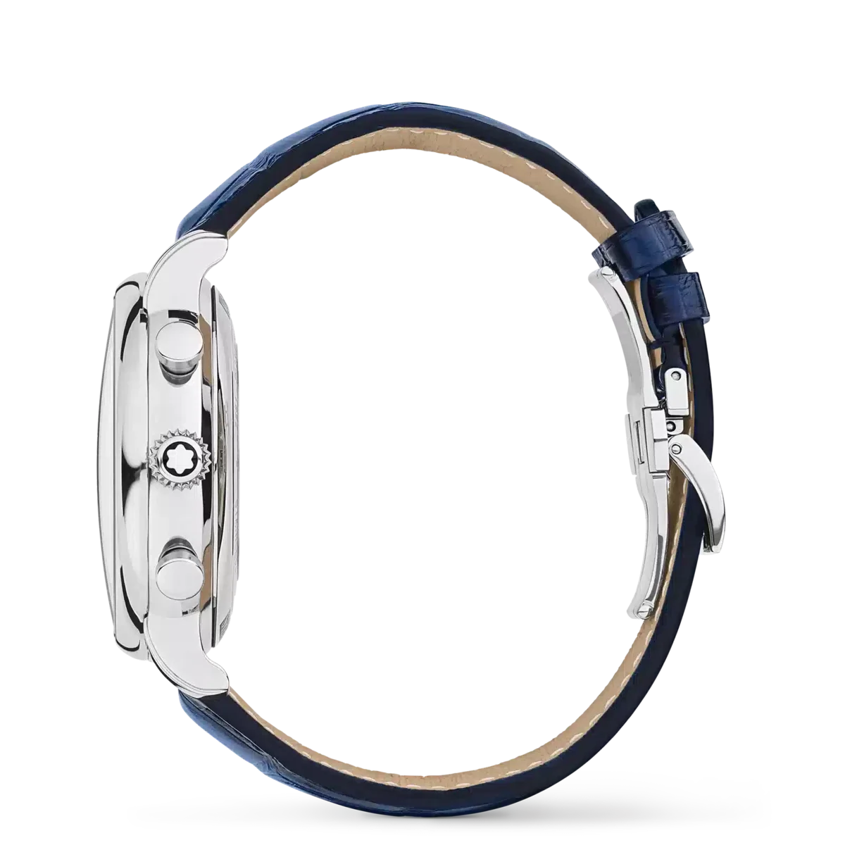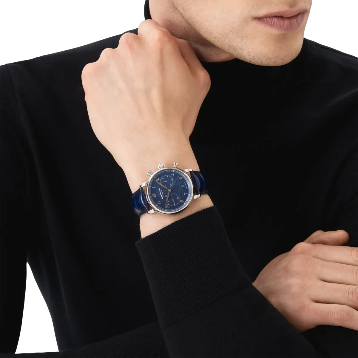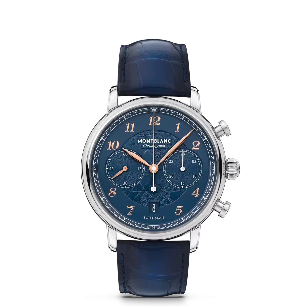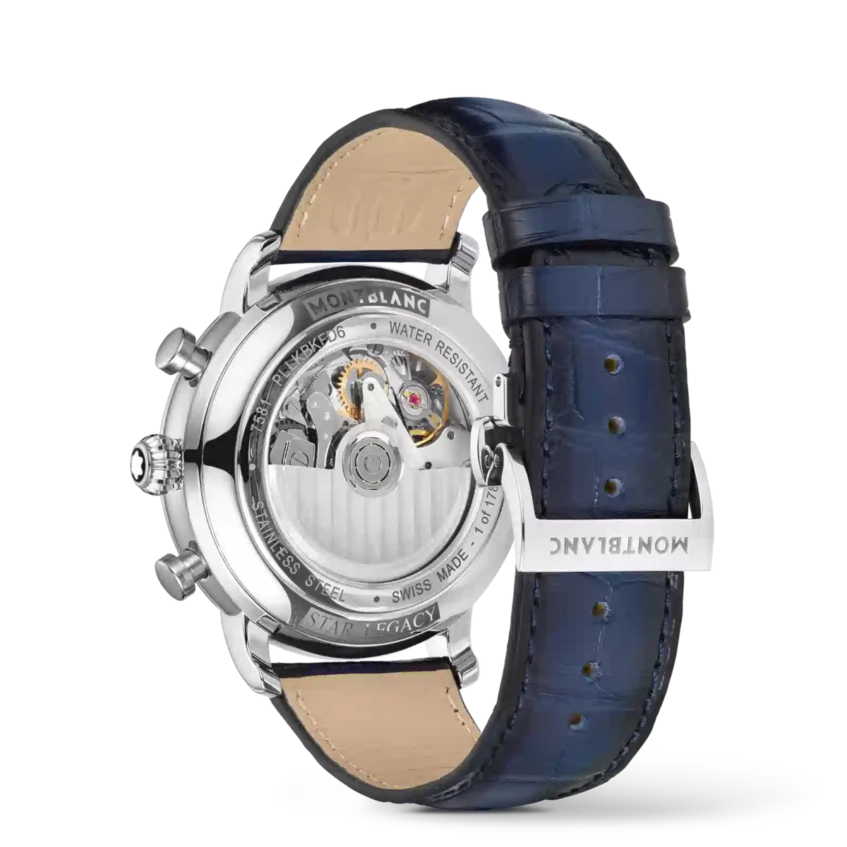 Montblanc Star Legacy Chronograph är begränsad till 1786 exemplar och har ett 42 mm stort, rundat rostfritt stålboett med roséguldbelagda arabiska siffror och en iögonfallande blå urtavla med glaciärmönster. Urtavlan är dekorerad med ett lager på lager-ismönster som är inspirerat av Mer de Glace, den största glaciären på Mont Blanc. Urtavlans mitt är skapad med hjälp av en speciell stämpel som återger glaciärens struktur och hyllar den ”blå timmen” – ”l’heure bleue” – då en intensiv blå nyans faller över glaciären i skymningen när månen går upp och stjärnorna börjar lysa. Det var vid denna tidpunkt på dagen som Jacques Balmat blev den första personen att nå toppen av Mont Blanc – klockan 18:23 den 7 augusti 1786. Funktionerna inkluderar timmar, minuter, central sekundvisare med Montblanc-emblem på motvikten, kronograf och datum, som drivs av det automatiska urverket MB 25.13 som kan beundras genom en safirglasbaksida. Tidsfunktionerna visas med roséguldbelagda bladformade visare, medan kronografindikationerna använder rodiumbelagda ”baton”-visare. Klockan är försedd med ett blått sfumato-alligatorarmband. Identifikationsnummer MB129626. Bandbredd 21 mm.