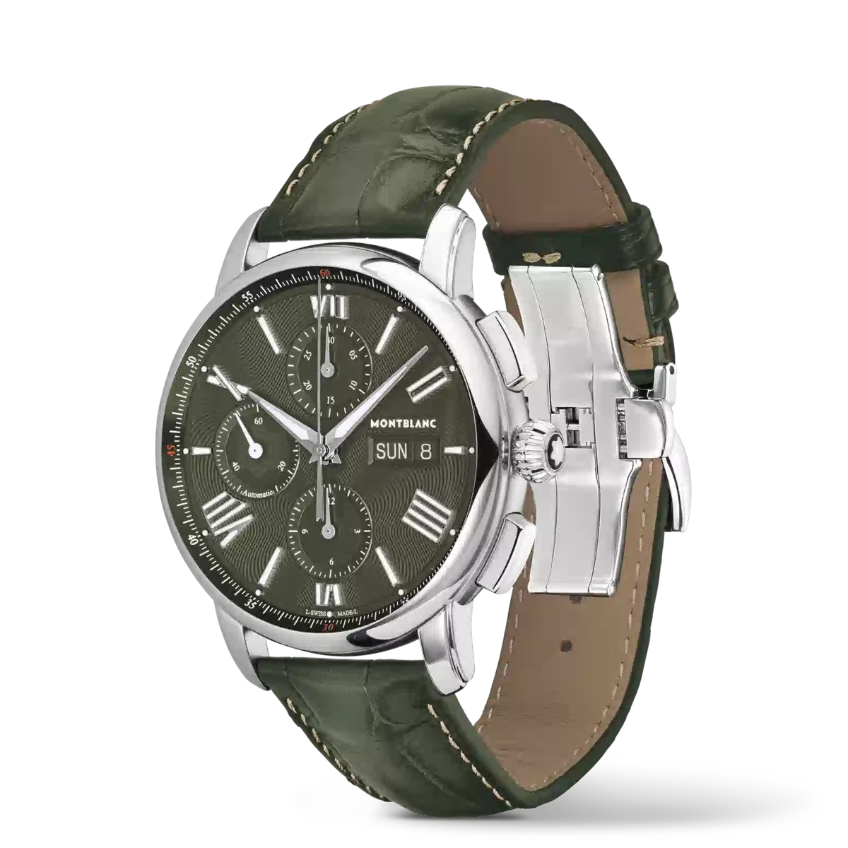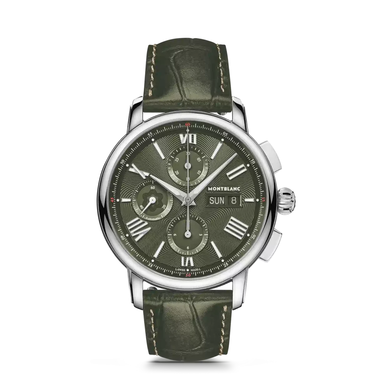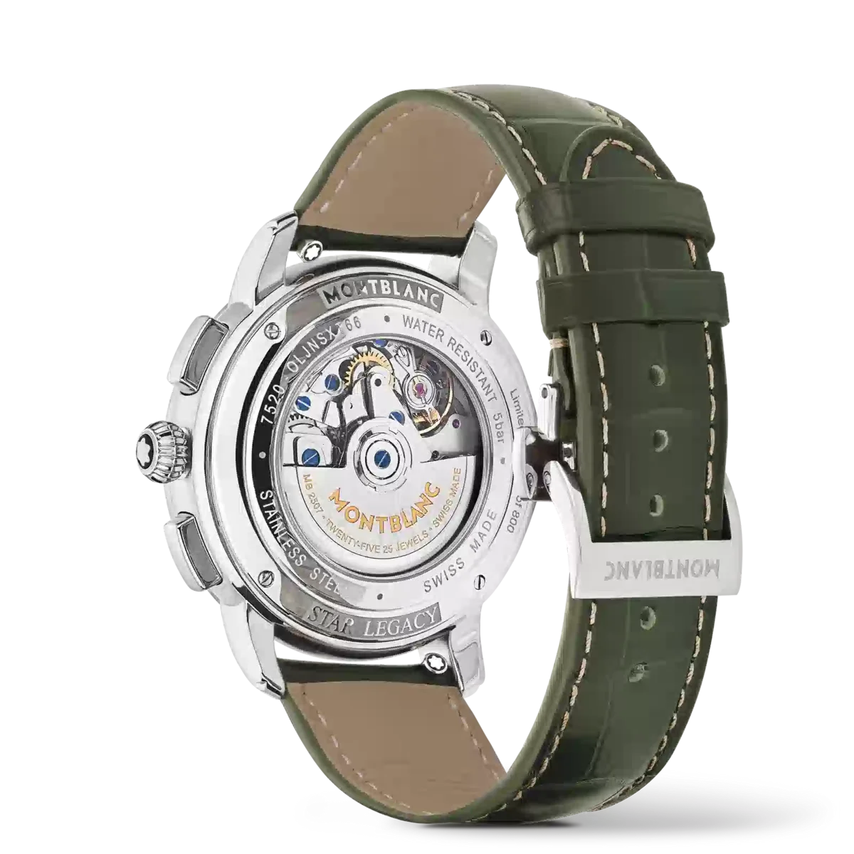 Montblanc Star Legacy Chronograph Day & Date Limited Edition i 800 exemplar är inspirerad av Minervas fickur från slutet av 1800-talet och början av 1900-talet med sina runda, polerade, stenformade boetter och lökformade kronor. Den vackra gröna urtavlan har Montblancs signaturmönster med exploderande stjärnor samt rodiumbelagda svärdformade visare och siffror. Den drivs av det automatiska urverket MB 25.07 som inkluderar en kronograf, veckodag och datum. Klockan är också försedd med ett utbytbart grönt kalvskinnsarmband med alligatorprint och ecru-sömmar.