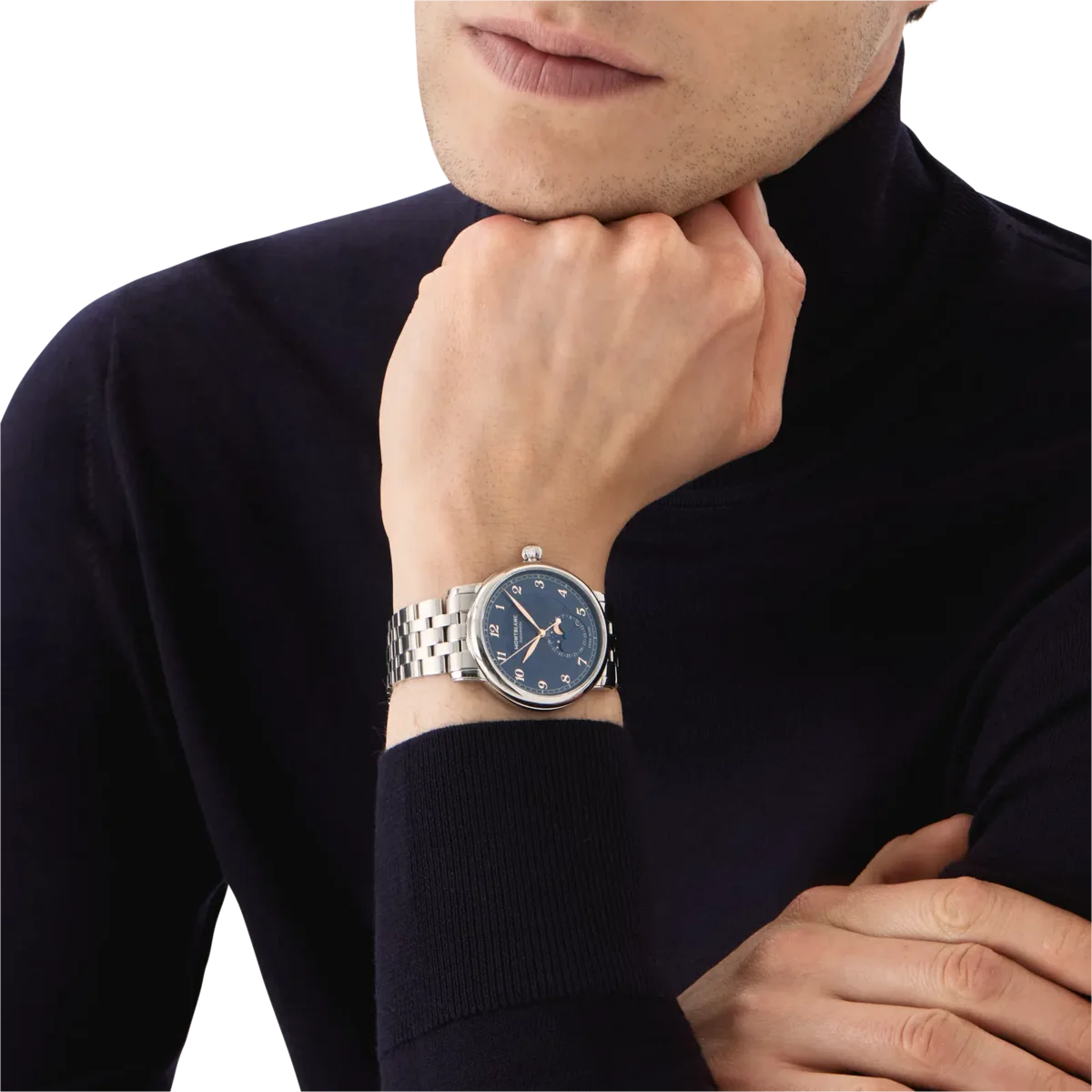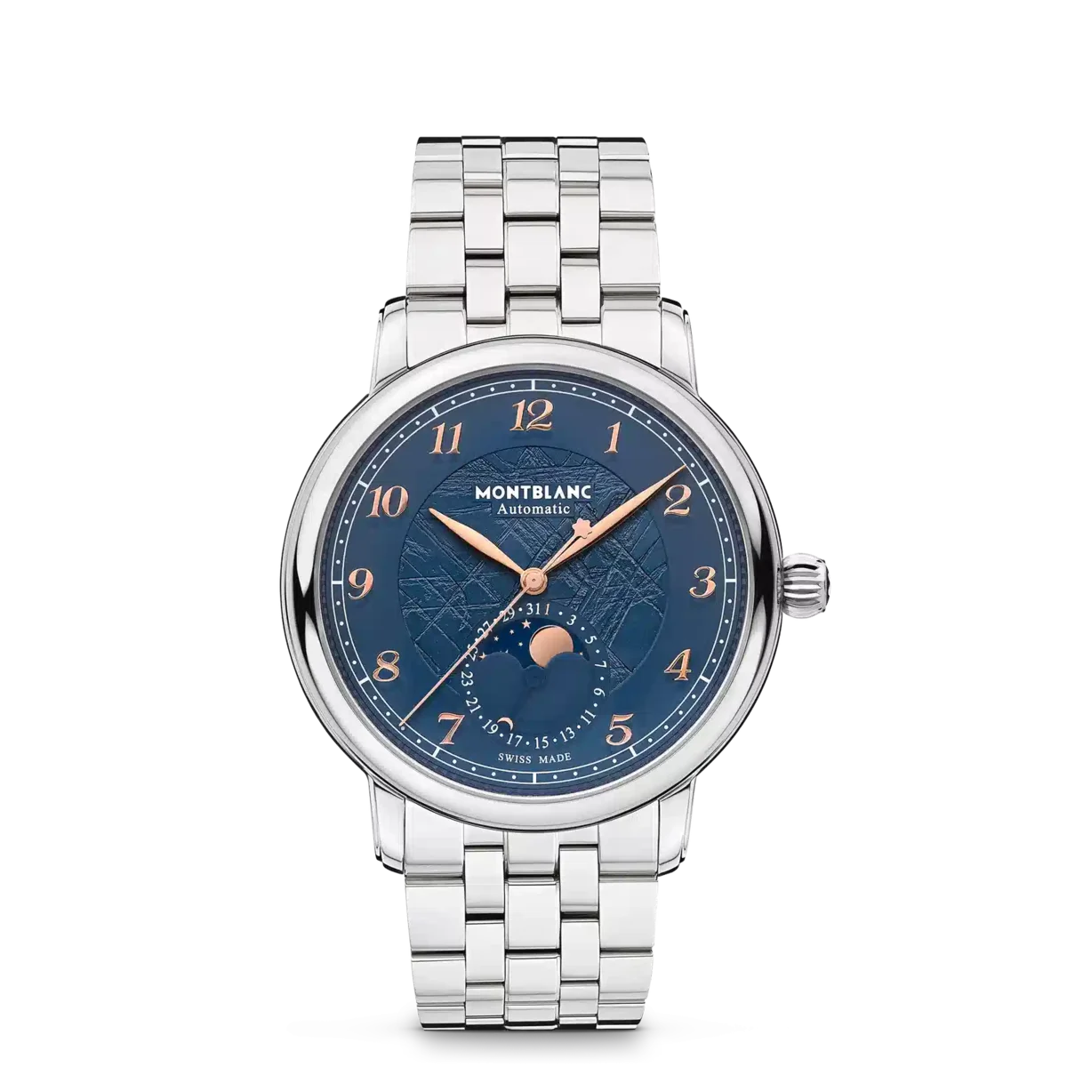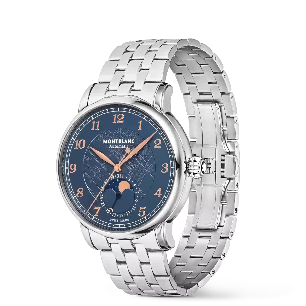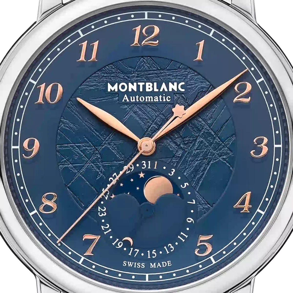 Montblanc Star Legacy Moonphase är begränsad till 1786 exemplar och kommer i ett 42 mm stort, stenformat rostfritt stålboett med roséguldbelagda visare, arabiska siffror och en iögonfallande blå urtavla med glaciärmönster. Urtavlan är dekorerad med ett lager på lager-ismönster som är inspirerat av Mer de Glace, den största glaciären på Mont Blanc. Urtavlans mitt är skapad med hjälp av en speciell stämpel som återger glaciärens struktur och hyllar den ”blå timmen” – ”l’heure bleue” – då en intensiv blå nyans faller över glaciären i skymningen när månen går upp och stjärnorna börjar lysa. Det var vid denna tidpunkt på dagen som Jacques Balmat blev den första personen att nå toppen av Mont Blanc – klockan 18:23 den 7 augusti 1786. Funktionerna inkluderar timmar, minuter, central sekundvisare med Montblanc-emblem på motvikten, månfas och datum, som drivs av det automatiska urverket MB 24.31 som kan beundras genom en safirglasbaksida. Klockan är försedd med ett armband i rostfritt stål. Identifikationsnummer: MB129631