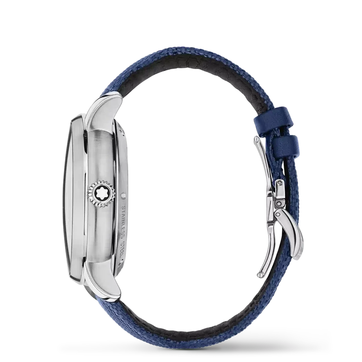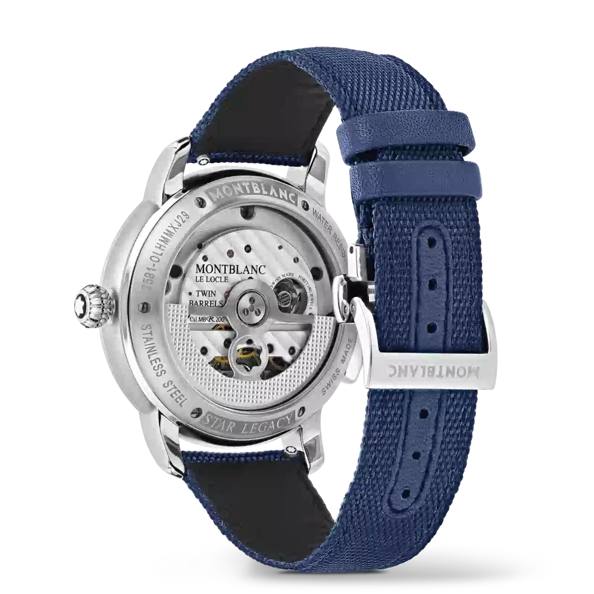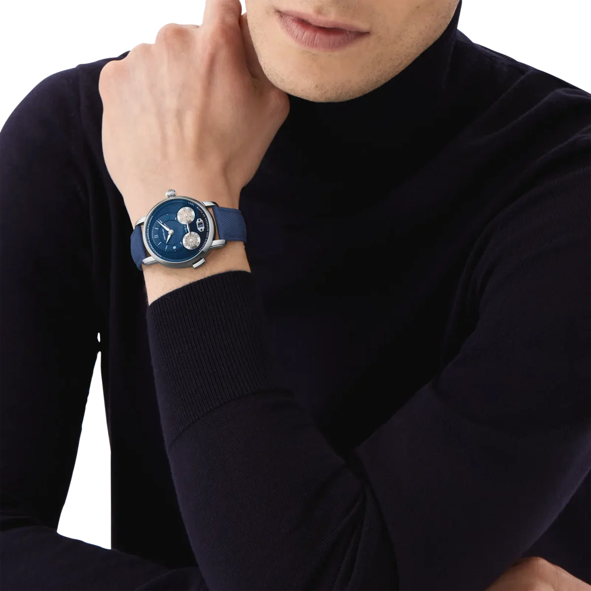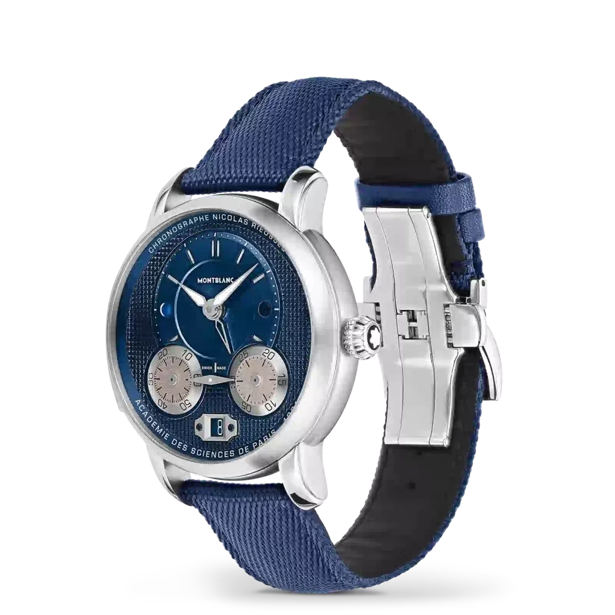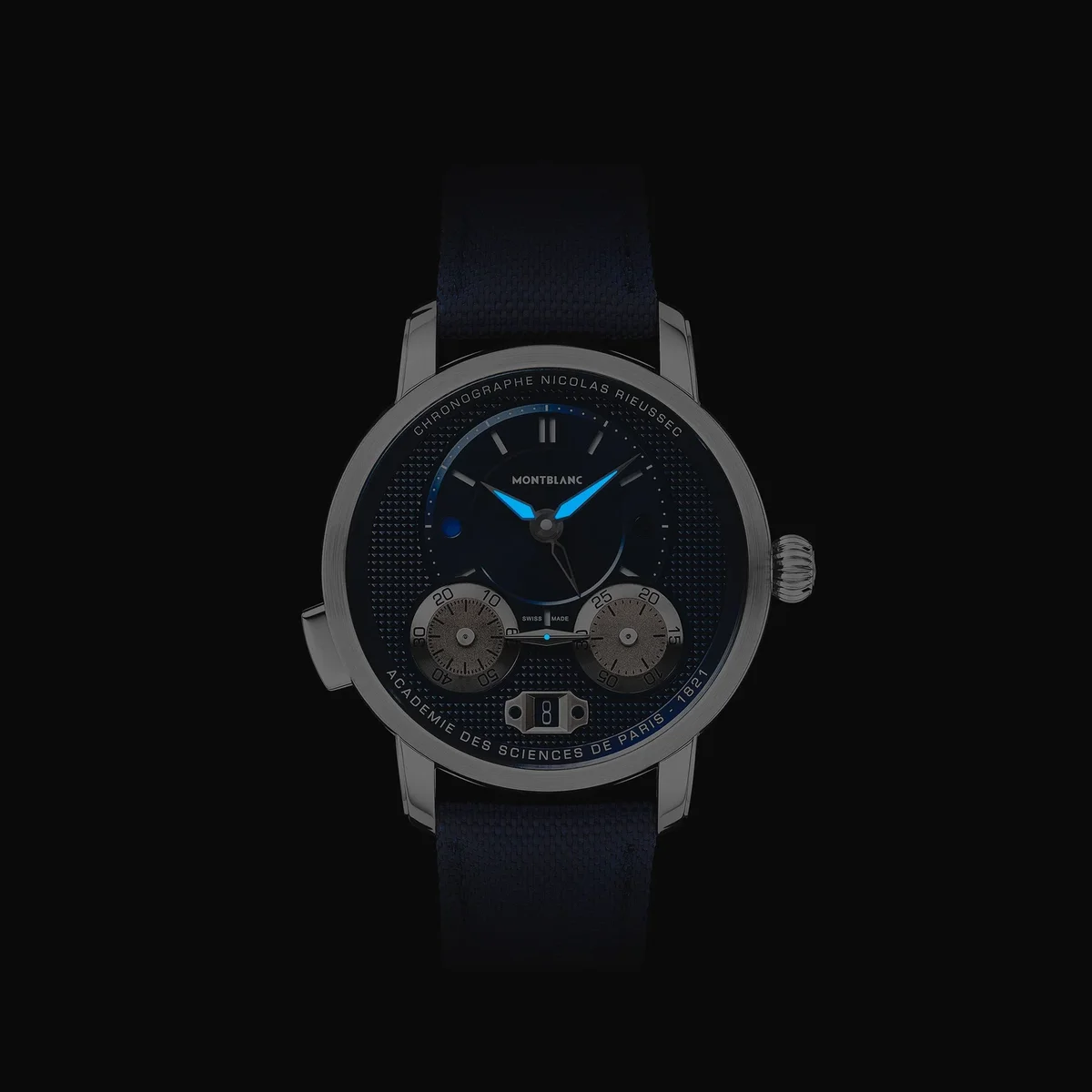 Montblanc Star Legacy Nicolas Rieussec Monopusher Chronograph drivs av MB R200-urverket och har ett 43 mm rostfritt stålboett med blå urtavla, rodiumpläterade visare och silvervita index. Denna nya modell har flera detaljer som förstärker den historiska kopplingen till Paris – där Montblancs kronografhistoria började på hästkapplöpningsbanan Champ-de-Mars – inklusive ett Clou de Paris-motiv på urtavlan som fortsätter på svängmassan och textilarmbandet. Detta motiv har sitt ursprung i den geometriska designen på Paris kullerstensgator och är länken mellan det förflutna och framtiden för denna klocka.