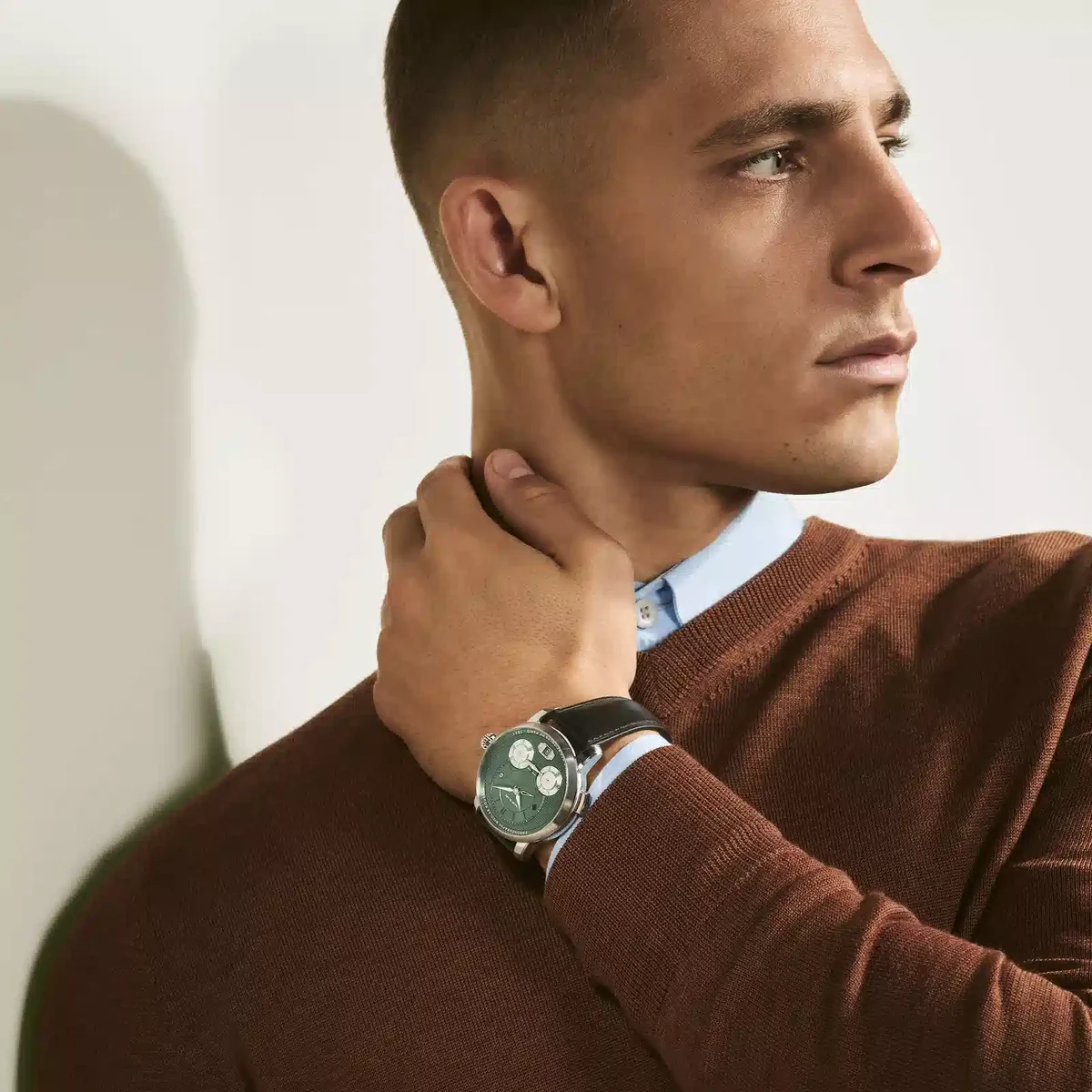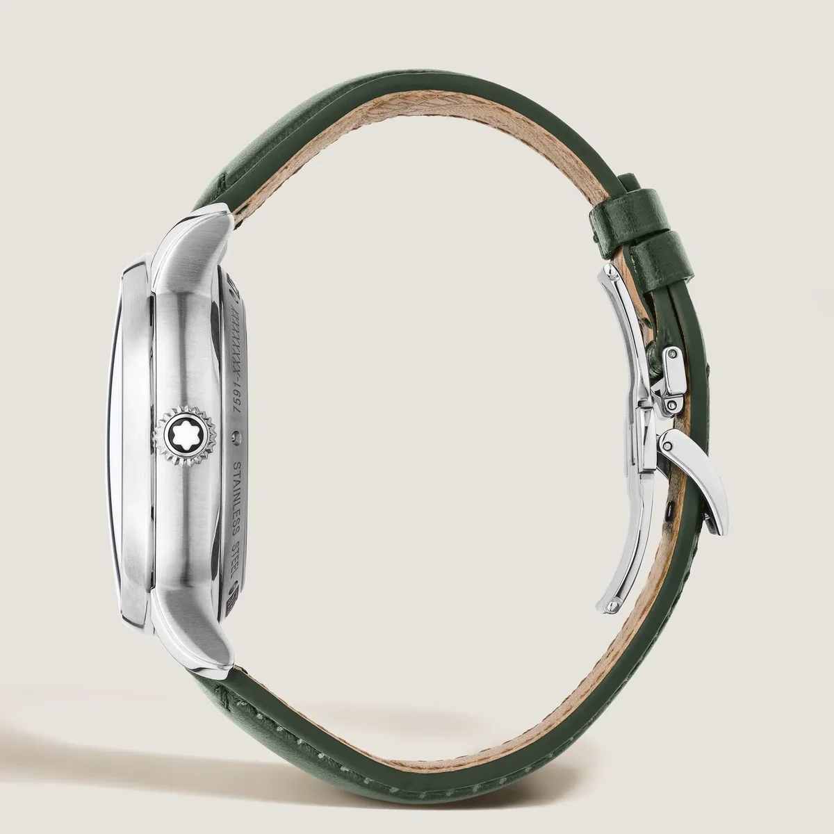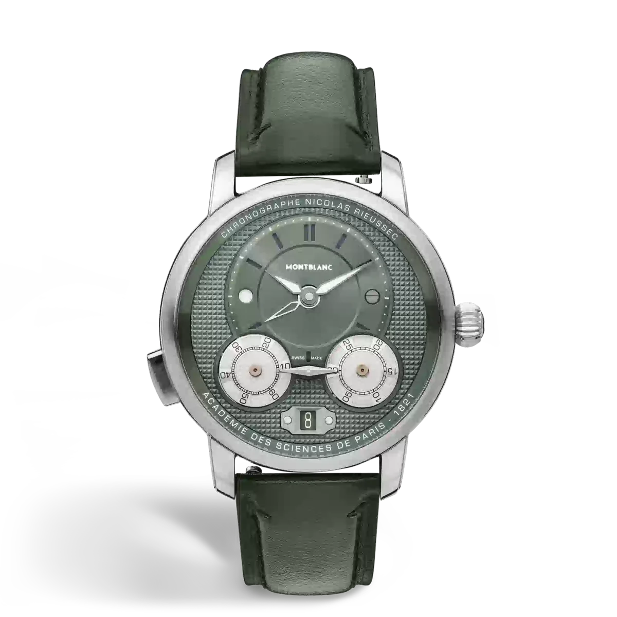 Montblanc Star Legacy Nicolas Rieussec Chronograph förstärker kopplingen till Paris med många element som hyllar Ljusets stad. Ett grafiskt Clous de Paris-motiv på den eleganta gröna urtavlan har sitt ursprung i den geometriska designen av Paris kullerstensgator och fortsätter på svängmassan. En fransk inskription av ”Académie des Sciences de Paris” och ”Chronographe Nicolas Rieussec” är graverad på flänsen, som en påminnelse om att akademin godkände Rieussecs uppfinning 1821. Fodret på armbandet har också förskönats med en karta över Paris från 1821. Det gröna utbytbara kalvskinnsarmbandet har specialdesignats av Montblancs konstnärlige chef Marco Tomasetta, som hämtat inspiration från Maison-märkets pennspetsar med sin spetsiga form. Klockan har ett 43 mm rostfritt stålboett och drivs av det självuppdragande Manufacture monopusher-kronografverket MB R200. Identifikationsnummer MB132947 Lugbredd 21 mm