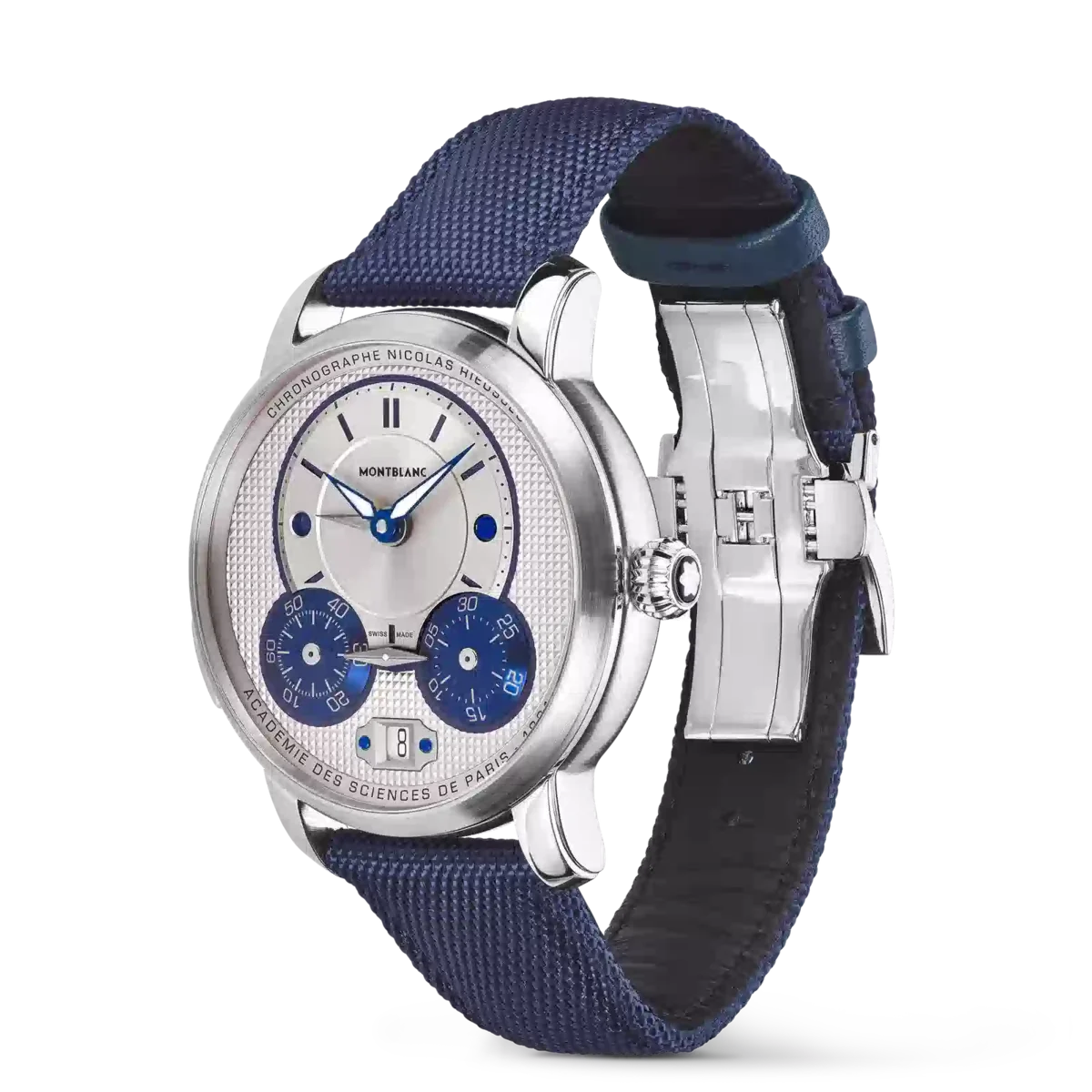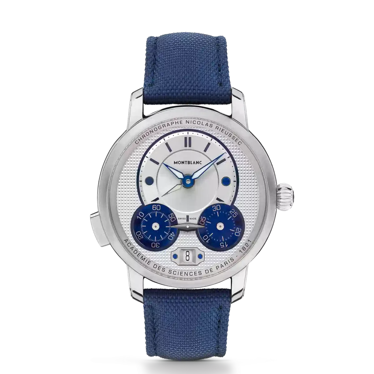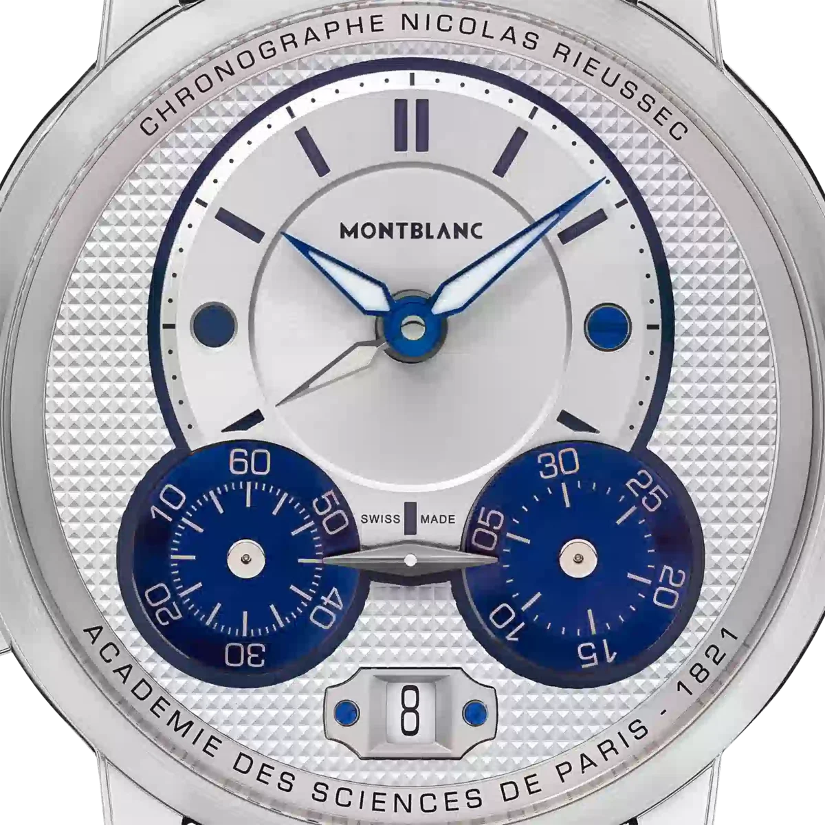 Montblanc Star Legacy Nicolas Rieussec Chronograph 43 mm är en hyllning till den bläckbaserade kronografen som först testades av Nicolas Rieussec 1821 i Paris och godkändes av Académie des Sciences. Denna nya version har ett 43 mm rostfritt stålboett med en grå och blå urtavla. Clou de Paris-motiv finns på urtavlan, svängvikten och det blå textilarmbandet, som påminner om Paris kullerstensgator. Funktionerna inkluderar kronograf, dag- och nattindikering, andra tidszon och datum. Klockan drivs av MB R200 Montblanc Manufacture monopusher-kronografverk. Identifikationsnummer MB129764 Bandbredd 21 mm