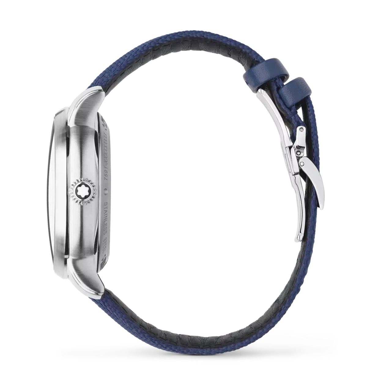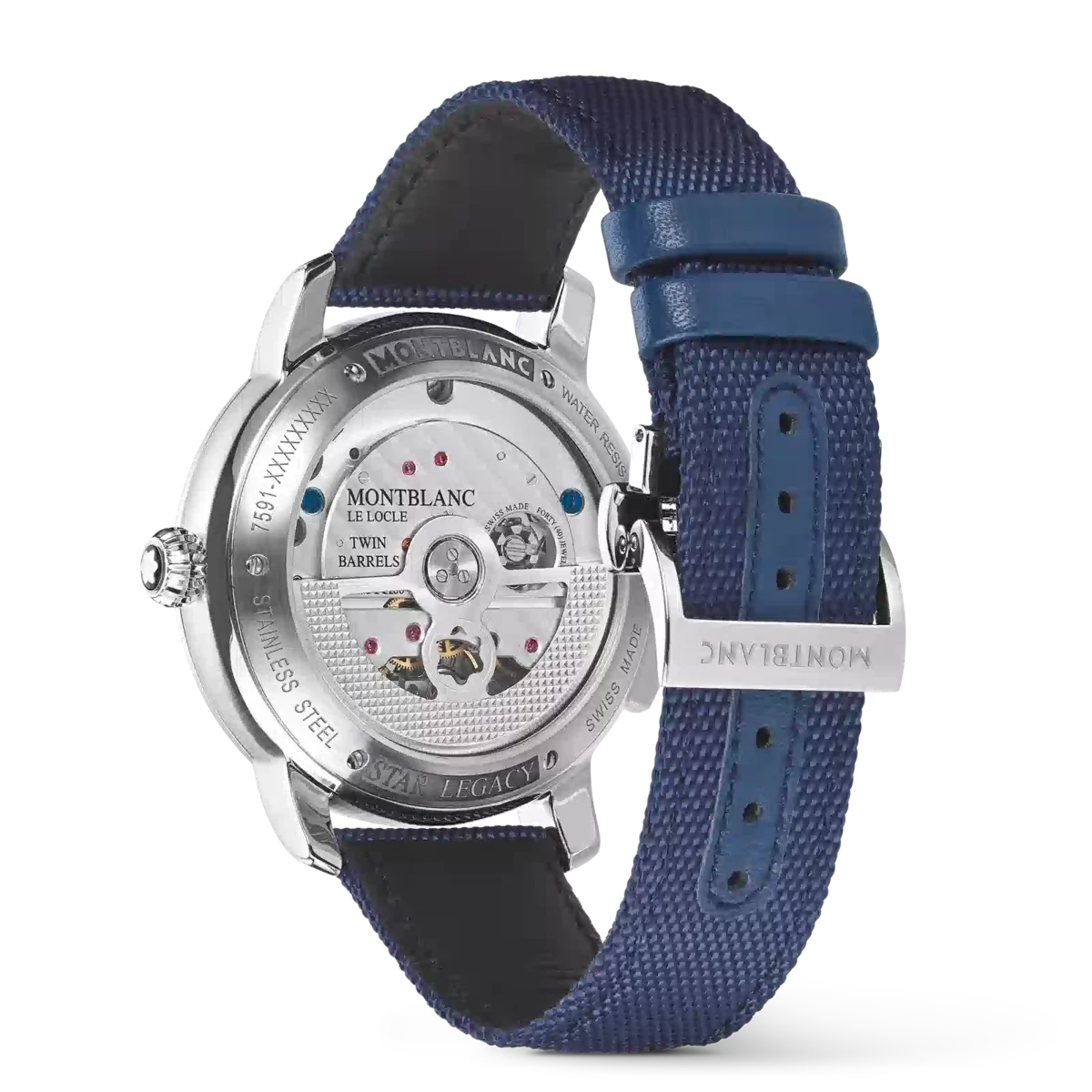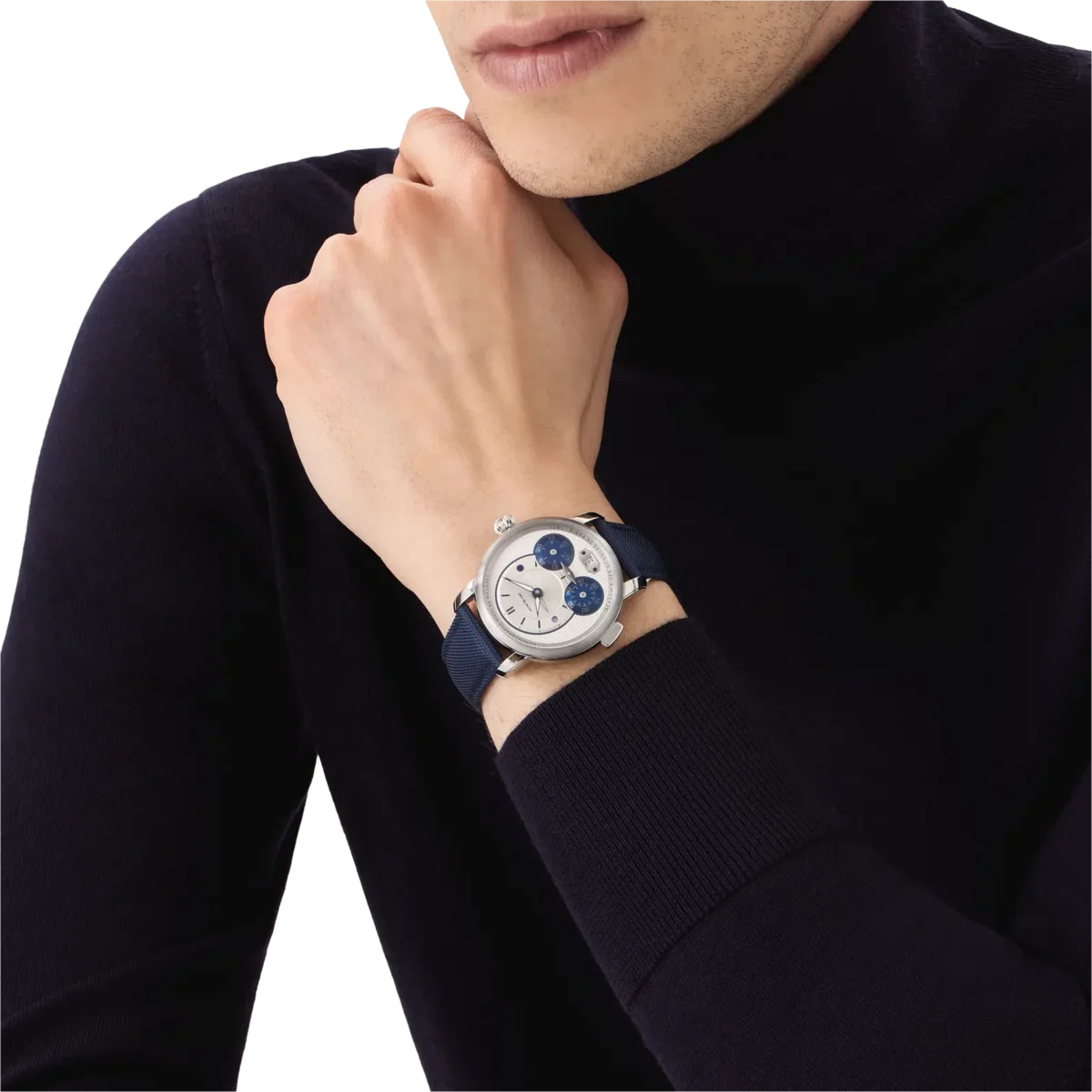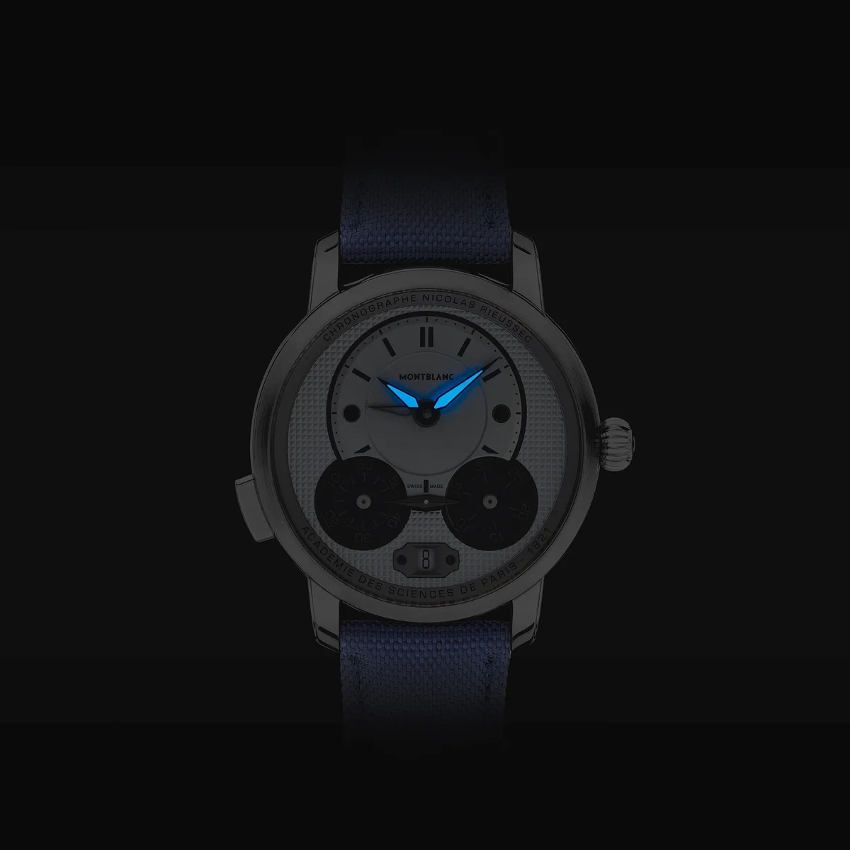 Montblanc Star Legacy Nicolas Rieussec Chronograph 43 mm är en hyllning till den bläckbaserade kronografen som först testades av Nicolas Rieussec 1821 i Paris och godkändes av Académie des Sciences. Denna nya version har ett 43 mm rostfritt stålboett med en grå och blå urtavla. Clou de Paris-motiv finns på urtavlan, svängvikten och det blå textilarmbandet, som påminner om Paris kullerstensgator. Funktionerna inkluderar kronograf, dag- och nattindikering, andra tidszon och datum. Klockan drivs av MB R200 Montblanc Manufacture monopusher-kronografverk. Identifikationsnummer MB129764 Bandbredd 21 mm