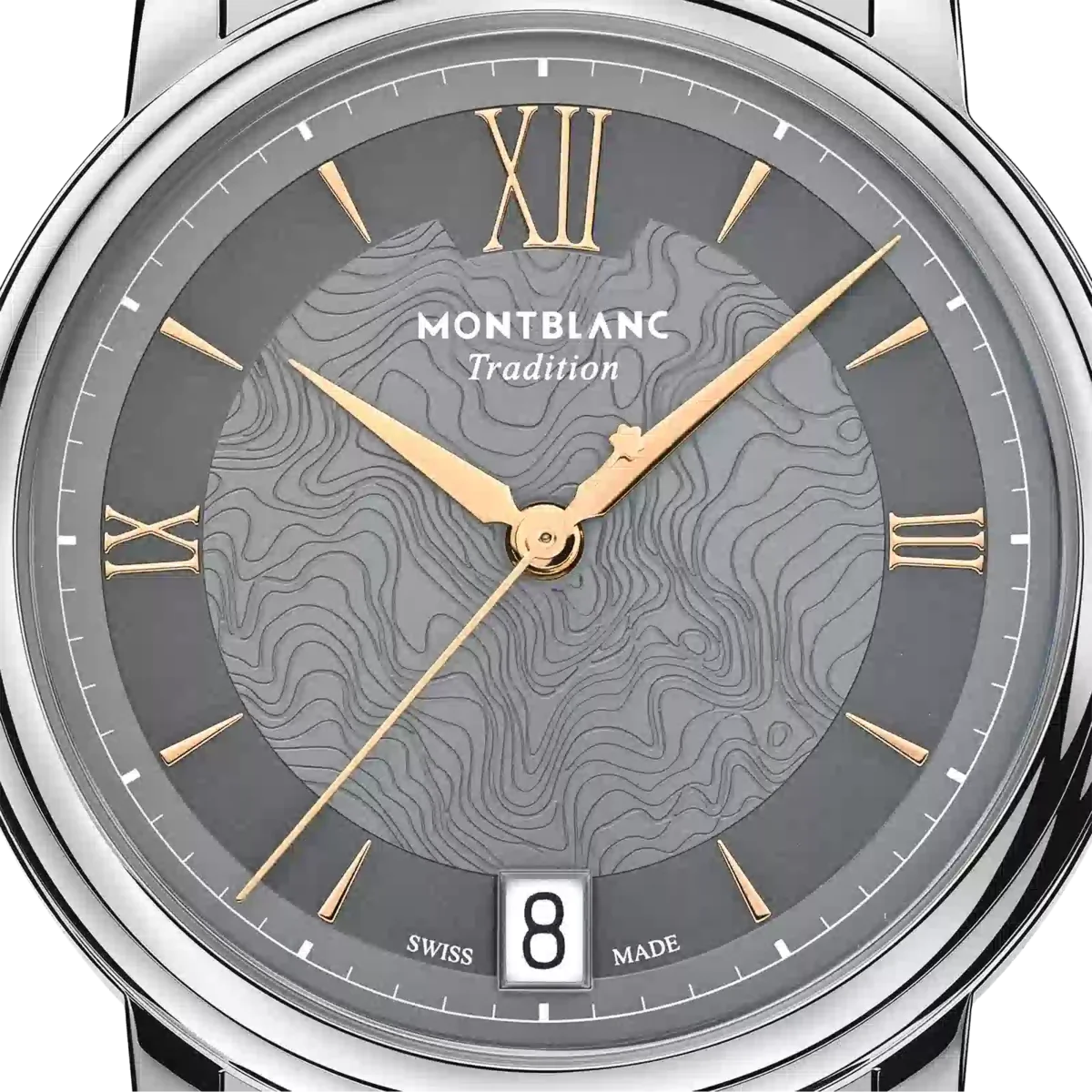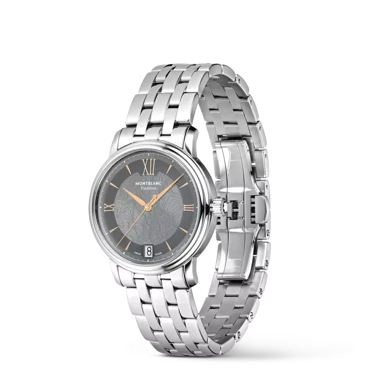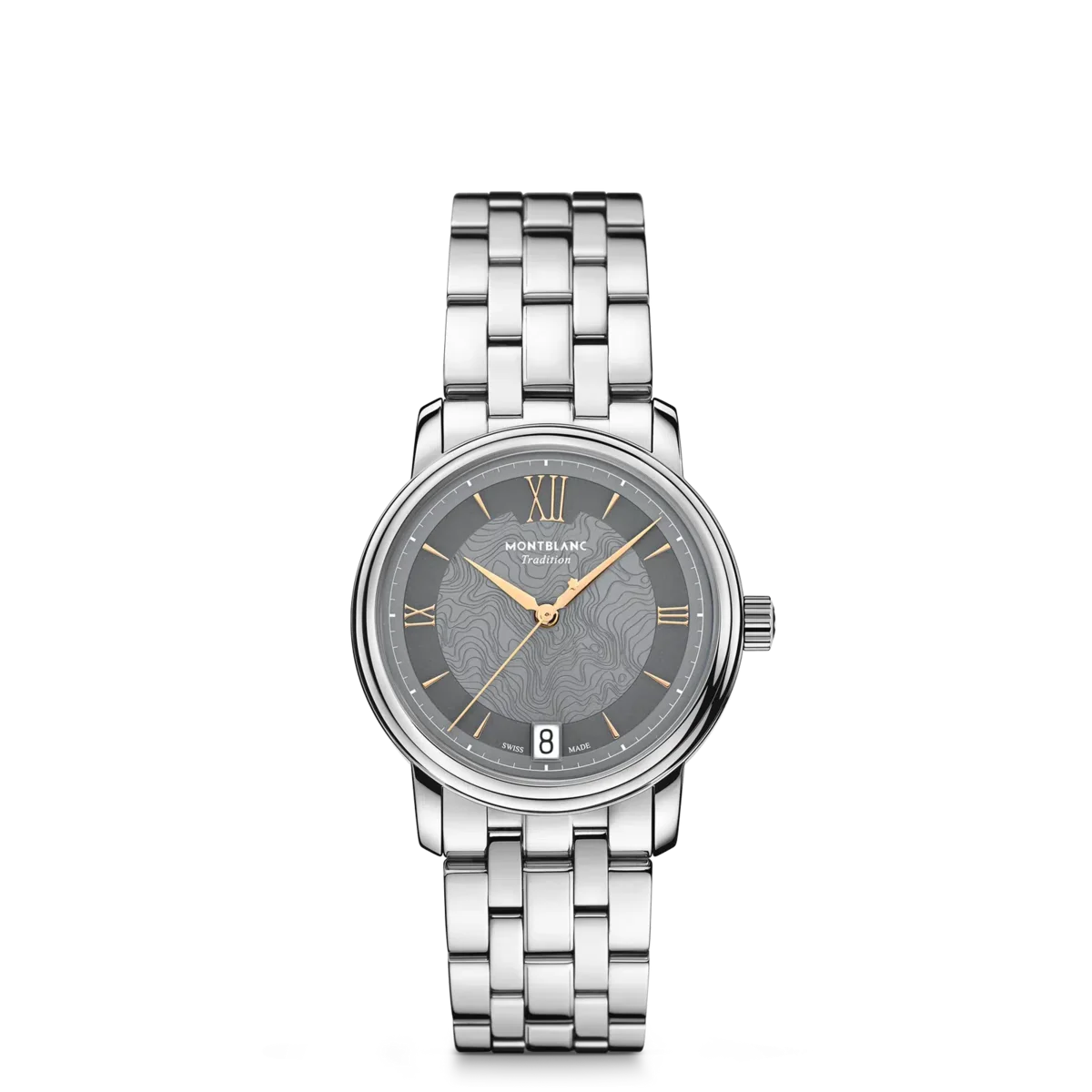Montblanc Tradition Automatic Date har ett 32 mm rostfritt stålboett med raka horn och en dubbelformad bezel. Klockan har en grå urtavla som visar topografin på Mont Blanc med roséguldfärgade romerska siffror och en framträdande romersk ”XII”. De svärdformade tim- och minutvisarna, sekundvisaren och kronan med Montblanc-emblemet samt det utbytbara armbandet i rostfritt stål fulländar dess moderna, eleganta utseende.