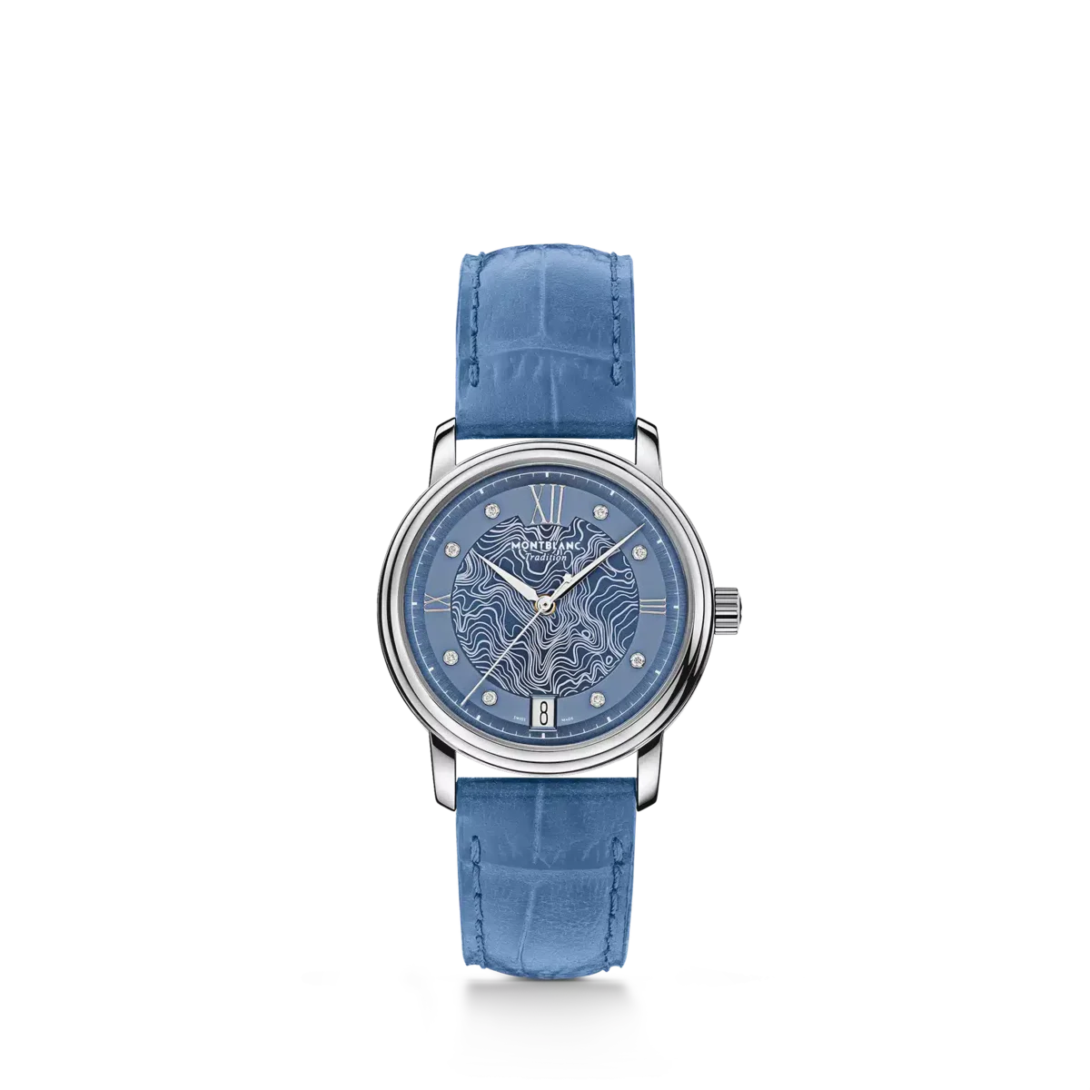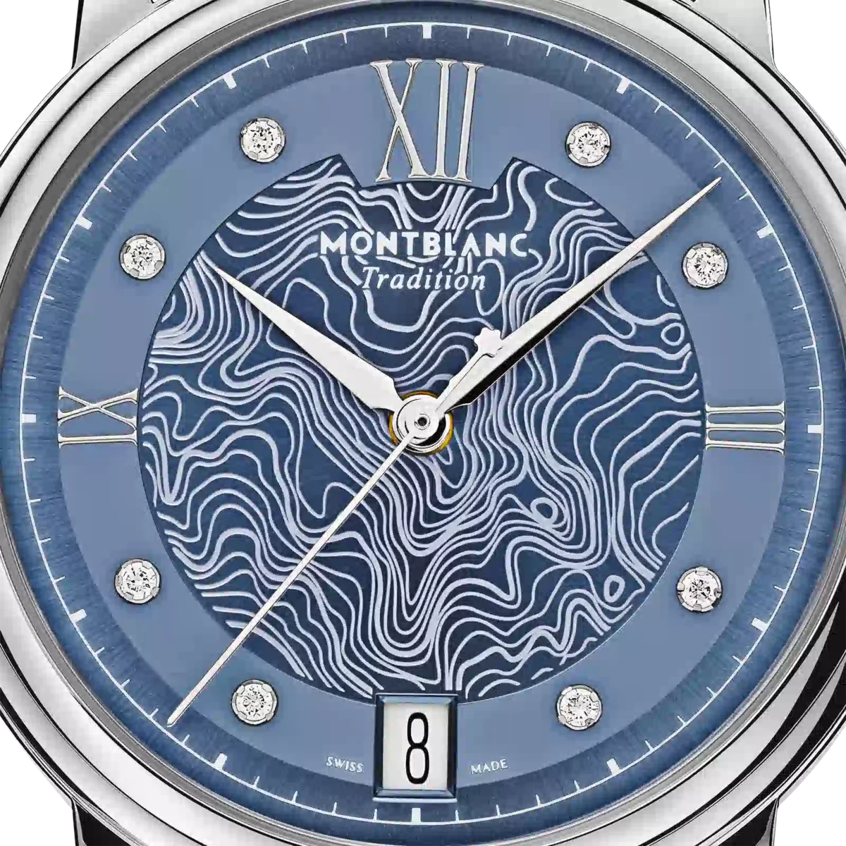 Montblanc Tradition Automatic Date har ett 32 mm rostfritt stålboett med raka horn och en dubbelformad bezel. Klockan har en blå urtavla som visar topografin på Mont Blanc med diamantindex, silverfärgade romerska siffror och en framträdande romersk ”XII”. De svärdformade tim- och minutvisarna, sekundvisaren och kronan med Montblanc-emblemet samt det blå utbytbara kalvskinnsarmbandet fulländar dess moderna, eleganta utseende.