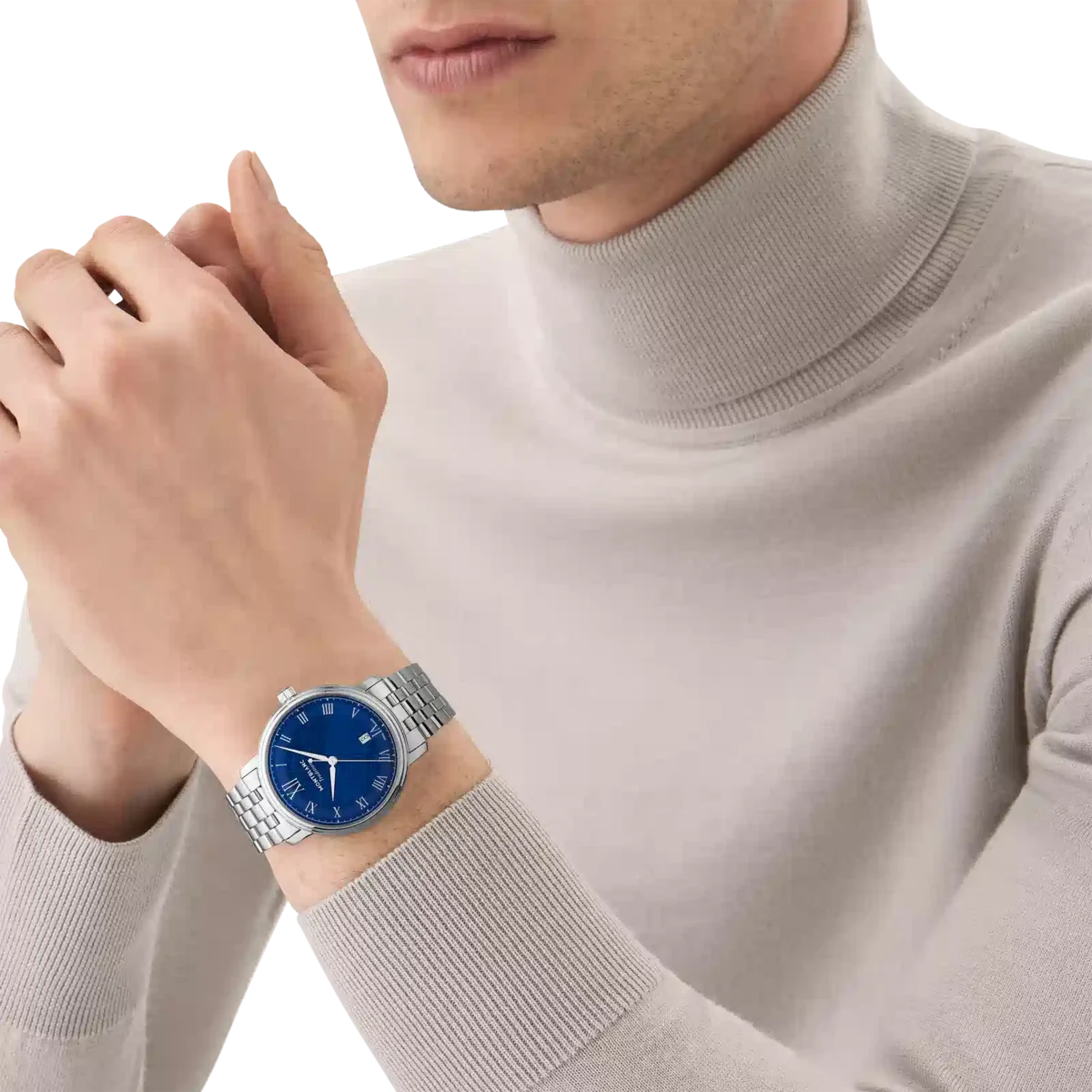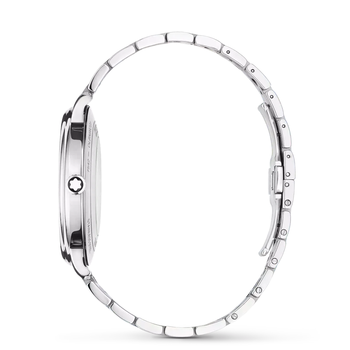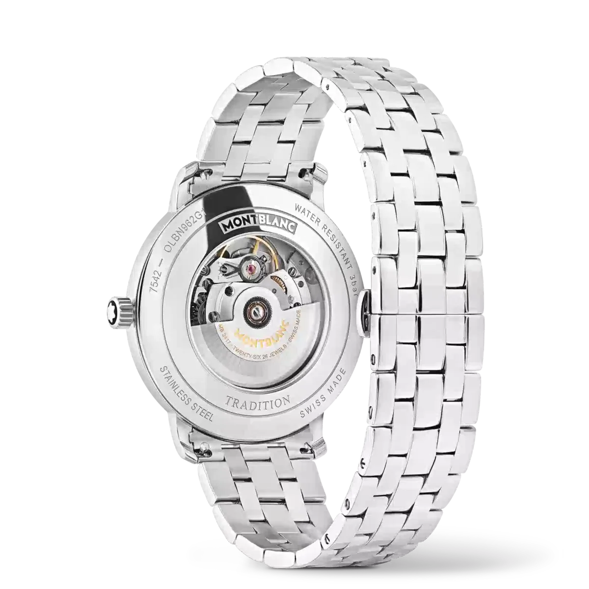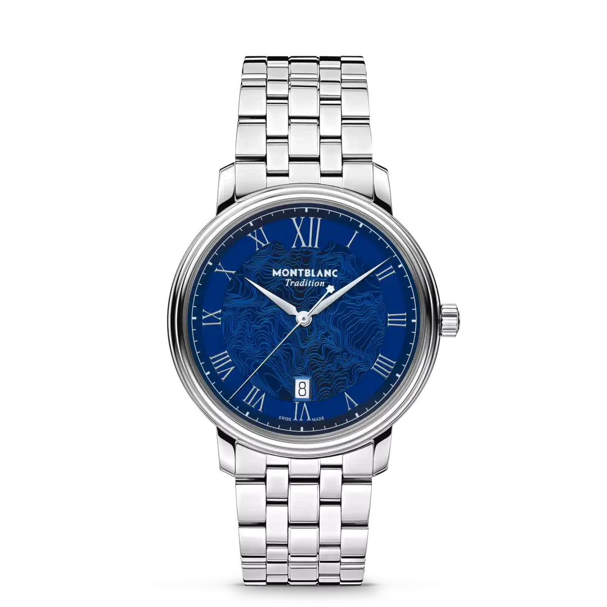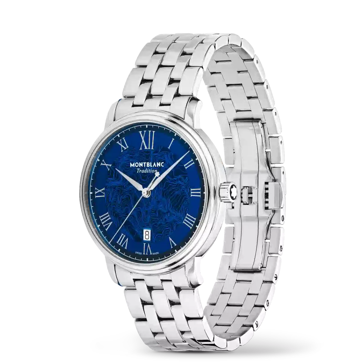 Montblanc Tradition Automatic Date har ett 40 mm rostfritt stålboett med raka horn och en dubbelformad bezel. Klockan har en blå urtavla som visar topografin på Mont Blanc med silverfärgade romerska siffror och en framträdande romersk ”XII”. De svärdformade tim- och minutvisarna, sekundvisaren och kronan med Montblanc-emblemet samt det utbytbara armbandet i rostfritt stål fulländar dess moderna, eleganta utseende.