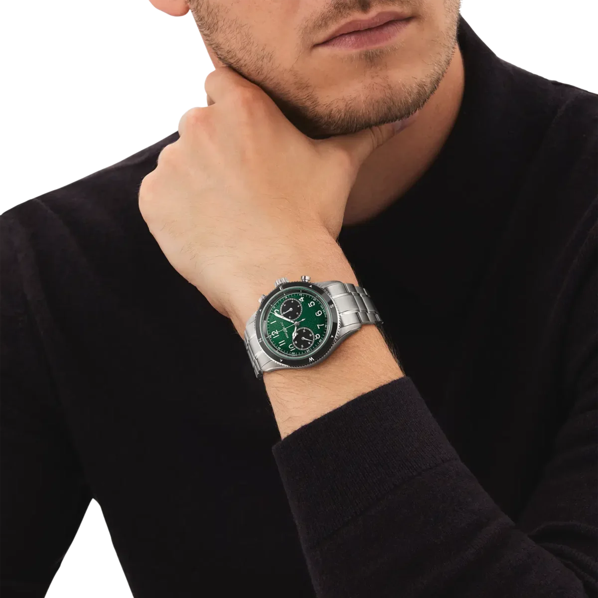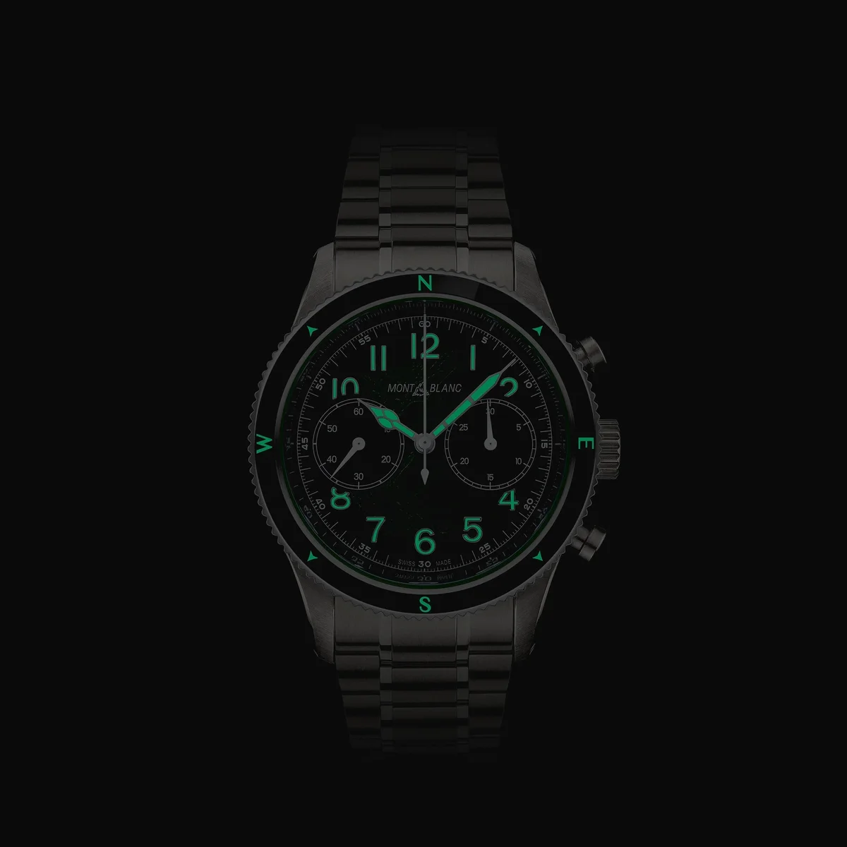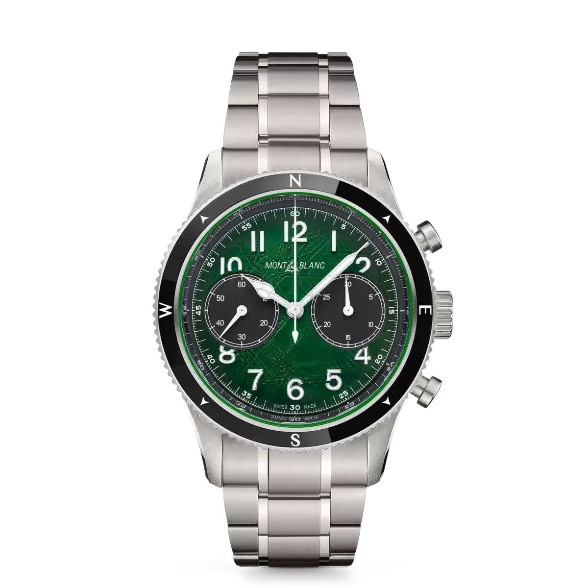 Den sfumato gröna glaciärmönstrade urtavlan på denna Montblanc 1858 Automatic Chronograph 0 Oxygen fångar andan av bergsklättring och skönheten i Antarktis glaciärlandskap och är inspirerad av den djupa gröna färgen på smaragdgröna isberg eller ”jadeberg”. Klockan är inrymd i ett 42 mm rostfritt stålboett som är helt syrefritt. Urtavlan är utsmyckad med en bi-compax-kronografkonfiguration med en svart liten sekundvisare vid klockan 9 och en svart 30-minuters kronografräknare vid klockan 3. I matchning med suburtavlorna har klockan en svart keramisk bezel med två riktningar och självlysande kardinalpunkter. Den är försedd med ett utbytbart armband i rostfritt stål med avsmalnande form och finjusteringssystem samt en graverad boettbaksida med den speciella graveringen ”Spirit of Exploration”. Identifieringsnummer MB133298