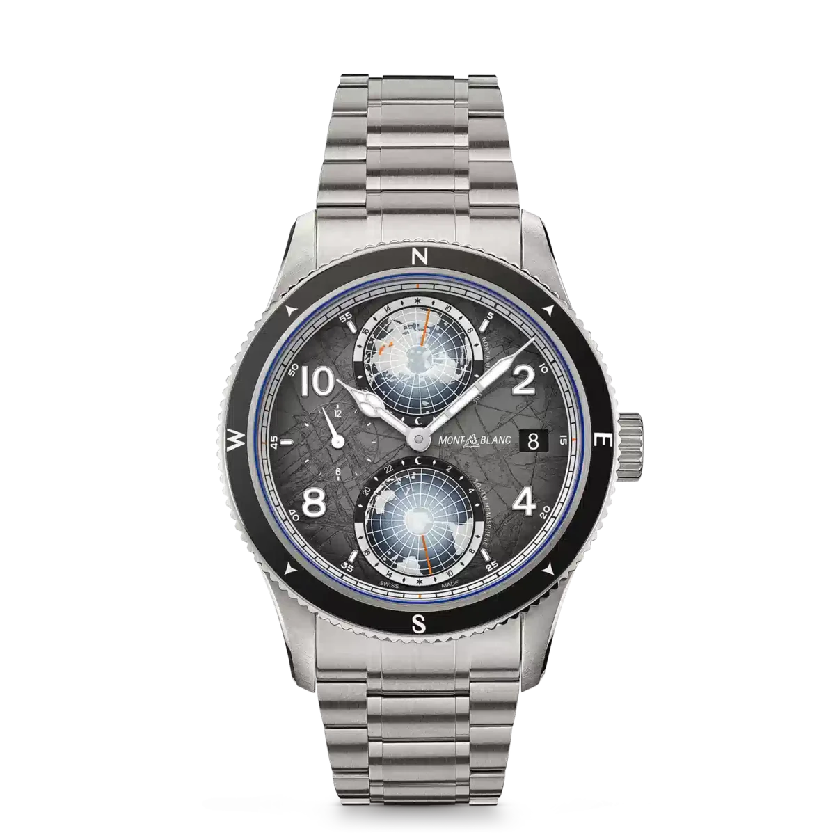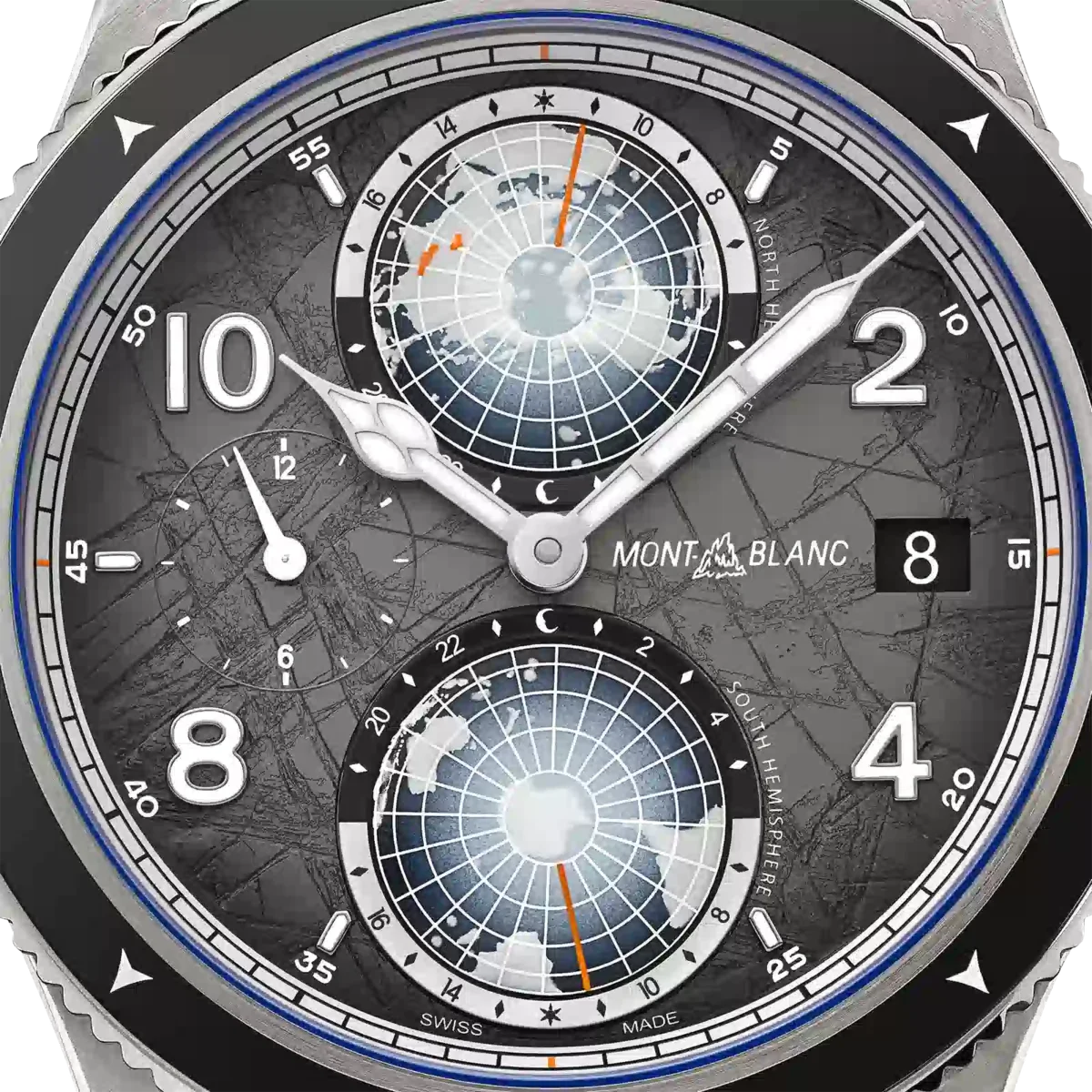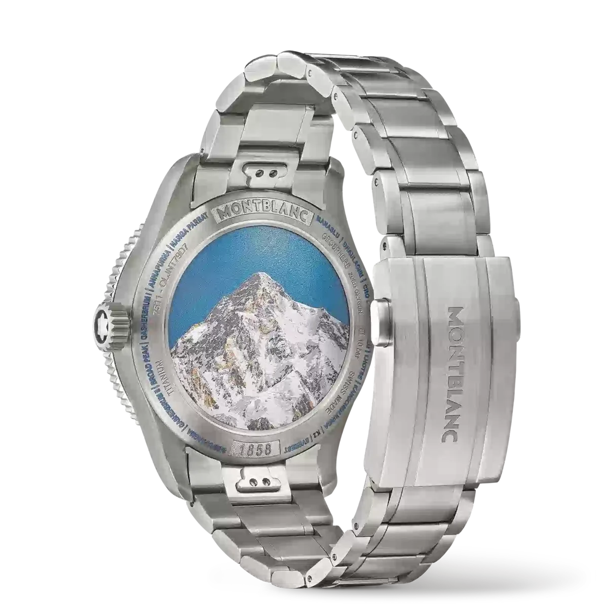 Montblanc 1858 Geosphere 0 Oxygen The 8000 är en hyllning till världens högsta bergstoppar och de alpinister som vågar bestiga dem under extrema förhållanden. Klockan har ett 42 mm titanboett som är helt syrefritt. Detta har flera fördelar för upptäcktsresande, eftersom det eliminerar imma och förhindrar oxidation, vilket gör att urverket håller mycket längre och med större precision. Klockan drivs av det automatiska urverket MB 29.25 med Manufacture Worldtime-komplikation, som inkluderar tiden för 24-timmarszonerna som kan avläsas på de självlysande kontinenterna på de 3D-roterande globarna för norra och södra halvklotet, dag- och nattindikeringar, dubbel tidsvisning och datum. Klockan har också en räfflad, dubbelriktad svart keramikring med självlysande kardinalpunkter, en sfumato mörkgrå urtavla med glaciärmönster och orange accenter samt ett utbytbart titanarmband med avsmalnande form och finjusteringssystem. Baksidan av boetten för denna modell har en 3D-lasergravering av berget K2 som är avbildat med otrolig färg, djup och realism. Identifikationsnummer MB130982