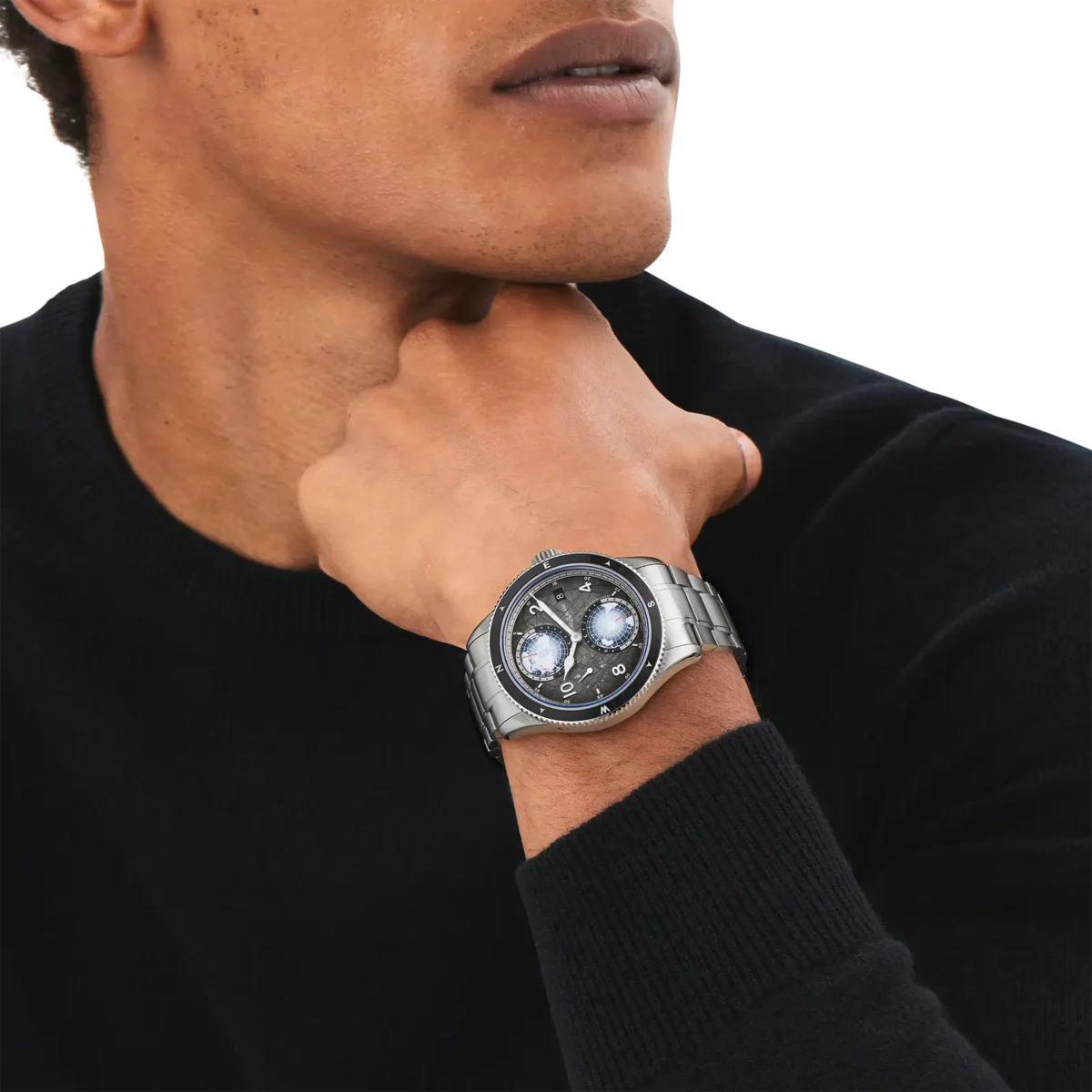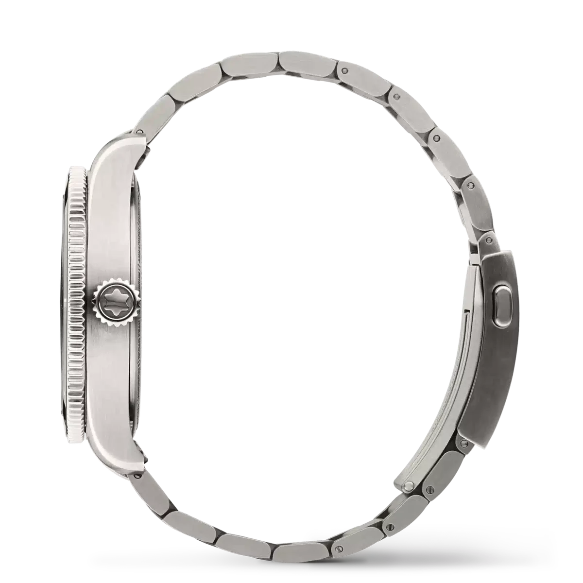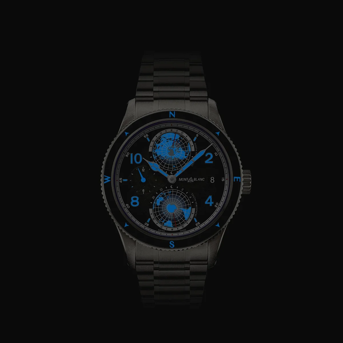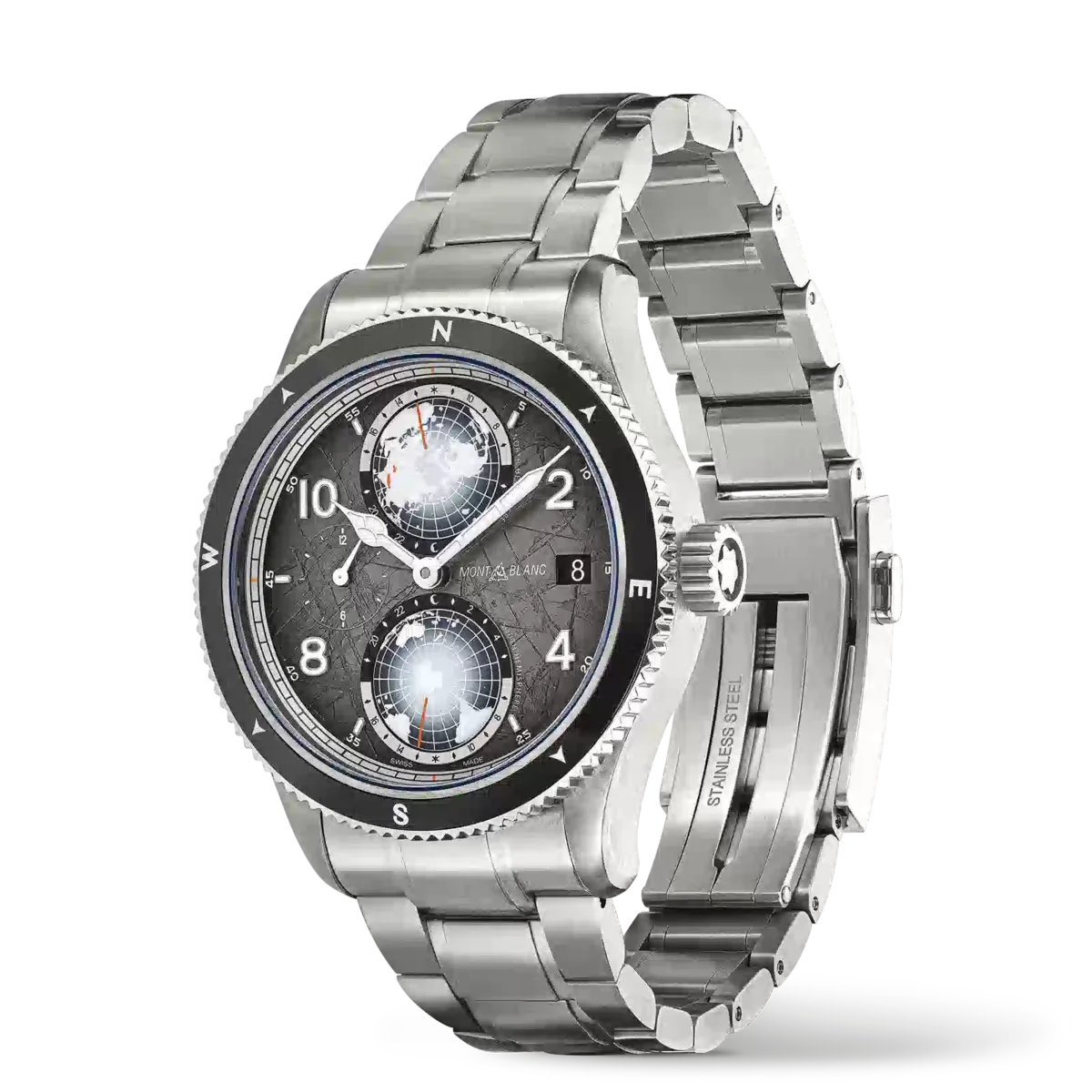 Montblanc 1858 Geosphere 0 Oxygen The 8000 är en hyllning till världens högsta bergstoppar och de alpinister som vågar bestiga dem under extrema förhållanden. Klockan har ett 42 mm titanboett som är helt syrefritt. Detta har flera fördelar för upptäcktsresande, eftersom det eliminerar imma och förhindrar oxidation, vilket gör att urverket håller mycket längre och med större precision. Klockan drivs av det automatiska urverket MB 29.25 med Manufacture Worldtime-komplikation, som inkluderar tiden för 24-timmarszonerna som kan avläsas på de självlysande kontinenterna på de 3D-roterande globarna för norra och södra halvklotet, dag- och nattindikeringar, dubbel tidsvisning och datum. Klockan har också en räfflad, dubbelriktad svart keramikring med självlysande kardinalpunkter, en sfumato mörkgrå urtavla med glaciärmönster och orange accenter samt ett utbytbart titanarmband med avsmalnande form och finjusteringssystem. Baksidan av boetten för denna modell har en 3D-lasergravering av berget K2 som är avbildat med otrolig färg, djup och realism. Identifikationsnummer MB130982
