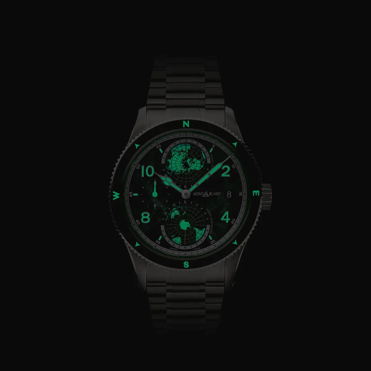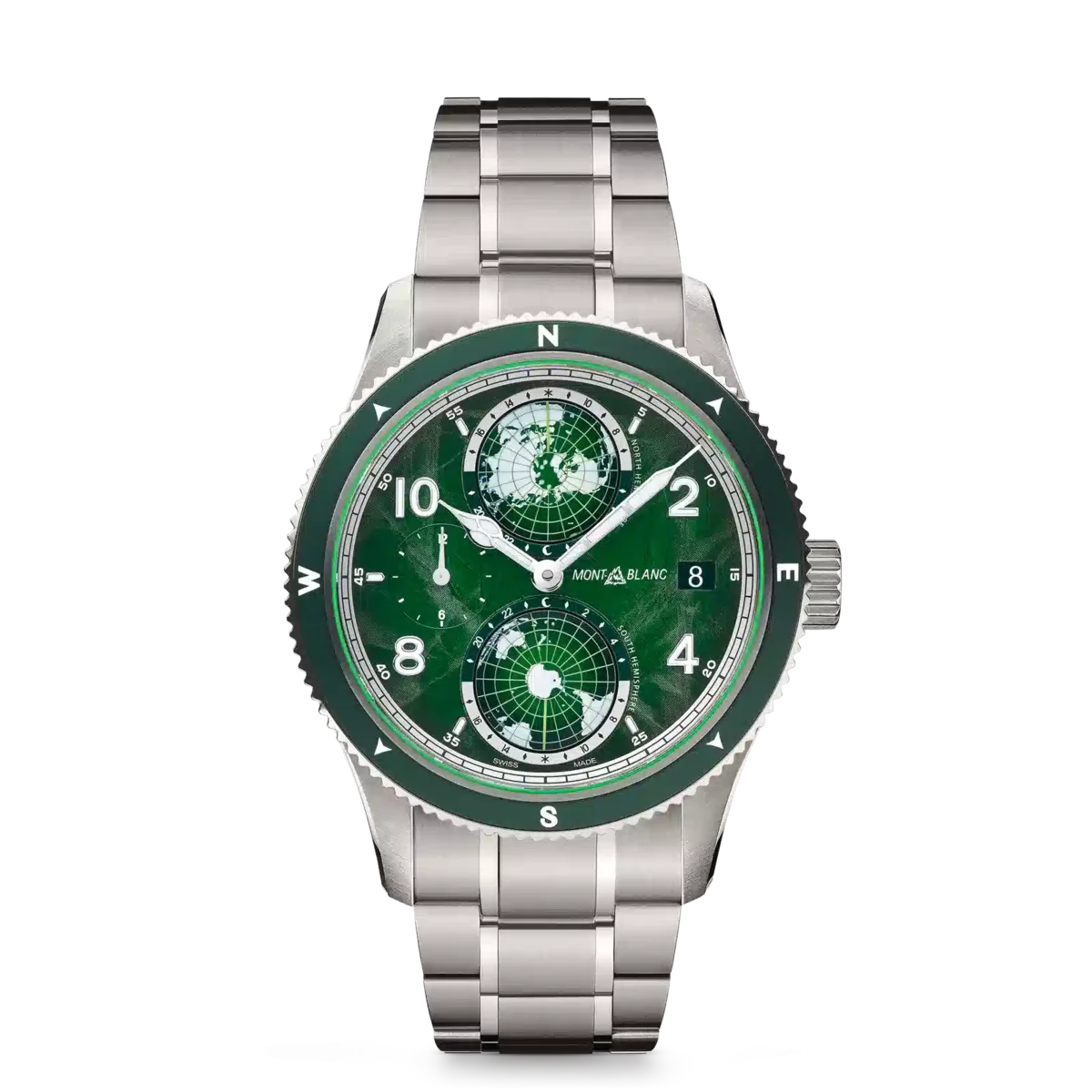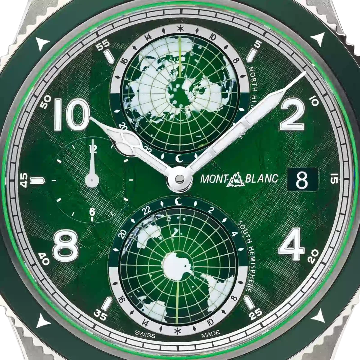 Den sfumato-gröna glaciärmönstrade urtavlan på denna Montblanc 1858 Geosphere 0 Oxygen fångar andan av bergsklättring och är inspirerad av den djupa gröna färgen på smaragdgröna isberg eller ”jadeberg”. Klockan har ett 42 mm rostfritt stålboett som är helt syrefritt med en räfflad, dubbelriktad, grönt anodiserad aluminiumring med självlysande kardinalpunkter. Den automatiska urverket drivs av kaliber MB 29.25 med Montblancs egenutvecklade världstidskomplikation och har roterande globar för norra och södra halvklotet, en 24-timmarsskala, dag- och nattindikering, dubbel tidsvisning och datum. En 3D-lasergravering i färg av Mont Blanc-berget på boettens baksida samt ett utbytbart stålarmband med avsmalnande form och finjusteringssystem kompletterar klockan. Identifikationsnummer MB133303