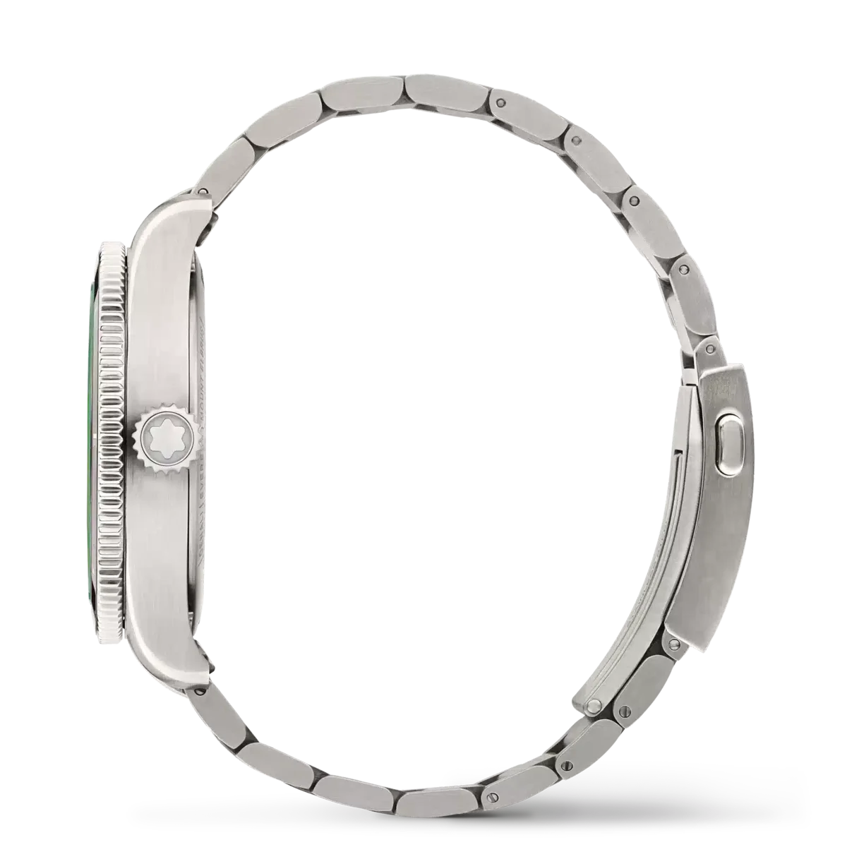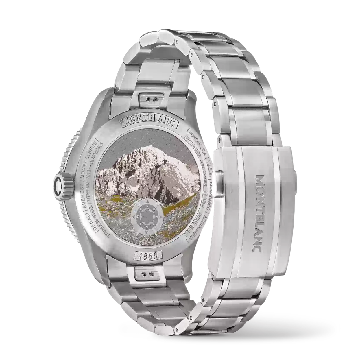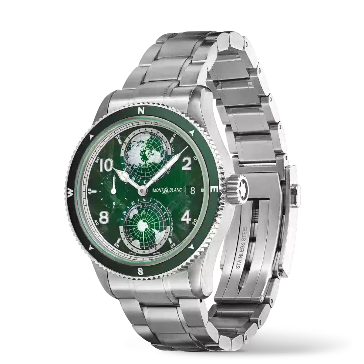 Den sfumato-gröna glaciärmönstrade urtavlan på denna Montblanc 1858 Geosphere 0 Oxygen fångar andan av bergsklättring och är inspirerad av den djupa gröna färgen på smaragdgröna isberg eller ”jadeberg”. Klockan har ett 42 mm rostfritt stålboett som är helt syrefritt med en räfflad, dubbelriktad, grönt anodiserad aluminiumring med självlysande kardinalpunkter. Den automatiska urverket drivs av kaliber MB 29.25 med Montblancs egenutvecklade världstidskomplikation och har roterande globar för norra och södra halvklotet, en 24-timmarsskala, dag- och nattindikering, dubbel tidsvisning och datum. En 3D-lasergravering i färg av Mont Blanc-berget på boettens baksida samt ett utbytbart stålarmband med avsmalnande form och finjusteringssystem kompletterar klockan. Identifikationsnummer MB133303