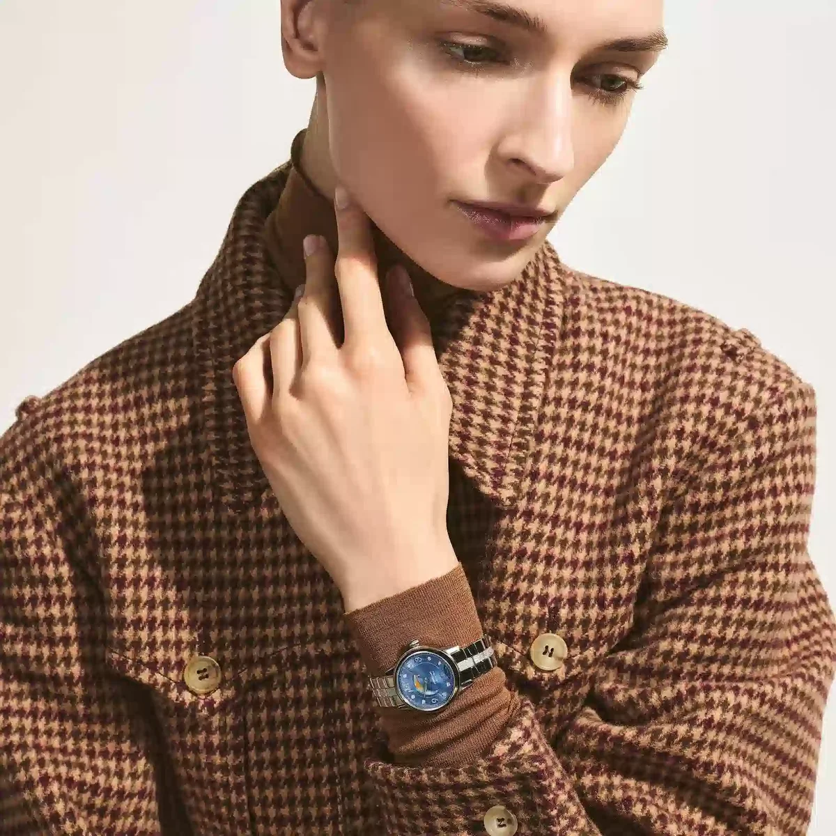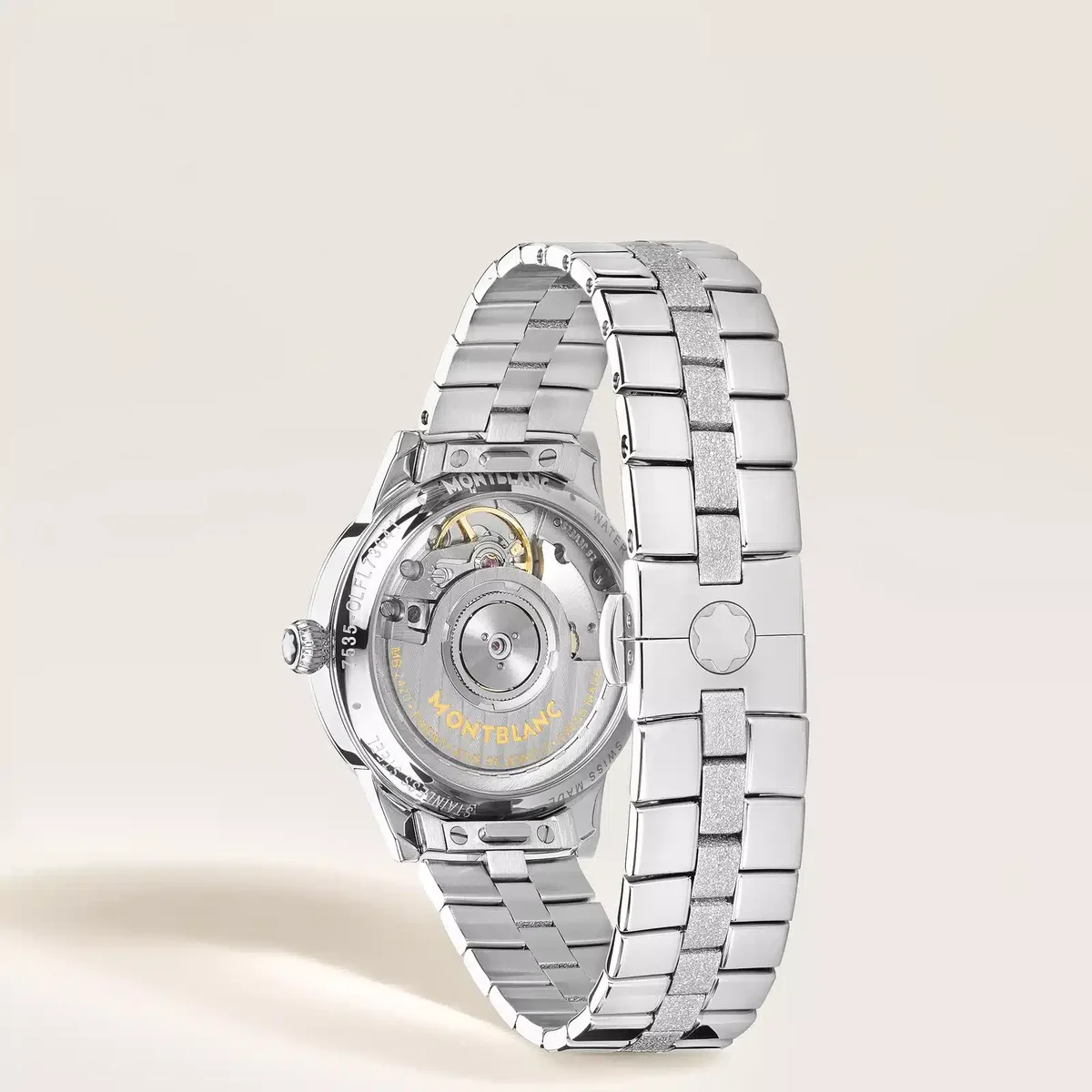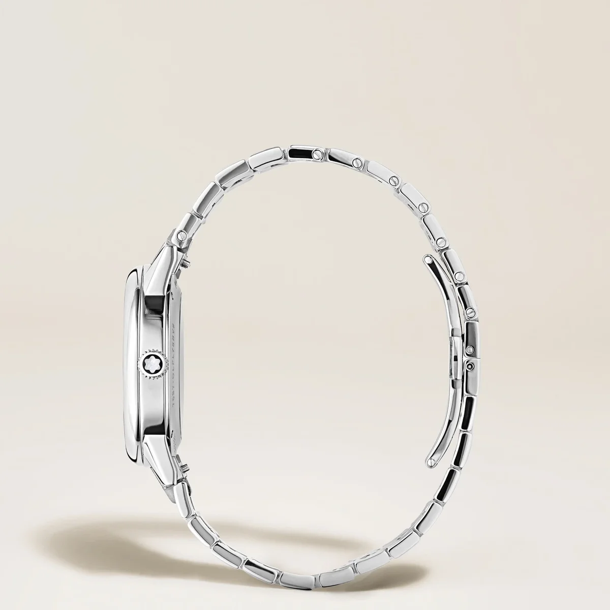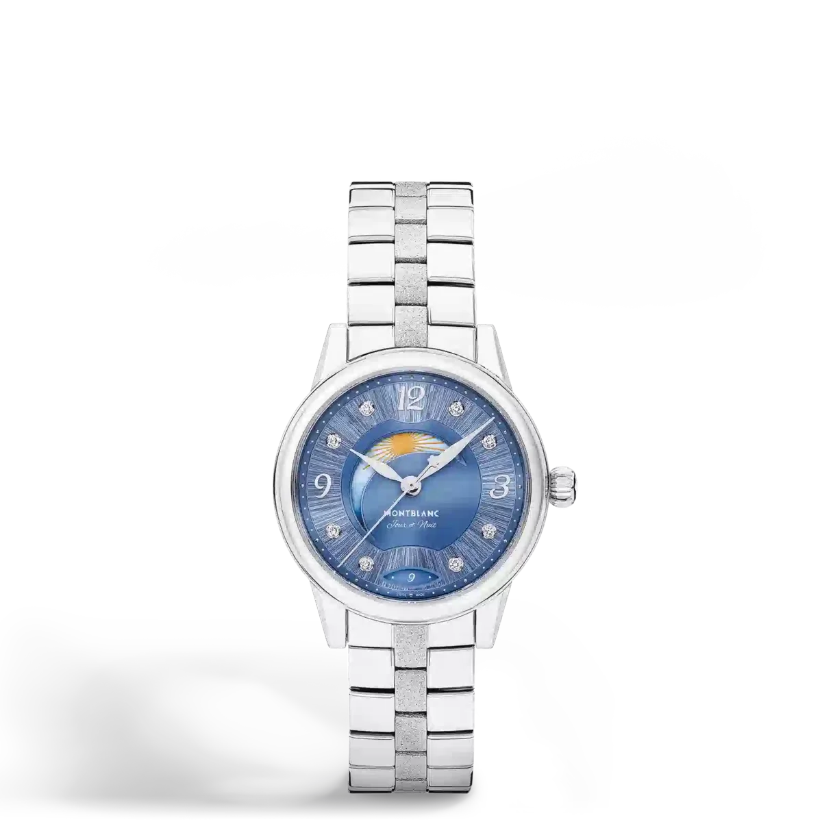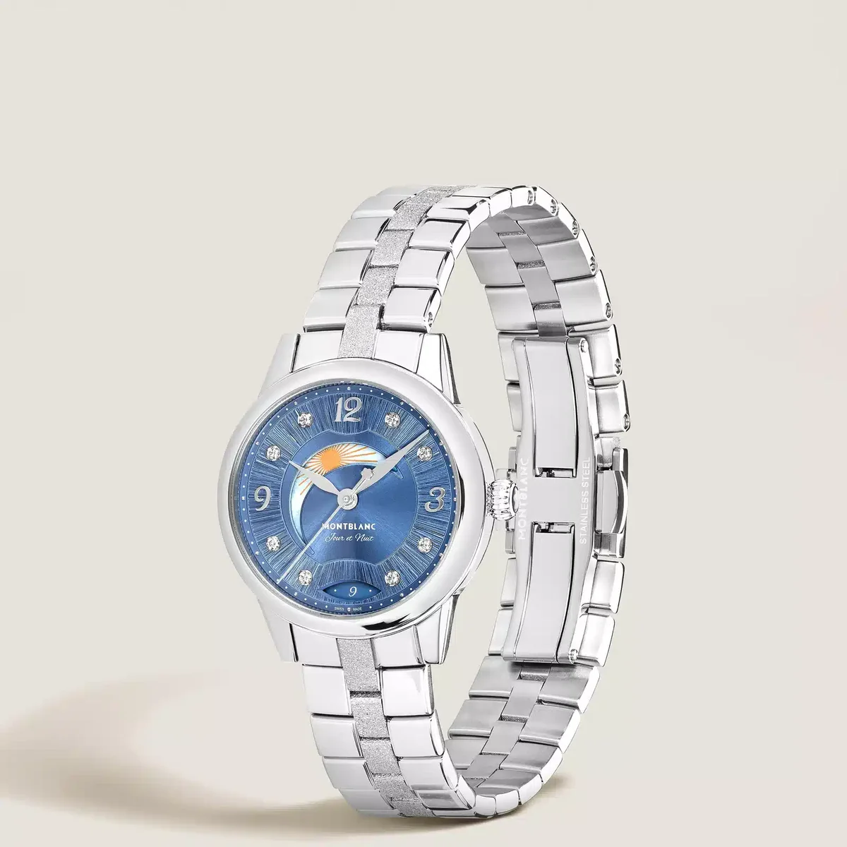 Montblanc Bohème Day & Night tolkar den fina urmakarkonsten på ett elegant och feminint sätt och är inspirerad av handskrift och akvarellmålning. Den har ett 30 mm rostfritt stålboett. Den har en elegant solborstad blå urtavla prydd med diamantindex, rodiumpläterade arabiska siffror och visare. Andra raffinerade detaljer inkluderar ett filet sauté-mönster och en stämplingsteknik som kallas filé d’étoiles. Denna modell är utrustad med det automatiska kaliber MB 24.20 och visar timmar, minuter och sekunder samt datumet i en mandelformad öppning med handskrivna siffror. Det romantiska typsnittet har också använts på urtavlan för dag- och nattangivelsen ”Jour et Nuit”. Den himmelska dag- och nattkomplikationen visar himlens förändring under ett dygn och ger klockan en romantisk och konstnärlig touch eftersom den är skapad med akvarellfärger. Klockan är utrustad med ett utbytbart armband i rostfritt stål med en strukturerad mittlänk och ett fint justeringssystem. Identifikationsnummer MB134342