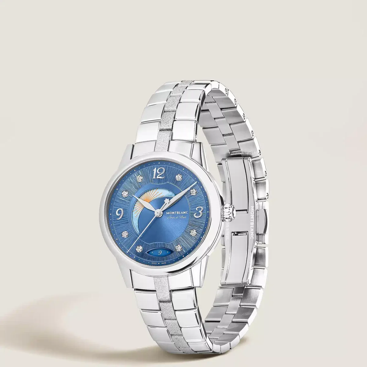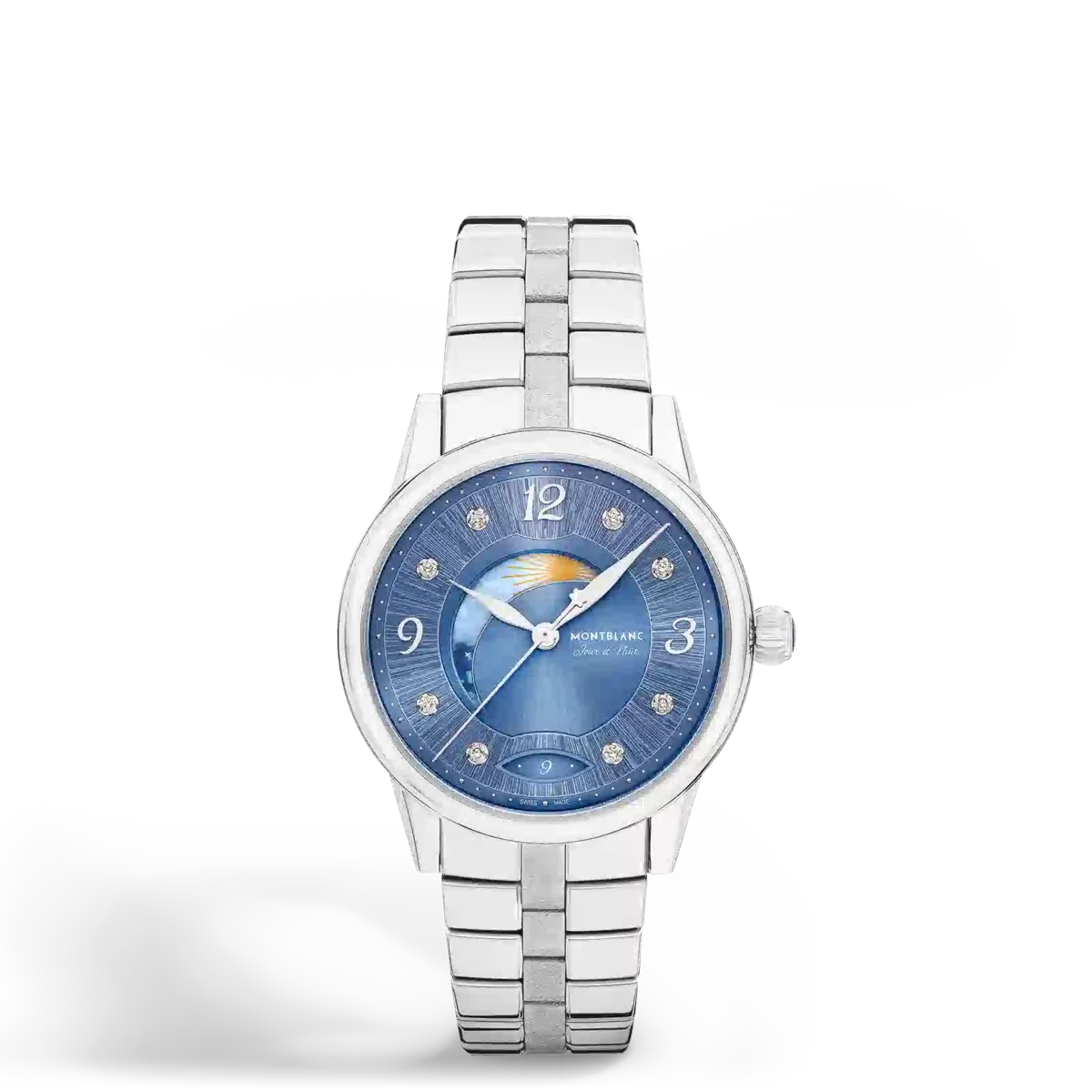 Montblanc Bohème Day & Night tolkar den fina urmakarkonsten på ett elegant och feminint sätt och är inspirerad av handskrift och akvarellmålningar. Den har ett 34 mm rostfritt stålboett. Den har en elegant solborstad blå urtavla prydd med diamantindex, rodiumpläterade arabiska siffror och visare. Andra raffinerade detaljer inkluderar ett filet sauté-mönster och en stämplingsteknik som kallas filé d’étoiles. Denna modell är utrustad med det automatiska kaliber MB 24.20 och visar timmar, minuter och sekunder samt datumet i en mandelformad öppning med handskrivna siffror. Det romantiska typsnittet har också använts på urtavlan för dag- och nattangivelsen ”Jour et Nuit”. Den himmelska dag- och nattkomplikationen visar himlens förändring under ett dygn och ger klockan en romantisk och konstnärlig touch eftersom den är skapad med akvarellfärger. Klockan är utrustad med ett utbytbart armband i rostfritt stål med en strukturerad mittlänk och ett fint justeringssystem. Identifikationsnummer MB134343