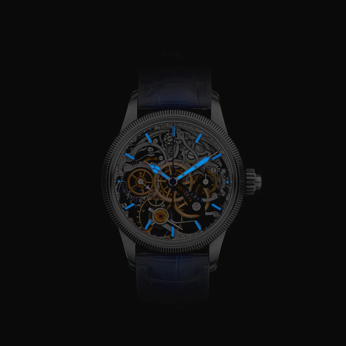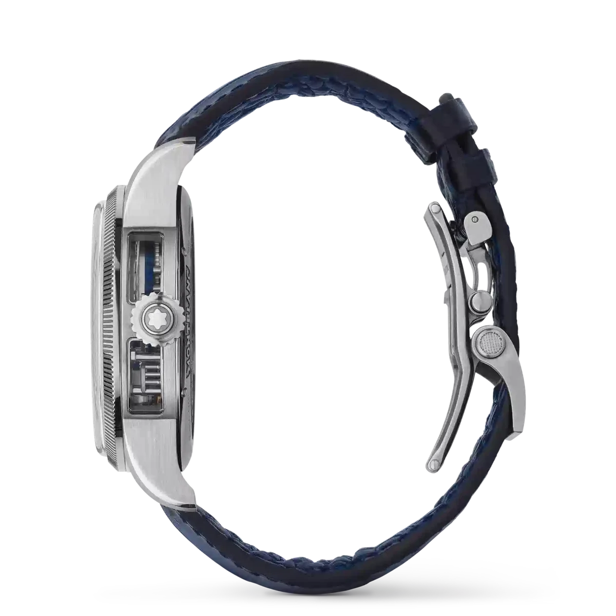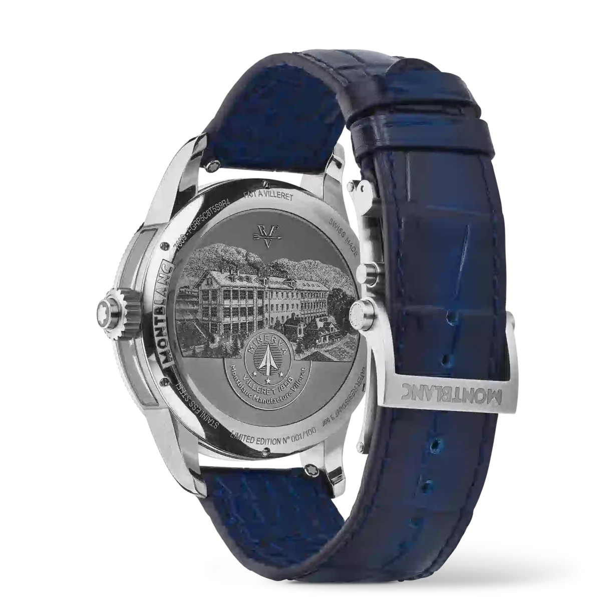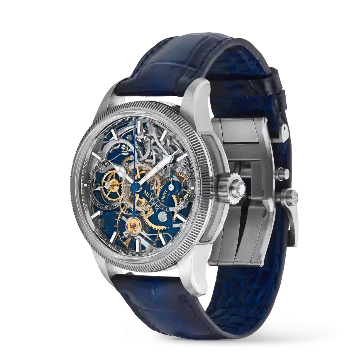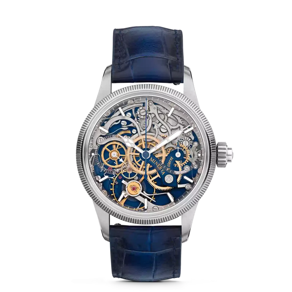 Montblanc 1858 Unveiled Minerva Chronograph Limited Edition har fem öppningar i boettens sidor, vilket gör att ljuset kan strömma in i det handfinishade, manuellt uppdragna Manufacture MB M17.26-uret som har vänds för att visa alla mekaniska funktioner på urtavlan. För att ögat ska kunna fördjupa sig i urverket och njuta av hantverket i de enskilda komponenterna har kronografkomplikationen konstruerats på pelare. Tyska silverplattor och broar har färgats blått för att ge klockan en extra modern touch. Denna begränsade upplaga har ett 43 mm rostfritt stålboett med en räfflad bezel i vitguld och en skeletturskiva i safirglas. Klockan kompletteras med ett blått utbytbart sfumato-kalvskinnsarmband med alligatorprint och ett trippelfällbart spänne i rostfritt stål. Identifikationsnummer MB133296. Bandbredd 22 mm.
