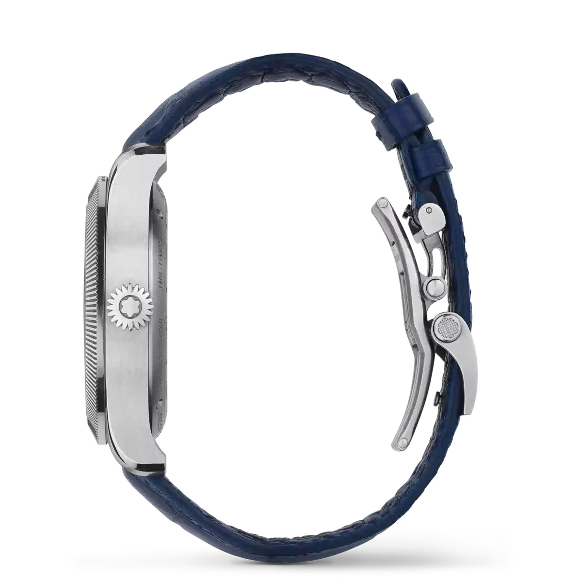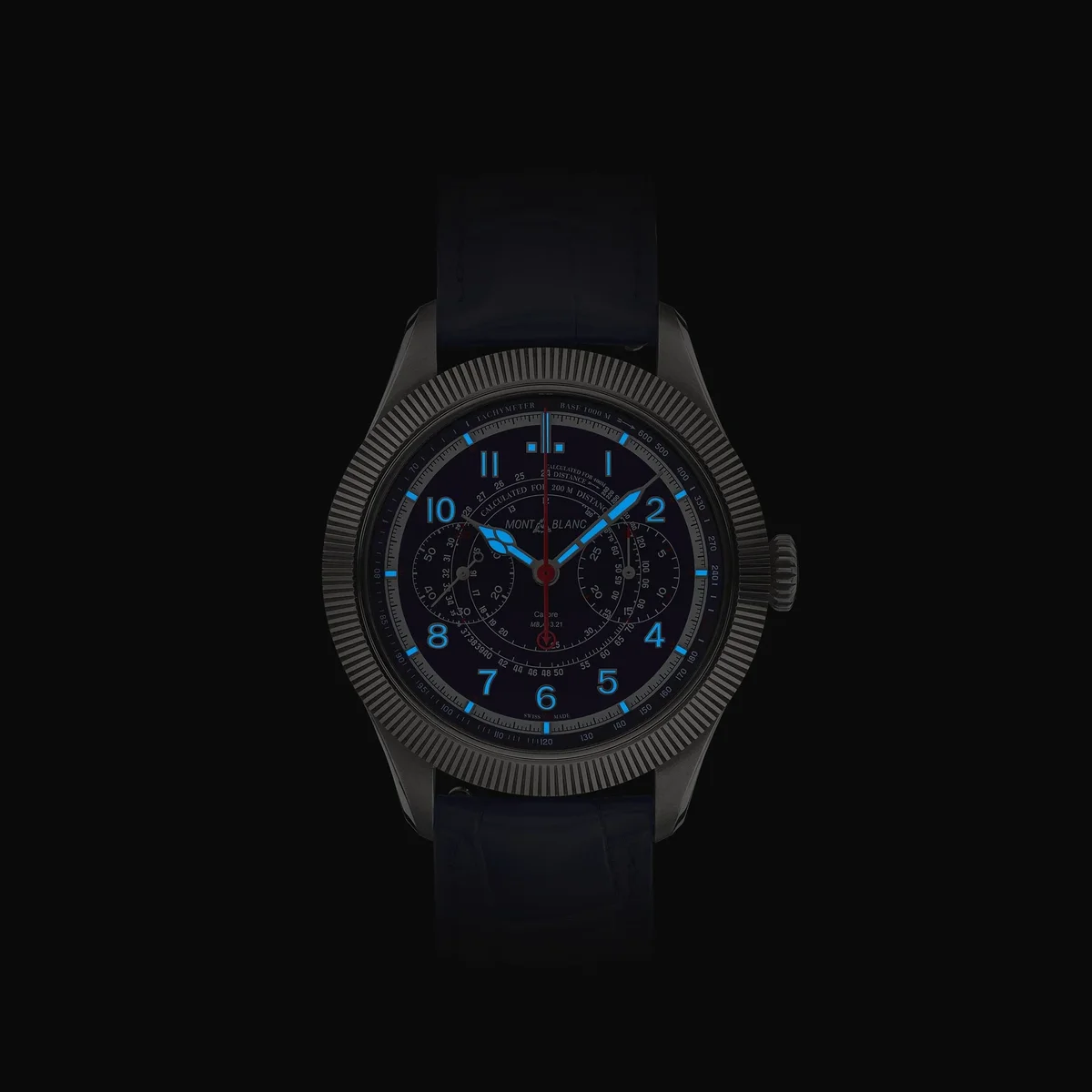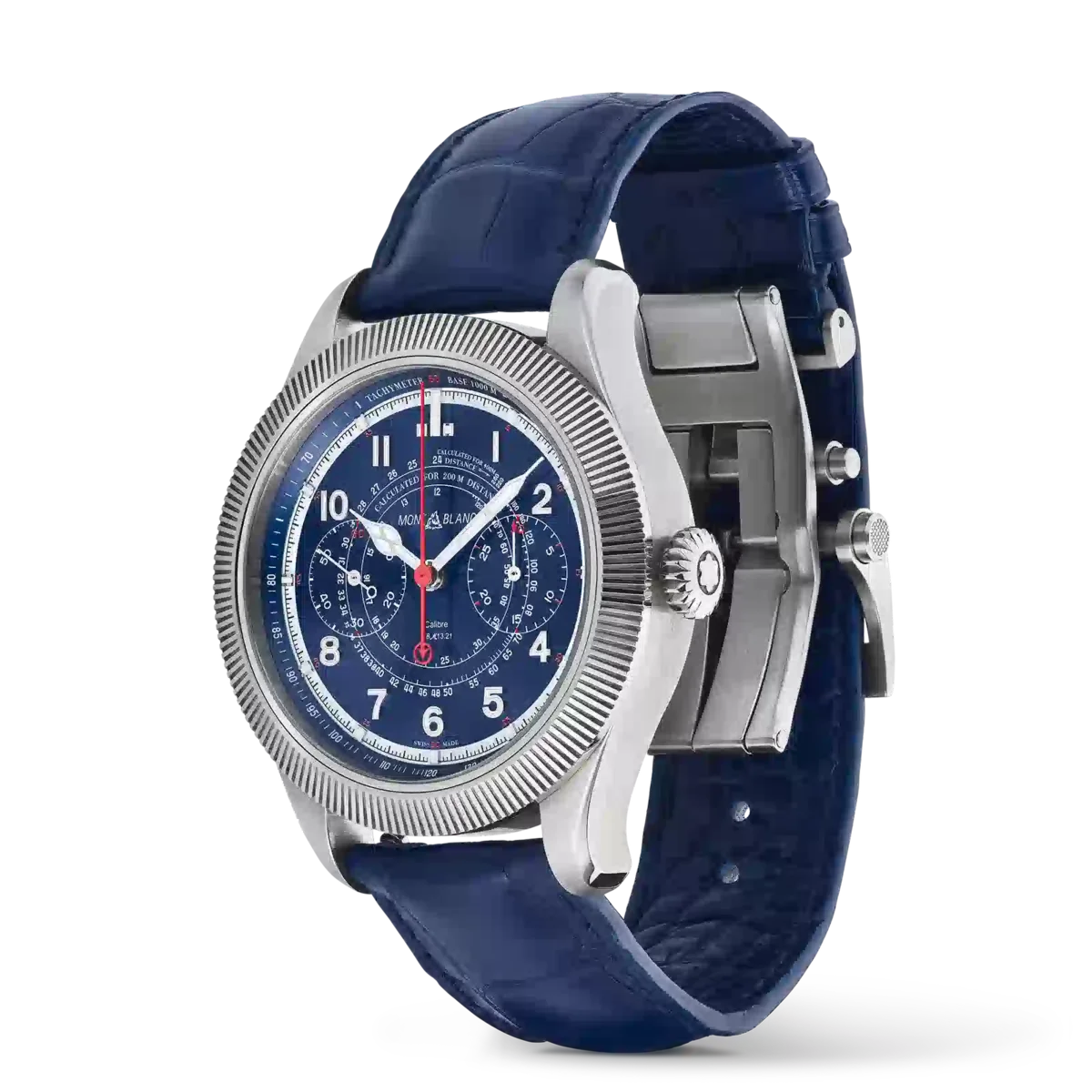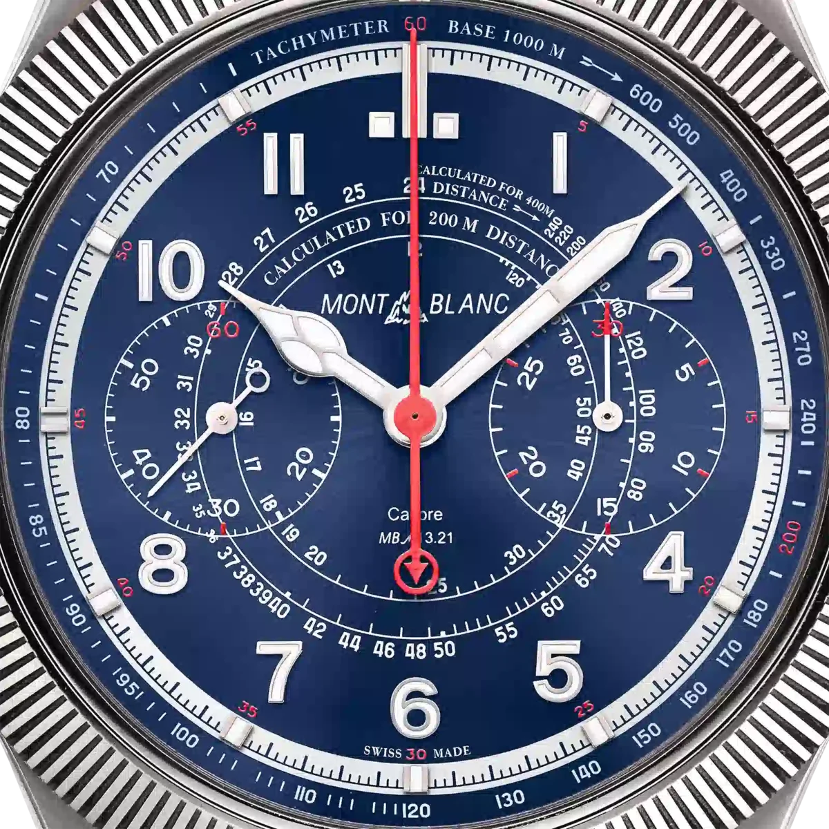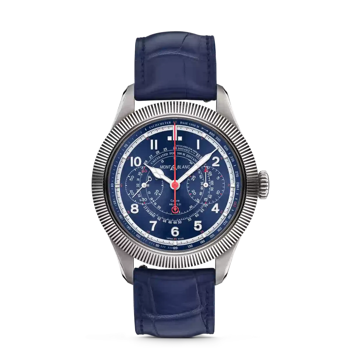 Montblanc 1858 Unveiled Timekeeper Minerva Limited Edition introducerar en helt ny kronograffunktion. Istället för traditionella tryckknappar aktiveras kronografen via den räfflade bezeln. Ett enda klick på den räfflade bezeln i 750/1000 vitguld (18 karat) startar kronografen. Ett andra klick stoppar den och ett tredje klick återställer den, vilket förvandlar kronografen som vi känner den. Klockan har ett 42,5 mm rostfritt stålboett och är försedd med en blå urtavla och ett blått utbytbart alligatorläderarmband. Den drivs av det handfinishade manuella urverket Caliber MB M13.21 och är begränsad till 100 exemplar med hänvisning till 100-årsjubileet av Caliber 13.20, som var föregångaren till detta urverk. Identifikationsnummer MB130987. Bandbredd 21 mm.