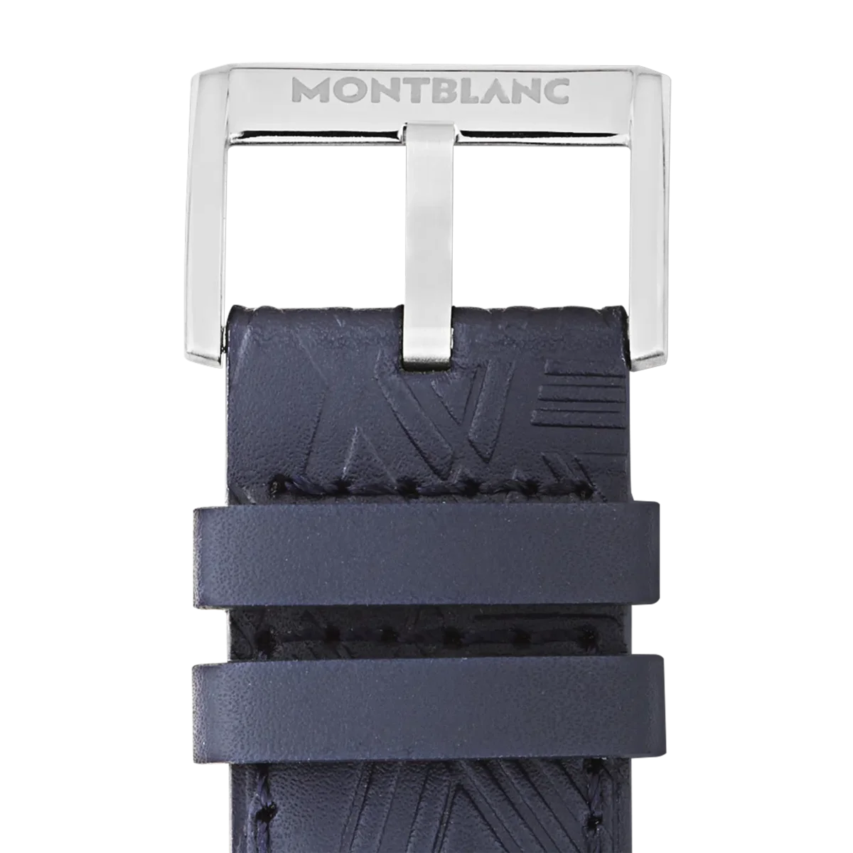 22 mm kalvskinnsrem med präglat Widmanstaetten-mönster, som även finns i Montblanc Starwalker Space Blue-kollektionen av skrivinstrument. Justerbar spänne i rostfritt stål. Kompatibel med alla Montblanc Summit-smartklockor.