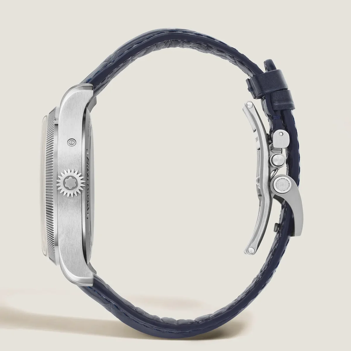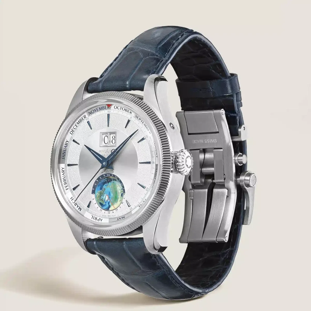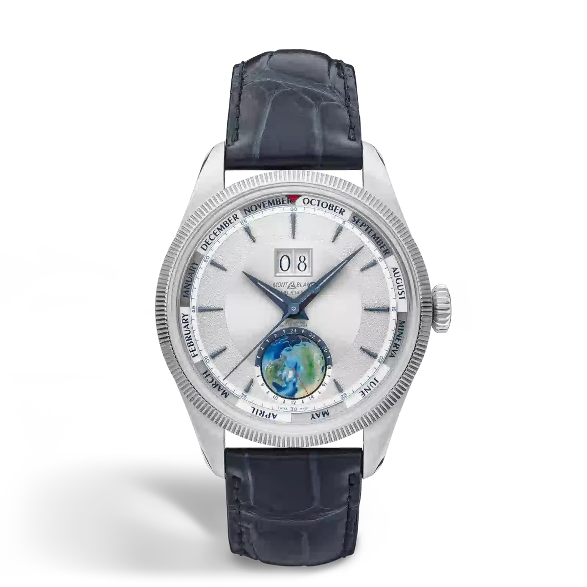 Montblanc 1858 Annual Calendar Geosphere Limited Edition är inspirerad av de estetiska koderna från Minervas arv från 1950-talet med sin silvervita solstråle och kornade urtavla med blåbelagda visare och index. Det 42 mm stora boettet i rostfritt stål är försett med en fast räfflad bezel i 750/1000 vitguld (18 karat) inspirerad av Minervas historiska klockor. Klockan drivs av ett handfinishat manuellt uppdragbart kaliber MB M14.58, med årskalender, stor datumvisning och världstidfunktion. För årskalenderfunktionerna är den stora datumvisningen placerad vid klockan 12 och har två stora öppningar placerade bredvid varandra, medan månaderna visas runt urtavlans periferi. Den visuella fokuspunkten för denna klocka är utan tvekan den handmålade, tredimensionella, roterande globen med norra halvklotet, dag- och nattindikering och en 24-timmarsskala. Klockan kompletteras med ett blått utbytbart kalvskinnsarmband med alligatorprint och ett trippelfällbart spänne i rostfritt stål med finjusteringssystem. Identifikationsnummer MB134026