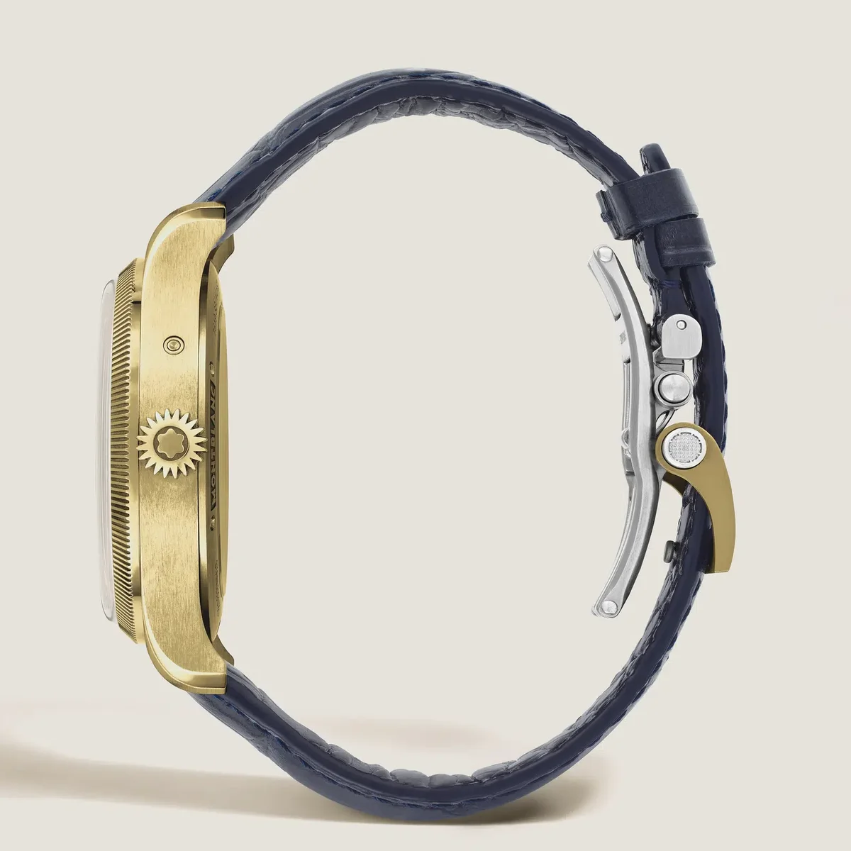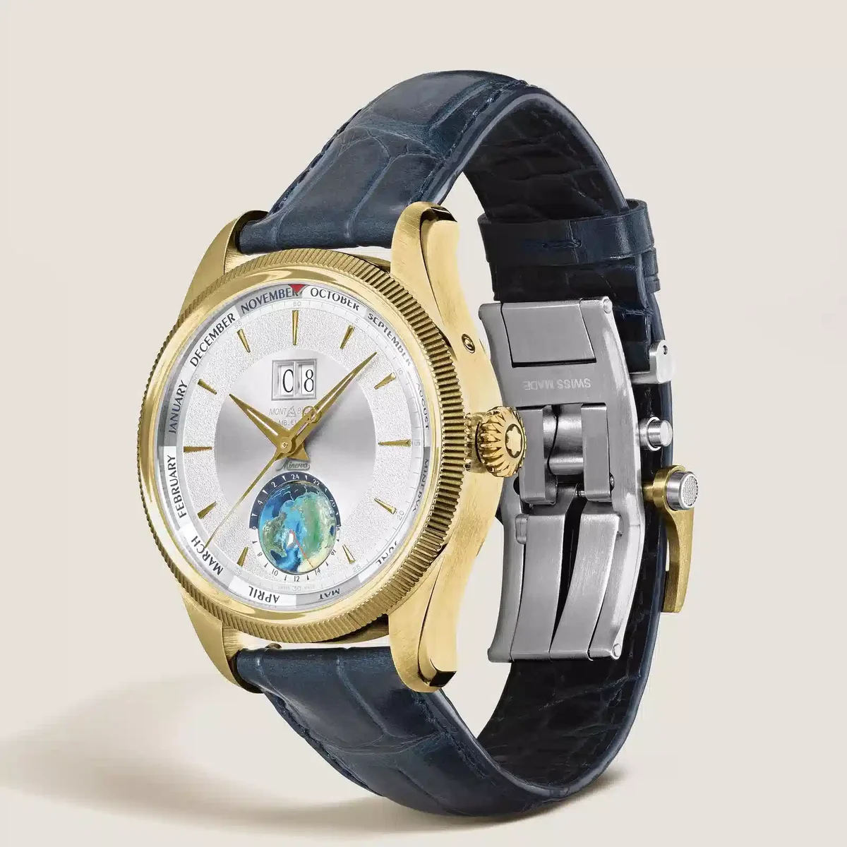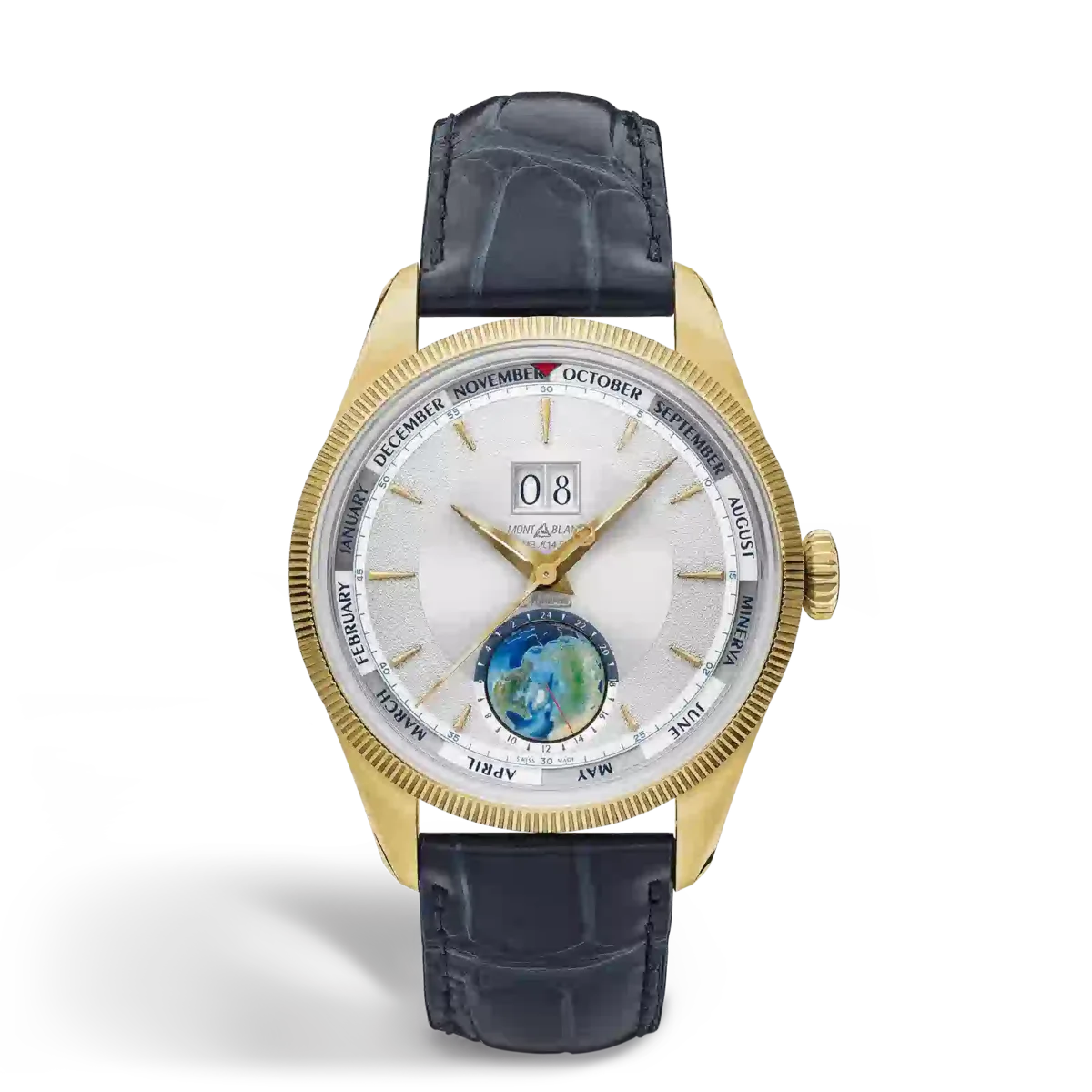 Montblanc 1858 Annual Calendar Geosphere Limited Edition är inspirerad av Minervas estetiska kod från 1950-talet med sin silvervita solstråle och kornade urtavla med gul guldbelagda visare och index. Boetten i 42 mm Lime Gold 750/1000 (18 karat) är försedd med en fast räfflad bezel inspirerad av Minervas historiska klockor. Klockan drivs av ett handfinishat manuellt uppdragbart kaliber MB M14.58 med årskalender, stor datumvisning och världstidfunktion. För årskalenderfunktionerna är det stora datumet placerat vid klockan 12 och har två stora öppningar placerade bredvid varandra, medan månaderna visas runt urtavlans periferi. Den visuella fokuspunkten för denna klocka är utan tvekan den handmålade, tredimensionella, roterande globen med norra halvklotet med dag- och nattindikering och en 24-timmarsskala. Klockan kompletteras med ett blått utbytbart kalvskinnsarmband med alligatorprint och ett trippelfällbart spänne i lime guld 750/1000 (18 karat) och rostfritt stål med finjusteringssystem. Identifikationsnummer MB134027