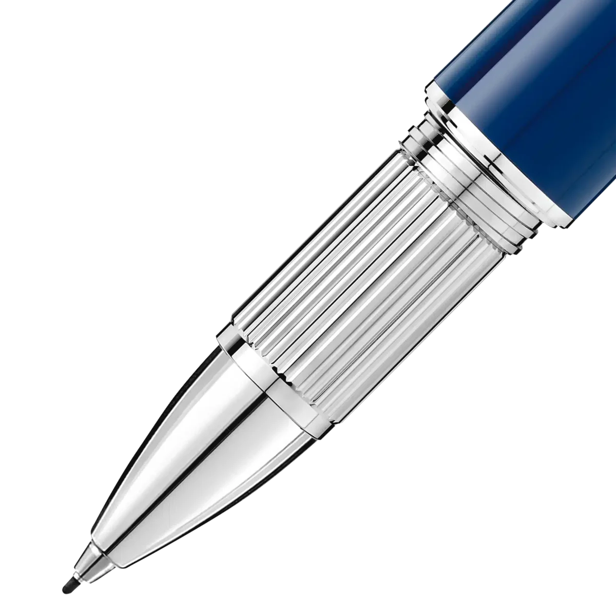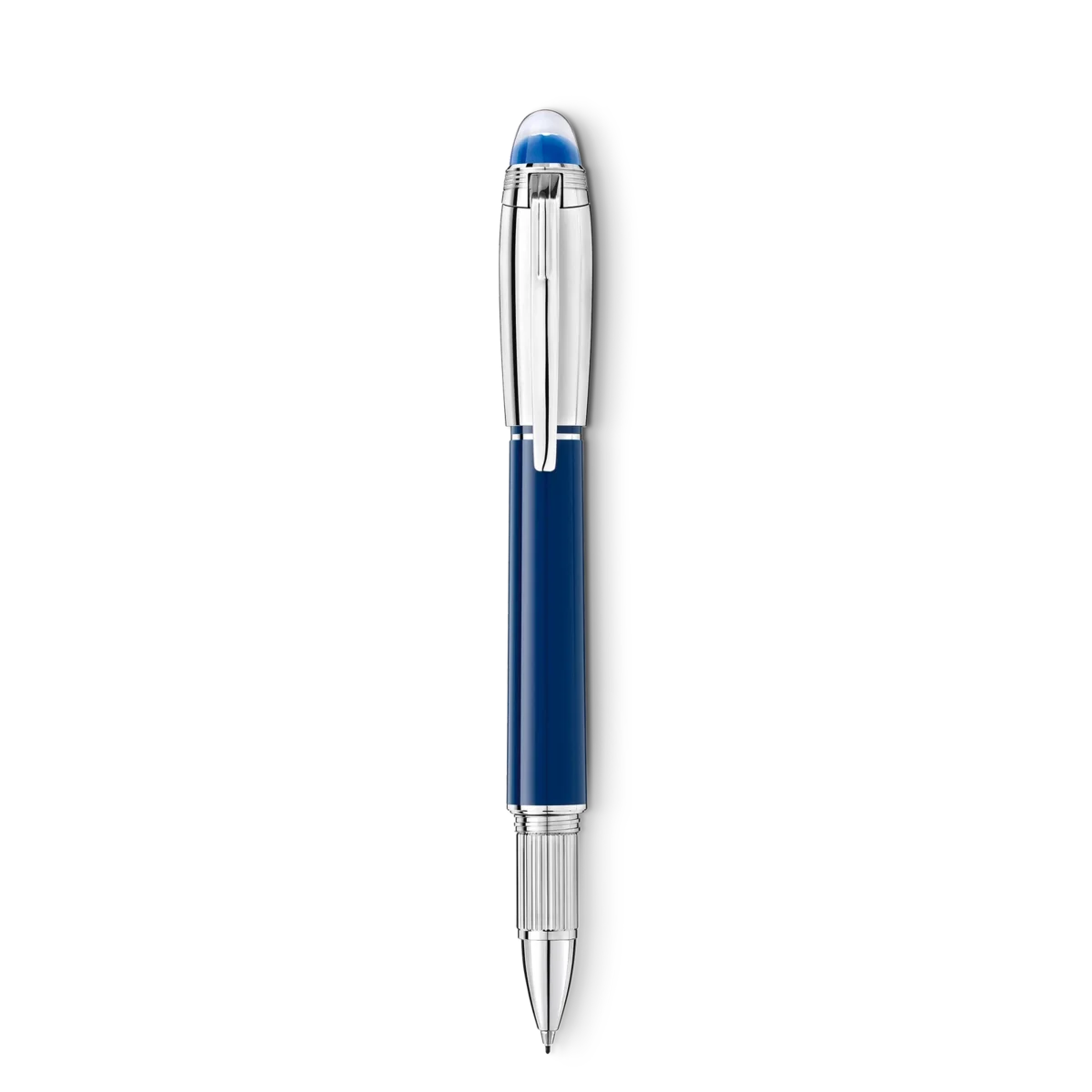 StarWalker Blue Planet handlar om att vandra bland stjärnorna, utforska kosmos och främmande galaxer och vara en del av ett av de mest mystiska och mäktiga äventyr som mänskligheten någonsin har gett sig ut på: utforskningen av rymden. När vi zoomar in på vår planet Jorden hämtar vi inspiration från vattnet, livets källa. StarWalker-emblemet har en blå genomskinlig kupol med en stjärna som svävar ovanpå, vilket representerar jorden som stiger upp över månens horisont sett från månen. StarWalker Blue Planet Doué Fineliner har en platinabelagd kåpa och beslag samt ett blått hölje av ädelharts. Identifikationsnummer MB132435 Fysisk vikt 36,62 g Mått 134,5 mm * 13,1 mm