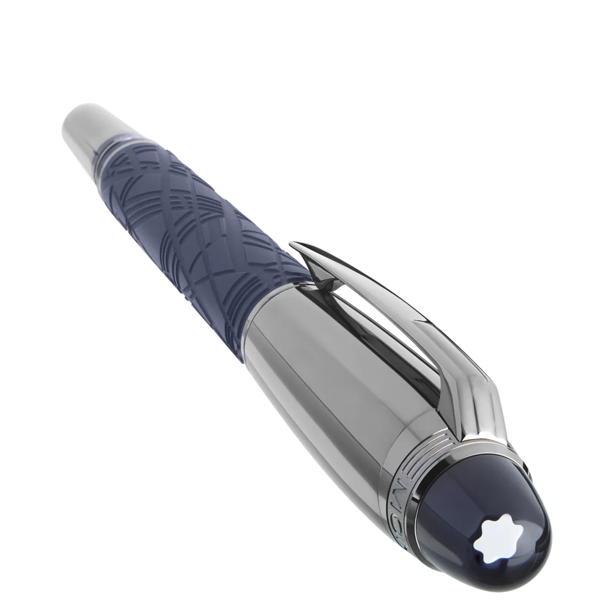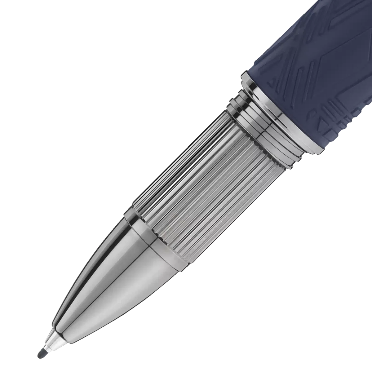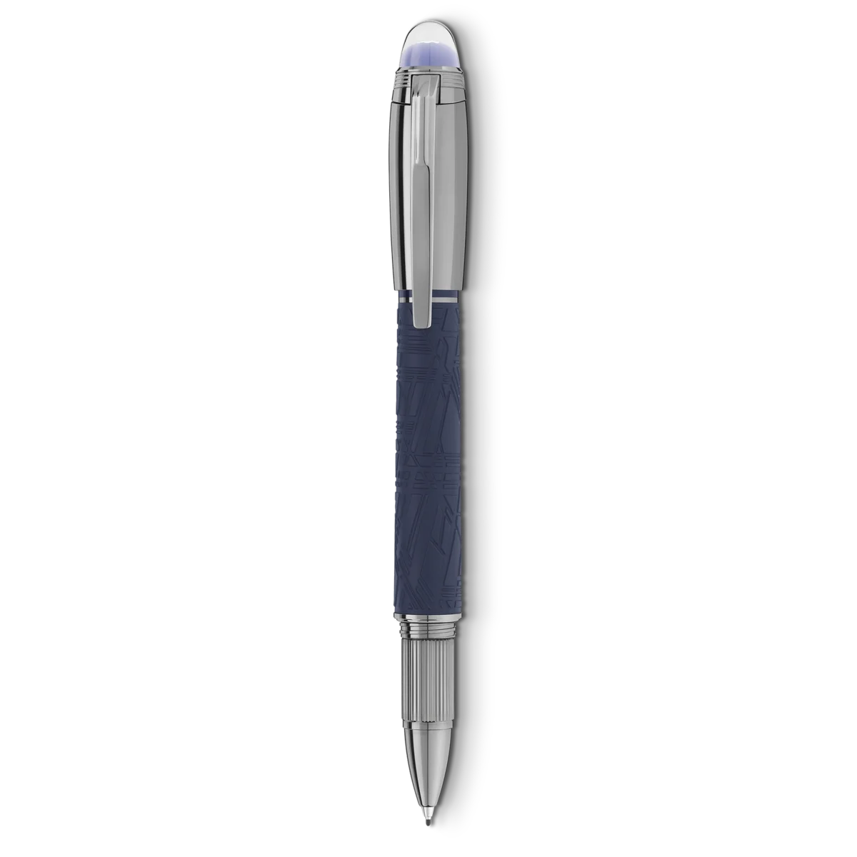 StarWalker SpaceBlue blickar bortom planeten Jorden och vänder sig mot stjärnorna och galaxen. Denna nya StarWalker-kollektion ger ett nytt utseende åt pennkroppen i harts, med en design som påminner om de intrikata strukturerna i Widmanstätten-mönstret, en av naturens mest hypnotiska skapelser. Alla metalldelar är belagda med mörkt rutenium, ackompanjerat av en djup rymdblå ton för den matta ädla hartsen, som påminner om nyanserna i en stjärnhimmel. Dessutom har subdomen på lockets ovansida, över vilken Montblanc-emblemet svävar, en djup rymdblå färg.