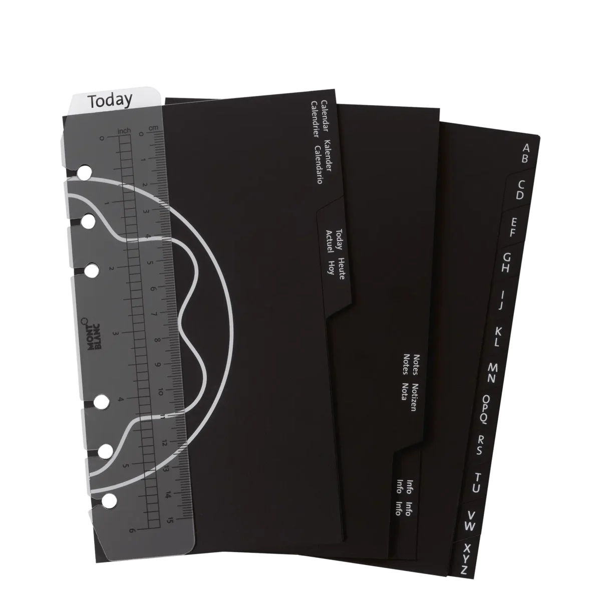 Set med avdelarark, linjal och genomskinlig plastmapp för den medelstora Montblanc-organisatören.