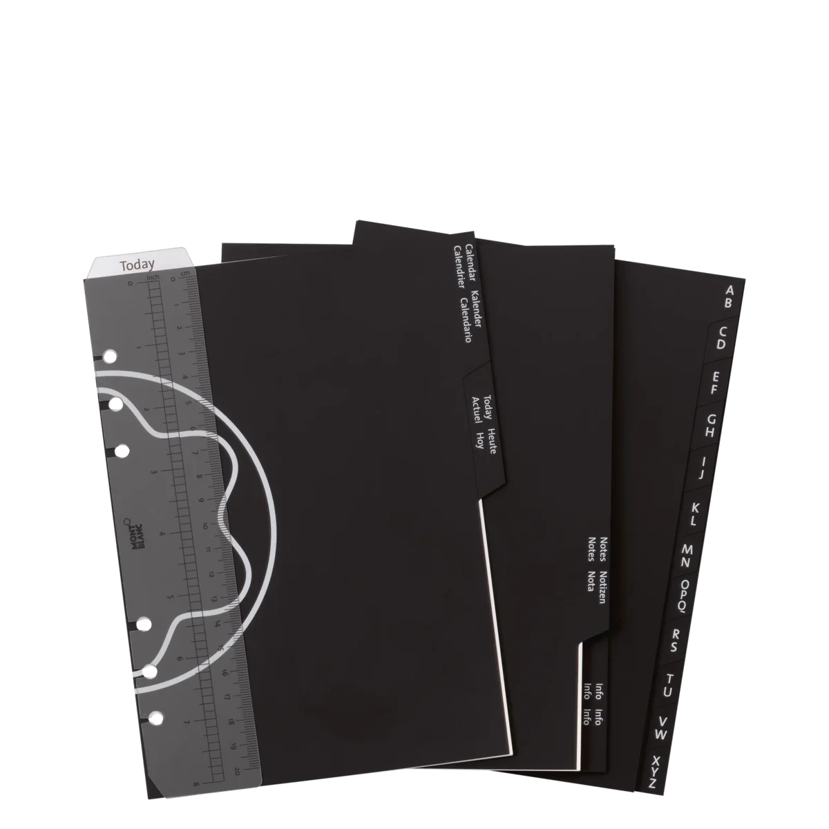Starter Kit Large. Set med avdelarark, tomma ark, adressark, världskarta, internationella riktnummer, butiksöversikt, linjal och 2 genomskinliga plastmappar för alla stora Montblanc-organiserare.