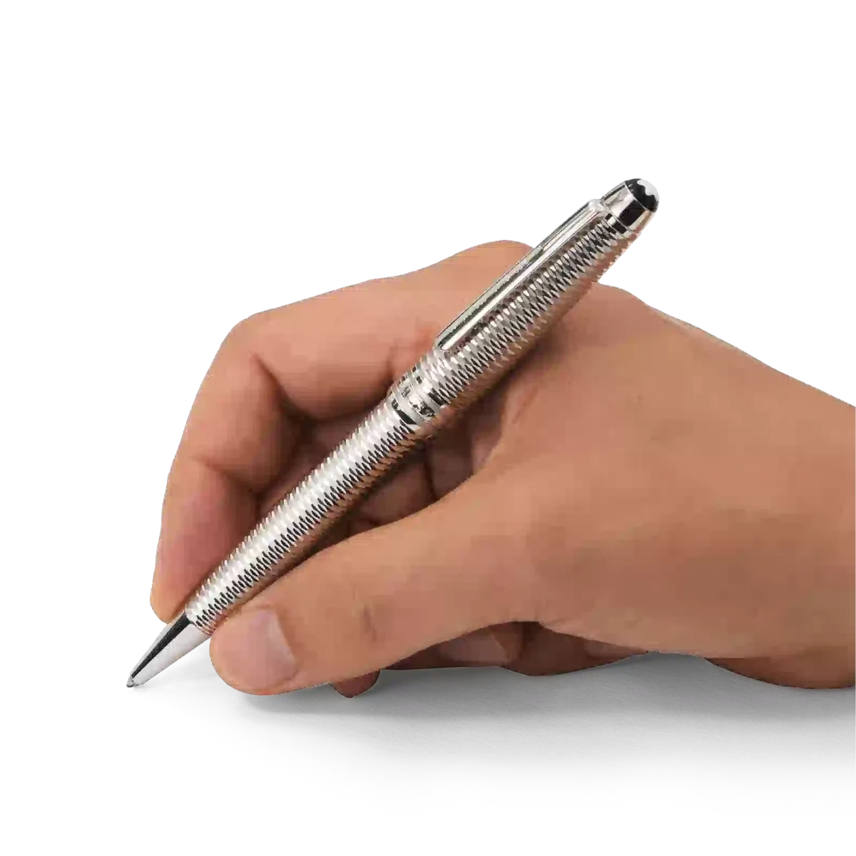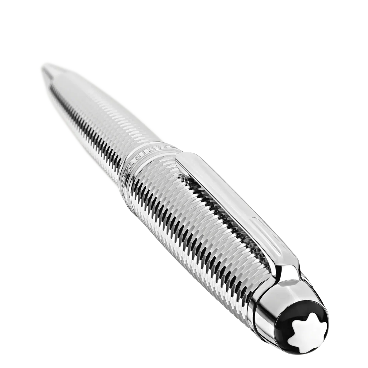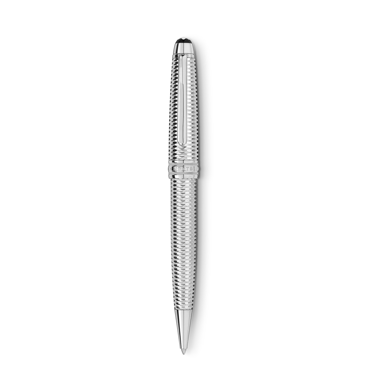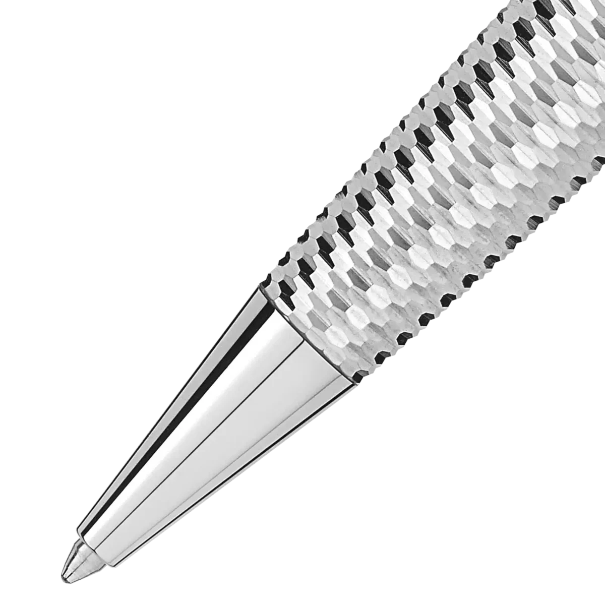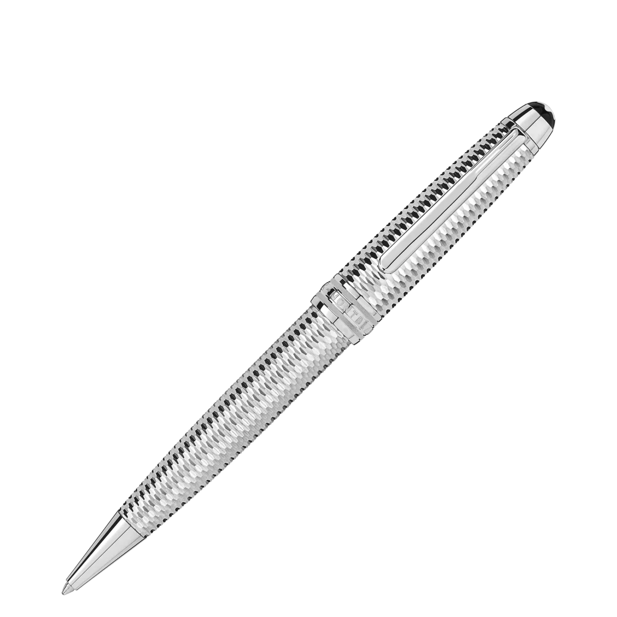 Meisterstück Solitaire Geometric Dimension föddes ur önskan att förena Montblancs klassiska design med unika material. Detta skrivinstrument, graverat med ett tredimensionellt geometriskt mönster med optisk effekt i en sofistikerad platinafärg, har en platinabelagd klämma och tre platinabelagda ringar med Montblancs varumärke ingraverat. Den är avslutad med Montblanc-emblemet och tilltalar individens personlighet.