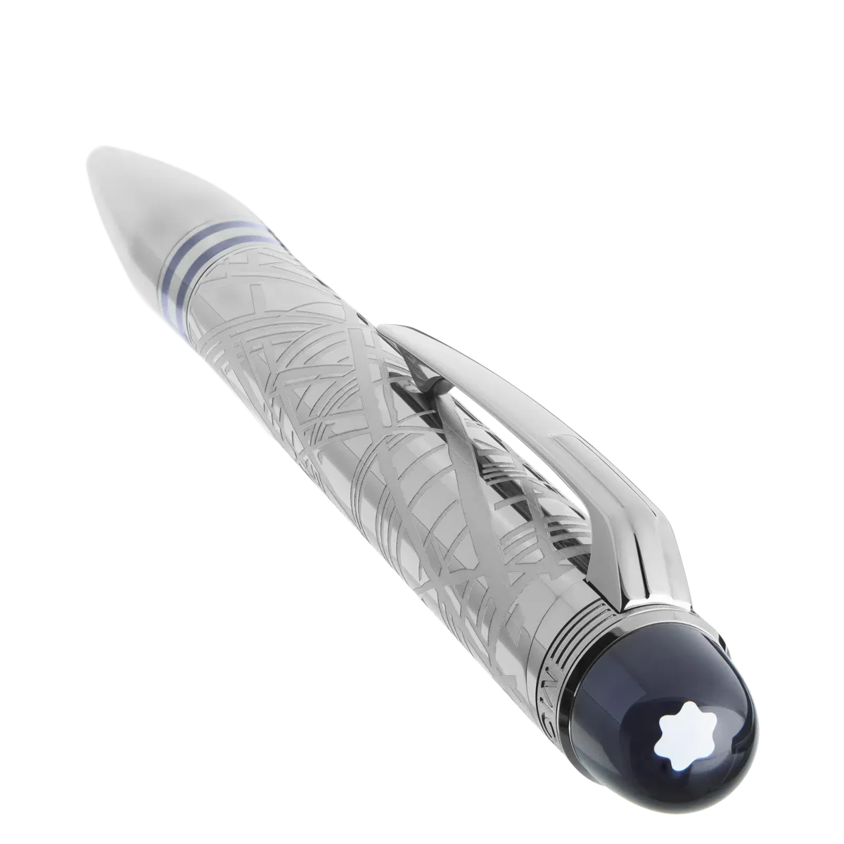 StarWalker SpaceBlue blickar bortom planeten Jorden och vänder sig mot stjärnorna och galaxen. Denna nya StarWalker-kollektion ger metallkroppen ett nytt utseende, med en design som påminner om de intrikata strukturerna i Widmanstätten-mönstret, en av naturens mest hypnotiska skapelser. Alla metalldelar är belagda med mörkt rutenium, åtföljt av en djup rymdblå subdome på lockets ovansida, som påminner om nyanserna i en stjärnhimmel, över vilken Montblanc-emblemet svävar.