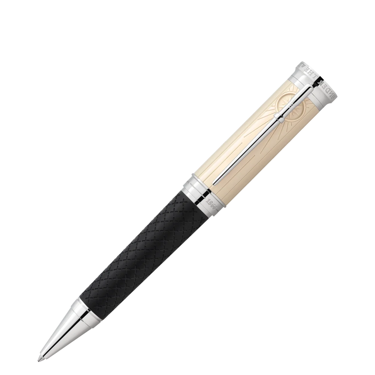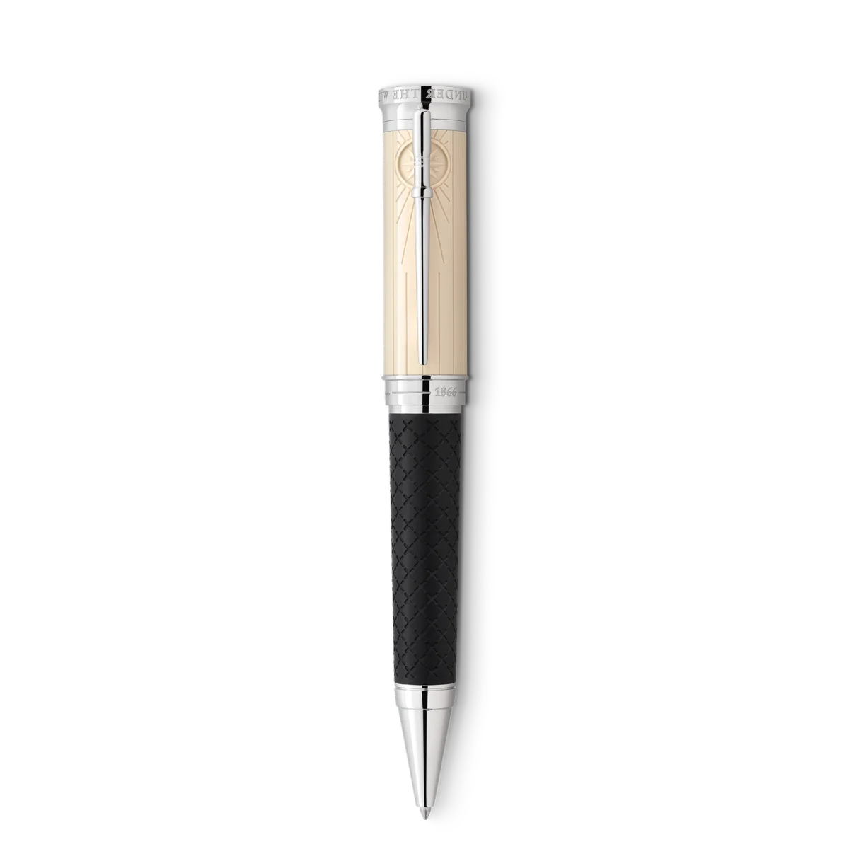 Robert Louis Stevenson, född i Edinburgh, Skottland, 1850, hade två stora önskningar: frihet och att fördjupa sig i andra världar. Han skrev essäer och reseskildringar samt sina legendariska äventyrsberättelser fyllda med slående karaktärer vars namn får läsare över hela världen att rysa: Long John Silver, kapten Flint, Jekyll och Hyde. Montblanc Writers Edition Homage to Robert Louis Stevenson är tillägnad denna fantasifulla berättare. Romanen ”Skattkammarön” har inspirerat många design detaljer i denna utgåva. Skrivinstrumentets övergripande form och ringarna på konen ger tillsammans intrycket av ett historiskt, utdragbart kikare. Den svarta pennkroppen i ädelharts är dekorerad med graverade kors, inklusive ett större ”X” som det som markerar skattens plats på en karta. Vertikala linjer som påminner om plankorna på skonaren ”Hispaniola” och en traditionell sjöskattkista pryder Writers Edition-kåpan. Bakom den platinabelagda klämman sammanstrålar linjerna i en kompassros, medan klämman imiterar formen på en beläggningspinne, där linorna i ett skepps rigg skulle fästas. Kapsylens topp kröns av Montblanc-emblemet med piratsymbolen, en dödskalle med korslagda ben, upphöjd i mitten. Kåpans ring är prydd med en gravyr av Stevensons signatur tillsammans med publiceringsdatumet för hans första verk ”The Pentland Rising”, 1866. Årtalen 1850-1894 är graverade på kåpan för att hedra Robert Louis Stevensons liv.