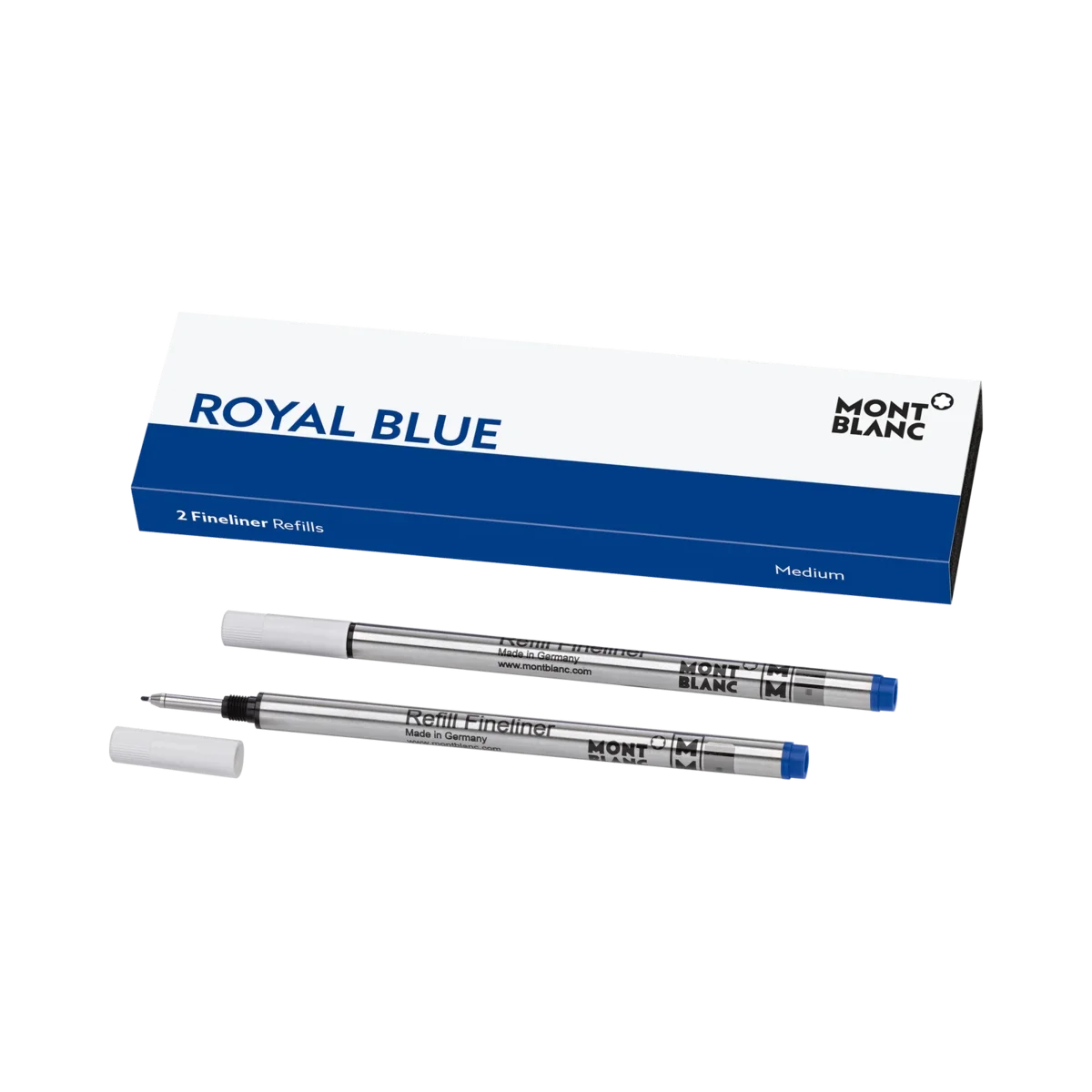 Montblanc Fineliner-refiller, Royal Blue. Passar alla Montblanc Fineliner/Rollerball-pennor utom Meisterstück LeGrand, Montblanc M och Heritage-kollektionens rollerball-pennor utan lock. Förpackningsenheter = 2 refiller. M = Medium