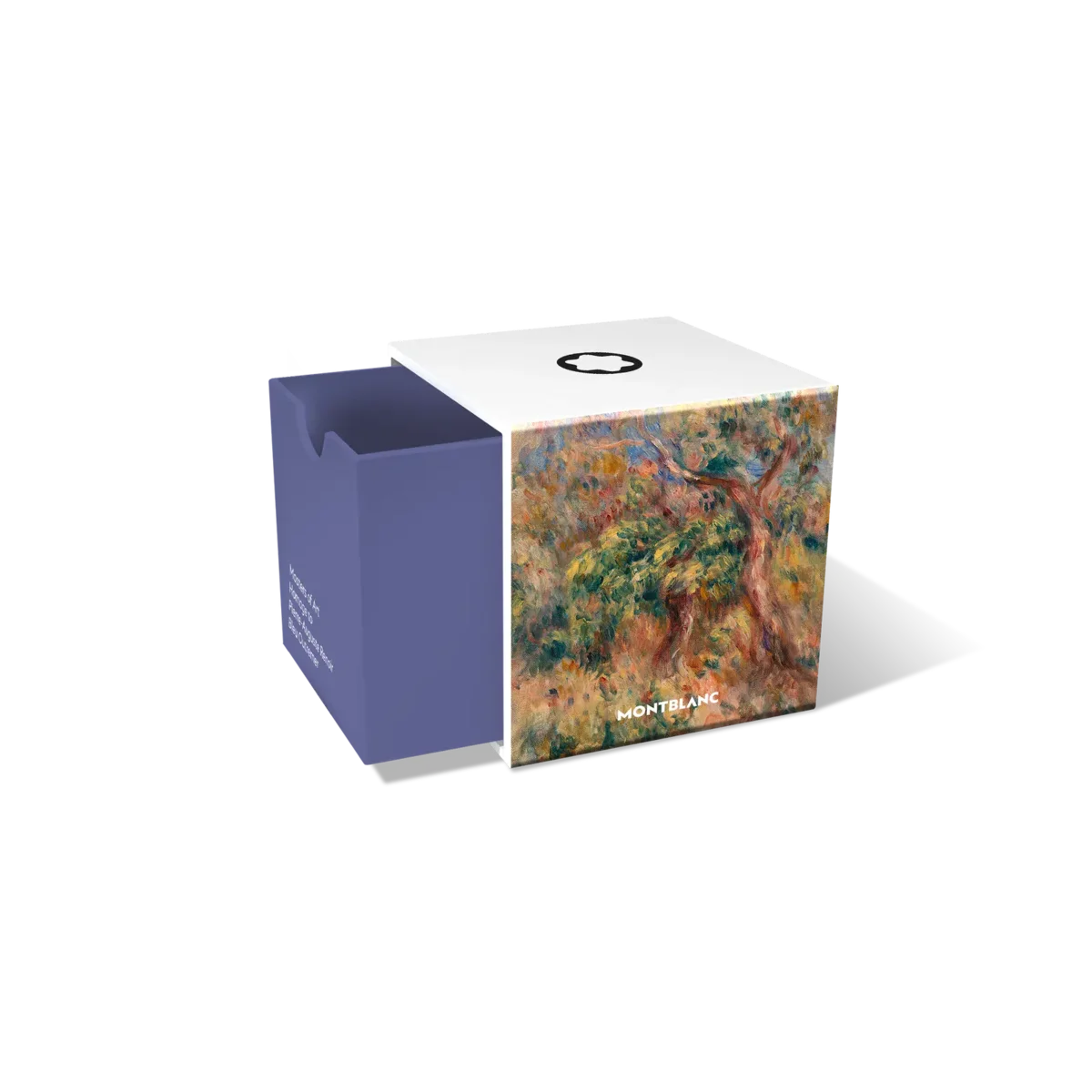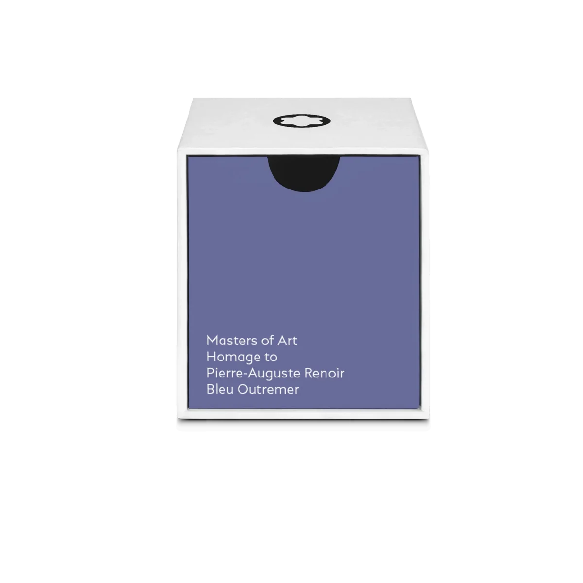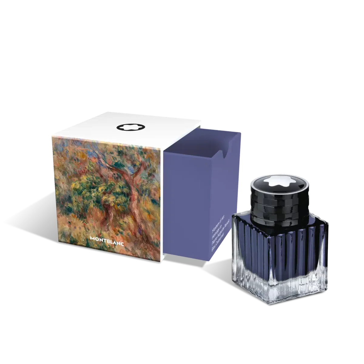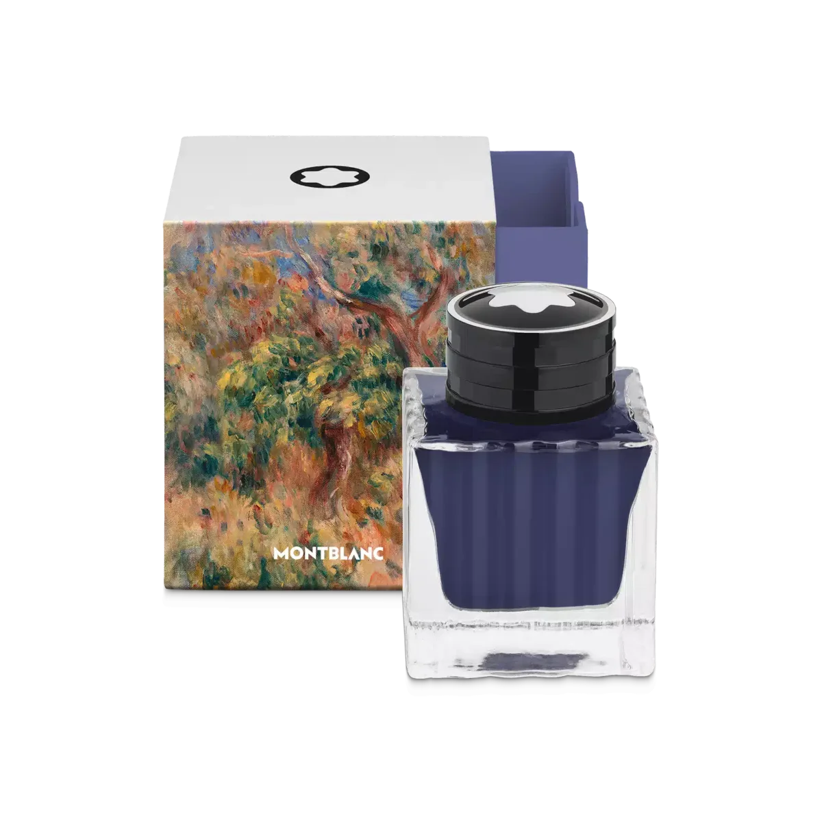 Montblanc bläckflaska, Masters of Art Homage to Pierre-Auguste Renoir, Bleu Outremer (ultramarinblå) – 50 ml Montblancs specialutgåva av bläckflaskor levereras i fyrkantiga förpackningar som återspeglar varje kollektions koncept och teman, vilket gör dem till värdefulla samlarobjekt för Montblanc-entusiaster.