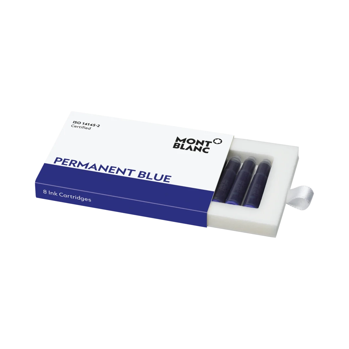 Passar alla Montblanc-reservoarpennor med patron-system. Montblanc Permanent-bläck, „Permanent Black“ och „Permanent Blue“, är testade enligt DIN ISO 14145-2 och är lämpliga för dokumentation. Förpackningsenheter = 8 patroner