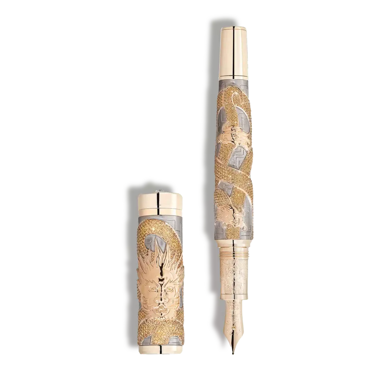 Montblanc tillägnar en mycket speciell begränsad upplaga till några drakar som har blivit några av de mest vördade i den östasiatiska kulturen. Den elfte i serien har Coiling Dragon Dragon som motiv. Den majestätiska Coiling Dragon slingrar sig sinuöst runt den solida Au 750 vitguldkåpan och pennkroppen som en skickligt och tålmodigt skapad handgravyr. I enlighet med traditionell kinesisk filosofi, där gult symboliserar jordens element och draken associeras med jorden på grund av sin kontroll över väder och natur, är kroppen helt täckt med noggrant utvalda gula safirer. För att matcha färgen på drakens kropp är dess ögon och konen täckta med ytterligare gula safirer, medan drakens huvud och klor är gjorda av massivt 750 guld. Ett handgraverat mönster, som symboliserar en kinesisk knut för att bringa lycka, berikar pennkroppen. Den handgjorda, massiva Au 750-guldspetsen, belagd med guld och försedd med en ljusgul safir, bär en delikat gravyr av en kinesisk paviljong omgiven av vatten till ära för det mytiska fenomenet Shen (蜃, som betyder hägring), en särskild typ av drake. Dessa strukturer fungerar som platser för lugn och meditation. Designen berikas ytterligare med en gravyr av drakens huvud på den massiva Au 750-signaturfördelen i guld, medan lockets topp kröns av Montblanc-diamanten, omgiven av briljantslipade diamanter.