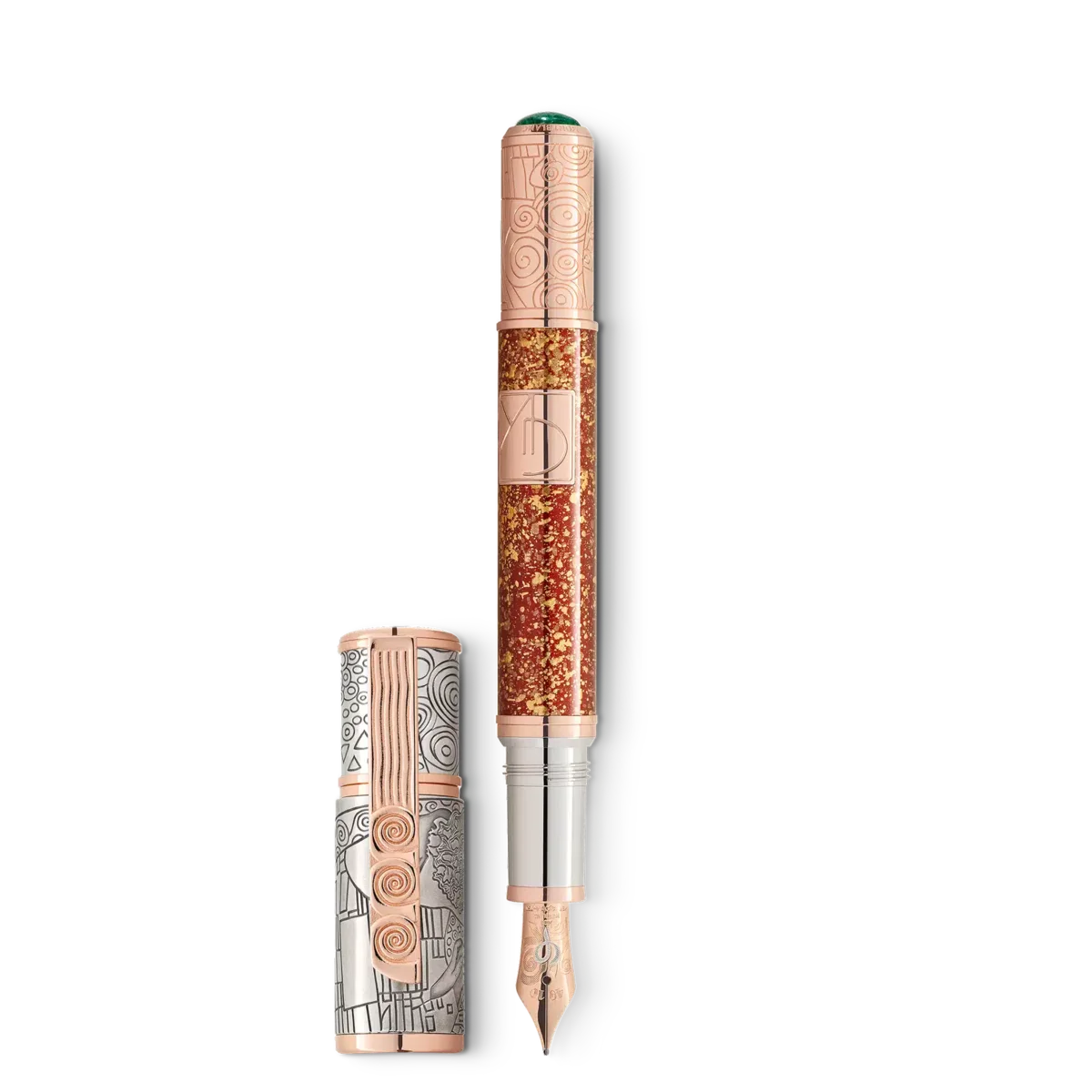 Genom historien har stora konstnärer uttryckt den mänskliga erfarenheten i ett universellt språk av form och skönhet. Montblanc Masters of Art Collection hedrar deras eviga bidrag till strävan efter perfektion inom konsten – en strävan som Montblanc både hyllar och deltar i. En konstnär vars vision bidrog till att forma den wienska jugendstilen och guldåldern är Gustav Klimt. Montblanc Masters of Art Homage to Gustav Klimt Limited Edition 161 hyllar hans berömda verk The Kiss och är tillägnat hans kärlek till japansk konst och kultur. Gustav Klimt drevs av en lust att experimentera med nya, ovanliga uttryckssätt. I sin strävan utvecklade han en fusion av realistisk representation, ornamentik och abstraktion som kulminerade 1909 i hans berömda, nästan mytiska målning The Kiss. Denna målning avslöjar Gustav Klimts passion för östasiatisk konst, som också överskuggar perspektivet till förmån för ornament, färg och harmoniska kurvor. Ornamenteringen från The Kiss inspirerade graveringarna på den solida Au 750 roséguldkonen på Homage to Gustav Klimt Limited Edition 161 och en del av Ag 925 sterlingsilverkåpan. De två älskande som förlorat sig i en kyss, det centrala motivet i Klimts målning, är skickligt graverade på locket. Klimts intresse för japanska lackeringstekniker har påverkat hans verk. Han beundrade de dekorativa guldutsmyckade verken från Rinpa-skolan, samlade ukiyo-e-träsnitt, japansk keramik och noh-masker och fusionerade deras tekniker med sin egen stil. En guldinfunderad aura, liknande den som omger de älskande i The Kiss, omger även pennkroppen. I många verk blandade Klimt sin färg med bladguld, polerade stenar och pärlemor. I The Kiss blandade han bladguld och oljeguld och använde till och med platina för vissa delar. I Limited Edition 161 berikas samspelet mellan Ag 925 sterlingsilver och massivt Au 750 guld av en grön aventurin-cabochon i konen, vars färg påminner om våren, säsongen för nya början. De lätt böjda linjerna på klämman, som slutar i tre spiraler, motsvarar dekorationen på den smidda metallramen i Klimts målning Athena. Spiralornamentiken, som är ett typiskt motiv på mykenska guldsmycken, är en hänvisning till Athenas grekiska hemland. På toppen av locket, i en solid Au 750 roséguldinfattning, minns Montblanc-emblemet i pärlemor de tre Montblanc-grundarnas vision, vars ambitiösa mål, precis som Klimts, var lika höga som glaciärerna som kröner Mont Blanc-toppen. Den handgjorda pennspetsen i massivt 750 guld på Homage to Gustav Klimt Limited Edition 161 är prydd med en konstnärlig dekoration av böjda linjer och spiraler som tillhör det typiska geometriska formspråket som används i många av Gustav Klimts verk. Ett särskilt praktfullt exempel finns i Livets träd, som är en del av Stocletfrisen som färdigställdes 1909. Inflätat i mönstret på pennspetsen finns tecknet för Phi, som symboliserar det irrationella talet 1,61 med sina oändliga decimaler. Det dikterar proportionerna i det gyllene snittet, som har påverkat utformningen av många av världens konstnärliga mästerverk och finns i många exempel i naturen. Gravyren på reservoarpennan och tillverkningen av exakt 161 exemplar i begränsad upplaga är en hyllning till detta ideala mått som förkroppsligar harmoni och estetik. Proportionerna mellan locket och pennkroppen är också inspirerade av det gyllene snittet. Identifikationsnummer MB130228 Fysisk vikt 113,9 g Mått 145 mm * 17,6 mm * 17,6 mm
