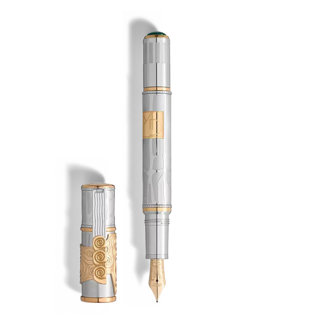 Genom historien har stora konstnärer uttryckt den mänskliga erfarenheten i ett universellt språk av form och skönhet. Montblanc Masters of Art Collection hedrar deras eviga bidrag till strävan efter perfektion inom konsten – en strävan som Montblanc både hyllar och deltar i. En konstnär vars vision bidrog till att forma den wienska jugendstilen och guldåldern är Gustav Klimt. Montblanc Masters of Art Homage to Gustav Klimt Limited Edition 888 hyllar hans aktiva engagemang i Wiener Secession och har designelement från hans Beethovenfris – det storskaliga mästerverket från hans ”gyllene period” som han skapade för Secessionsbyggnaden. Det reliefliknande överdraget i massivt Au 750 gult guld på den platinabelagda kåpan, med sina spiraler och vertikala linjer som symboliserar strängarna på en lyra, är en hänvisning till den gyllene ornamentiken i Beethovenfrisen samt dess lyraspelande poetiska figur, vars toner sägs stilla mänsklighetens längtan efter lycka. Tvådimensionella linjer inspirerade av fasadrelieferna på Secessionsbyggnaden lyser mot den matta bakgrunden på den platinabelagda kåpan och pennkroppen. Kombinationen av massivt Au 750 gult guld och platinabelagda element på kåpan och pennkroppen återspeglar de experimentella och lyxiga material som är typiska för Gustav Klimt. Samspelet berikas av en malakit-cabochon i konen. Malakitens gröna färg för tankarna till våren, säsongen för nya början. Som ett erkännande av Klimts insatser för Wiener Secession bär det massiva Au 750-guldinlägget på pennkroppen hans Secession-monogram med initialerna GK. Klämman på Homage to Gustav Klimt Limited Edition 888 är specialdesignad med hänvisning till Gustav Klimts Pallas Athene. Eftersom Athena är både krigets och konstens gudinna avbildas hon här när hon inleder kampen för konstnärlig frihet. De lätt böjda linjerna som slutar i tre spiraler på den delvis platinabelagda, delvis gulguldbelagda klämman på Limited Edition 888 motsvarar dekorationen på den smidda metallramen. Den handgjorda pennspetsen i massivt Au 750 gulguld på Homage to Gustav Klimt Limited Edition 888 är prydd med fint graverade grafiska element som bildar de typiska geometriska mönster som återfinns i många av Gustav Klimts verk.