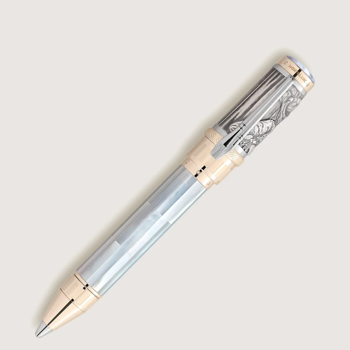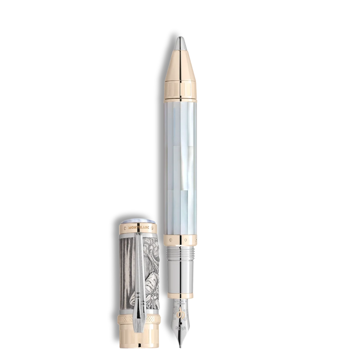 Genom historien har stora konstnärer uttryckt den mänskliga erfarenheten i ett universellt språk av form och skönhet. Montblanc Masters of Art Collection hedrar deras eviga bidrag till strävan efter perfektion inom konsten – en strävan som Montblanc både hyllar och deltar i. Pierre-Auguste Renoir är en av de mest framstående föregångarna inom modernismen, vars solfyllda målningar bidrog till att sätta tonen för en hel rörelse: impressionismen. Som en hyllning till denna viktiga pionjär inom fransk konst och hans mästerverk (såsom Dans på Moulin de la Galette från 1876 och Luncheon of the Boating Party från 1881) från hans så kallade ”période nacrée” – den pärlemorskimrande perioden – har Montblanc skapat Masters of Art Homage to Pierre-Auguste Renoir Limited Edition 161.Den skimrande pärlemorsglansen från denna ”pärlemorperiod” återspeglas i det okonventionella materialvalet för denna begränsade upplaga: tillverkad av massivt Au 750-guld och Ag 925-sterlingsilver, kombinerat med inläggningar av pärlemor, som bildats lager på lager under havets vågor. Den resulterande strukturen, där varje lager bryter ljuset och skapar ett iriserande färgspel, ger pärlemor en anmärkningsvärd hårdhet och estetisk attraktionskraft – egenskaper som gjorde det till ett av de mest fascinerande materialen för juvelerare under Belle Époque. Ett av Renoirs verk från den ”pärlemorskimrande perioden” är Kvinnan med hatt, som färdigställdes 1891. Den unga kvinnan bär en elegant hatt med breda brätten och verkar försjunken, kanske i en melodi, vilket återspeglar den mästerliga färgkompositionen som Renoir använder i detta porträtt: hennes fina drag, den något suddiga bakgrunden eller det vita i hennes volangblus som skiftar från ljusa silvertoner till mörkare guld och en delikat lila nyans. Denna färgpalett återspeglas i hela skrivinstrumentet: i Montblanc-emblemet av pärlemor som är infattat i den skimrande blåvioletta kalcedonen med ränder på den omsorgsfullt utformade lockets ovansida, i de massiva Au 750-guldbeslagen och det oöverträffade tredimensionella reliefen i Ag 925 sterlingsilver på locket, samt i pärlemorets iriserande inläggningar på pennkroppen. Kåpans ring, tillverkad av massivt Au 750-guld, är graverad med årtalet 1888, som markerar början på Renoirs ”pärlemorperiod”. En iögonfallande detalj är den platinabelagda klämman i form av två penslar, av den typ som Renoir använde för att skapa både de fina detaljerna och de mer expansiva ytorna som utgjorde hans mästerverk.Som en hyllning till Renoirs teckningskonst är en silverpenna av mjukt sterlingsilver Ag 925 integrerad i den massiva konen av 750 guld, vilket gör det möjligt att skapa egna silverpenneskisser. Renoir använde en kombination av måleritekniker under sin ”pärlemorperiod” för att skapa motivet till ”Unga flickor vid pianot”. För att betona balansen och den estetiska attraktionen i scenen lät Renoir sig vägledas av principen om det gyllene snittet. Denna ”gudomliga proportion” (1,618…), som lovar perfekt skönhet med matematiska medel, återfinns både i naturen och i kompositionen av många av världens mest beundrade konstverk – och beskriver också förhållandet mellan lockets och pennkroppens storlek i Masters of Art-samlarserien. Nyckeln till harmoni symboliseras av den grekiska bokstaven Phi, som pryder den delvis rodiumbelagda, handgjorda pennspetsen i massivt 750 guld och omges av delikata blomsterbuketter, som så ofta förekommer i Renoirs viktigaste verk. Med hänvisning till det gyllene snittet, som ligger till grund för den harmoniska kompositionen i många av hans mästerverk, är Masters of Art Homage to Pierre-Auguste Renoir Limited Edition begränsad till 161 exemplar.