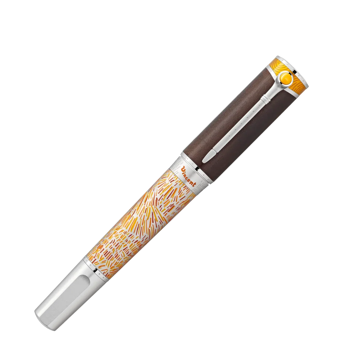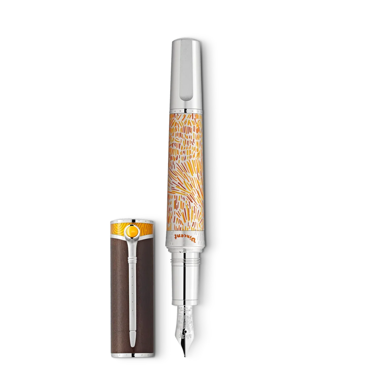 Med Montblanc Masters of Art Homage to Vincent van Gogh Limited Edition 4810 hyllar Montblanc Vincent van Gogh, en av de mest populära målarna i slutet av 1800-talet. Denna utgåva betonar särskilt hans tid i Arles med designdetaljer som återspeglar de provensalska vetefälten och en av hans mest kända målningar, ”Solrosor”. Årtalet 1888 som är ingraverat på pennkroppen – bredvid Vincents signatur i klar orange – minns året då han flyttade till Arles. Medan pennkroppen är dekorerad i gula och orange nyanser som återspeglar de soliga landskapen i södra Frankrike, har den berömda serien med fem solrosmålningar inspirerat tolkningen som är präglad på den handgjorda pennspetsen i Au 750 massivt guld med rodiumbeläggning. Van Gogh utvecklade en lösare, friare stil och blev lika skicklig med pensel som med palettkniv – som han använde för tjocka, impulsiva ”impasto”-verk. Hans palettkniv har inspirerat den platinabelagda klämman, medan hans svepande penseldrag har förevigats i den gula lacken på lockets ovansida. Dessutom har hans förkärlek för piprökning, som han refererade till i många av sina självporträtt, fångats i en subtil detalj på klämman: den övre delen är formad som ett piphuvud och fylld med gul ädelharts. Som en hyllning till Vincents fascination för traditionella japanska träsnitt är den övergripande formen inspirerad av en japansk träsnittskniv, medan locket är tillverkat av trä. Utgåvan kröns av ett Montblanc-emblem i gult ädelharts.