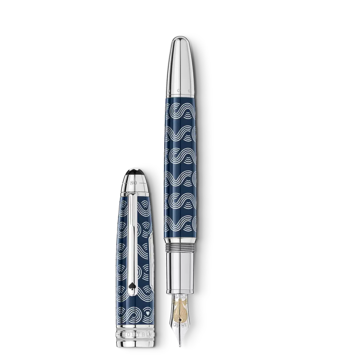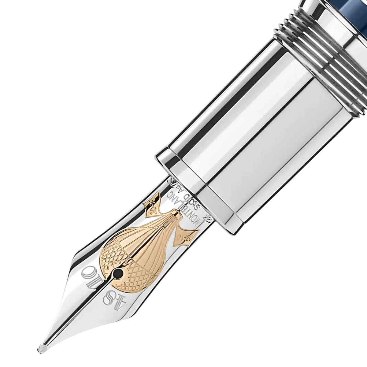 Meisterstück Around the World in 80 Days-kollektionen är inspirerad av Jules Vernes berömda äventyrsroman. Solitaire Le Grand-reservoarpennan i blå genomskinlig lack med gradientfinish är inspirerad av den första delen av resan. Huvudpersonen reser, främst med ångbåt, från London till Bombay, över Medelhavet och genom Suezkanalen. Kåpan och pennkroppen har ett fräst mönster som föreställer romanens viktigaste element: havsvågor, kortfärger och en kartusch med en lasergraverad ångbåt. Kåpans ovansida är präglad med resans längd, 18 dagar från London till Bombay och 80 dagar totalt. Skrivinstrumentet är avslutat med en handgjord Au750 tvåfärgad rhodium- och champagnetonad, guldbelagd spets prydd med en varmluftsballong och start- och slutdatum för den äventyrliga resan.