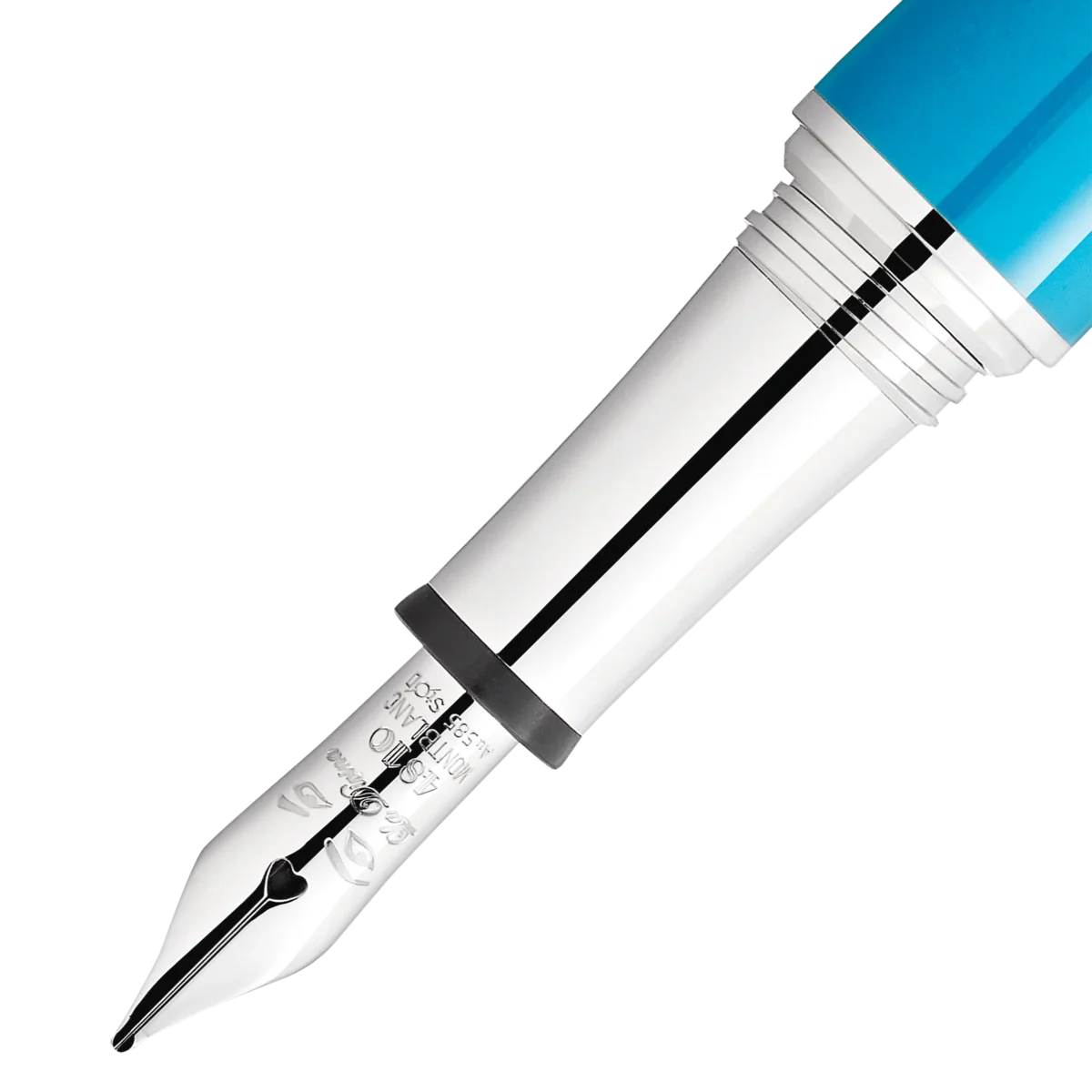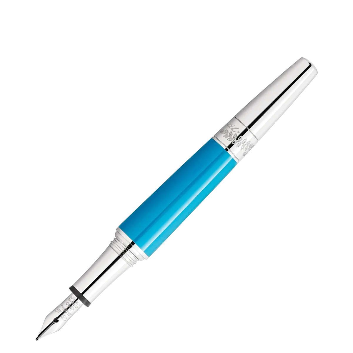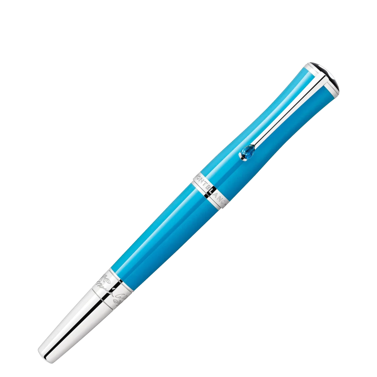 Montblanc Maria Callas Special Edition turkosfärgad är tillägnad en av 1900-talets mest karismatiska sopraner och uppskattade stilikoner. Med sin talang, passion och personlighet förkroppsligade hon ett visst ideal av operadivan. I några av världens största operahus, från La Scala i Milano till Parisoperan och New Yorks Metropolitan Opera, var hon känd som ”La Divina” – den gudomliga. Utgåvan lyfter fram en av hennes favoritfärger, turkos, i den dyrbara hartsen på locket och pennkroppen, samtidigt som den speglar Maria Callas graciösa skönhet i sin slanka, eleganta silhuett. Till minne av hennes havsomgärdade grekiska hemland är den platinabelagda klämman dekorerad med en syntetisk sten vars färg påminner om Egeiska havets strålande turkosblå färg. En kostymdetalj från en av hennes mest kända bel canto-roller, Bellinis ”Norma”, återspeglas i ett mönster av lagerblad som omger den platinabelagda konen på utgåvan tillsammans med den berömda sopranens präglade signatur. Den handgjorda pennspetsen i Au 585 massivt guld med rodiumbeläggning är präglad med de kohlkonturerade kattögon som var så typiska för hennes image, samt namnet som är oskiljaktigt från Maria Callas: ”La Divina”.